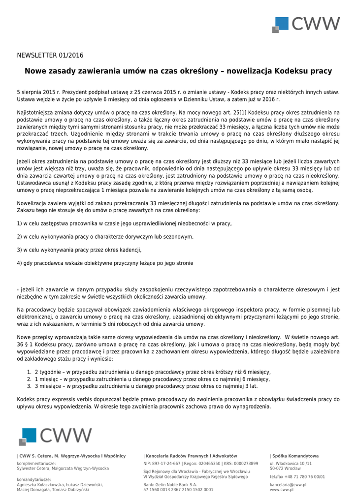 NEWSLETTER 01/2016 Nowe zasady zawierania umów na czas określony – nowelizacja Kodeksu pracy 5 sierpnia 2015 r. Prezydent podpisał ustawę z 25 czerwca 2015 r. o zmianie ustawy - Kodeks pracy oraz niektórych innych ustaw. Ustawa wejdzie w życie po upływie 6 miesięcy od dnia ogłoszenia w Dzienniku Ustaw, a zatem już w 2016 r. Najistotniejsza zmiana dotyczy umów o pracę na czas określony. Na mocy nowego art. 25[1] Kodeksu pracy okres zatrudnienia na podstawie umowy o pracę na czas określony, a także łączny okres zatrudnienia na podstawie umów o pracę na czas określony zawieranych między tymi samymi stronami stosunku pracy, nie może przekraczać 33 miesięcy, a łączna liczba tych umów nie może przekraczać trzech. Uzgodnienie między stronami w trakcie trwania umowy o pracę na czas określony dłuższego okresu wykonywania pracy na podstawie tej umowy uważa się za zawarcie, od dnia następującego po dniu, w którym miało nastąpić jej rozwiązanie, nowej umowy o pracę na czas określony. Jeżeli okres zatrudnienia na podstawie umowy o pracę na czas określony jest dłuższy niż 33 miesiące lub jeżeli liczba zawartych umów jest większa niż trzy, uważa się, że pracownik, odpowiednio od dnia następującego po upływie okresu 33 miesięcy lub od dnia zawarcia czwartej umowy o pracę na czas określony, jest zatrudniony na podstawie umowy o pracę na czas nieokreślony. Ustawodawca usunął z Kodeksu pracy zasadę zgodnie, z którą przerwa między rozwiązaniem poprzedniej a nawiązaniem kolejnej umowy o pracę nieprzekraczająca 1 miesiąca pozwala na zawieranie kolejnych umów na czas określony z tą samą osobą. Nowelizacja zawiera wyjątki od zakazu przekraczania 33 miesięcznej długości zatrudnienia na podstawie umów na czas określony. Zakazu tego nie stosuje się do umów o pracę zawartych na czas określony: 1) w celu zastępstwa pracownika w czasie jego usprawiedliwionej nieobecności w pracy, 2) w celu wykonywania pracy o charakterze dorywczym lub sezonowym, 3) w celu wykonywania pracy przez okres kadencji, 4) gdy pracodawca wskaże obiektywne przyczyny leżące po jego stronie - jeżeli ich zawarcie w danym przypadku służy zaspokojeniu rzeczywistego zapotrzebowania o charakterze okresowym i jest niezbędne w tym zakresie w świetle wszystkich okoliczności zawarcia umowy. Na pracodawcy będzie spoczywał obowiązek zawiadomienia właściwego okręgowego inspektora pracy, w formie pisemnej lub elektronicznej, o zawarciu umowy o pracę na czas określony, uzasadnionej obiektywnymi przyczynami leżącymi po jego stronie, wraz z ich wskazaniem, w terminie 5 dni roboczych od dnia zawarcia umowy. Nowe przepisy wprowadzają takie same okresy wypowiedzenia dla umów na czas określony i nieokreślony. W świetle nowego art. 36 § 1 Kodeksu pracy, zarówno umowa o pracę na czas określony, jak i umowa o pracę na czas nieokreślony, będą mogły być wypowiedziane przez pracodawcę i przez pracownika z zachowaniem okresu wypowiedzenia, którego długość będzie uzależniona od zakładowego stażu pracy i wyniesie: 1. 2 tygodnie – w przypadku zatrudnienia u danego pracodawcy przez okres krótszy niż 6 miesięcy, 2. 1 miesiąc – w przypadku zatrudnienia u danego pracodawcy przez okres co najmniej 6 miesięcy, 3. 3 miesiące – w przypadku zatrudnienia u danego pracodawcy przez okres co najmniej 3 lat. Kodeks pracy expressis verbis dopuszczał będzie prawo pracodawcy do zwolnienia pracownika z obowiązku świadczenia pracy do upływu okresu wypowiedzenia. W okresie tego zwolnienia pracownik zachowa prawo do wynagrodzenia. | CWW S. Cetera, M. Węgrzyn-Wysocka i Wspólnicy | Kancelaria Radców Prawnych i Adwokatów | Spółka Komandytowa komplementariusze: Sylwester Cetera, Małgorzata Węgrzyn-Wysocka NIP: 897-17-24-667 | Regon: 020465350 | KRS: 0000273899 ul. Włodkowica 10 /11 50-072 Wrocław komandytariusze: Agnieszka Kołaczkowska, Łukasz Dziewoński, Maciej Domagała, Tomasz Dobrzyński Sąd Rejonowy dla Wrocławia - Fabrycznej we Wrocławiu VI Wydział Gospodarczy Krajowego Rejestru Sądowego Bank: Getin Noble Bank S.A. 57 1560 0013 2367 2150 1502 0001 tel./fax +48 71 780 76 00/01 [email protected] www.cww.pl Przepisy przejściowe ustawy stanowią, że w zakresie wypowiedzenia, będzie ona miała zastosowanie do umów na czas określony, obowiązujących w dniu wejścia w życie nowelizacji, zawartych na czas dłuższy niż sześć miesięcy z możliwością wcześniejszego wypowiedzenia. W odniesieniu do zakazu zawierania więcej niż trzech umów o pracę na czas określony i nie przekraczania łączenie 33 miesięcy zatrudnienia w oparciu o umowy na czas określony (tzw. reguła 3/33) przepisy przejściowe przewidują stosowanie nowej ustawy do umów na czas określony obowiązujących w dniu wejścia w życie tej ustawy, z zastrzeżeniem, że okres obowiązywania trwających umów na czas określony liczony będzie od dnia wejścia w życie nowelizacji. Tym samym nowelizacja nie będzie skutkowała automatycznym przekształceniem umów zawartych na okres np. czterech lat, które w chwili wejścia w życie nowych przepisów trwały dłużej niż 33 miesiące, w umowy na czas nieokreślony. Autor: Joanna Blichert - radca prawny, CWW Kancelaria Prawnicza sp.k. Data: 2016-01-13 | CWW S. Cetera, M. Węgrzyn-Wysocka i Wspólnicy | Kancelaria Radców Prawnych i Adwokatów | Spółka Komandytowa komplementariusze: Sylwester Cetera, Małgorzata Węgrzyn-Wysocka NIP: 897-17-24-667 | Regon: 020465350 | KRS: 0000273899 ul. Włodkowica 10 /11 50-072 Wrocław komandytariusze: Agnieszka Kołaczkowska, Łukasz Dziewoński, Maciej Domagała, Tomasz Dobrzyński Sąd Rejonowy dla Wrocławia - Fabrycznej we Wrocławiu VI Wydział Gospodarczy Krajowego Rejestru Sądowego Bank: Getin Noble Bank S.A. 57 1560 0013 2367 2150 1502 0001 tel./fax +48 71 780 76 00/01 [email protected] www.cww.pl