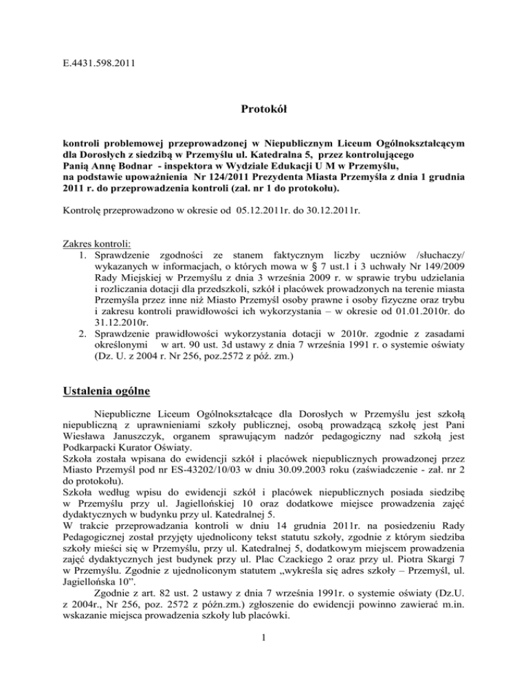 E.4431.598.2011 Protokół kontroli problemowej przeprowadzonej w Niepublicznym Liceum Ogólnokształcącym dla Dorosłych z siedzibą w Przemyślu ul. Katedralna 5, przez kontrolującego Panią Annę Bodnar - inspektora w Wydziale Edukacji U M w Przemyślu, na podstawie upoważnienia Nr 124/2011 Prezydenta Miasta Przemyśla z dnia 1 grudnia 2011 r. do przeprowadzenia kontroli (zał. nr 1 do protokołu). Kontrolę przeprowadzono w okresie od 05.12.2011r. do 30.12.2011r. Zakres kontroli: 1. Sprawdzenie zgodności ze stanem faktycznym liczby uczniów /słuchaczy/ wykazanych w informacjach, o których mowa w § 7 ust.1 i 3 uchwały Nr 149/2009 Rady Miejskiej w Przemyślu z dnia 3 września 2009 r. w sprawie trybu udzielania i rozliczania dotacji dla przedszkoli, szkół i placówek prowadzonych na terenie miasta Przemyśla przez inne niż Miasto Przemyśl osoby prawne i osoby fizyczne oraz trybu i zakresu kontroli prawidłowości ich wykorzystania – w okresie od 01.01.2010r. do 31.12.2010r. 2. Sprawdzenie prawidłowości wykorzystania dotacji w 2010r. zgodnie z zasadami określonymi w art. 90 ust. 3d ustawy z dnia 7 września 1991 r. o systemie oświaty (Dz. U. z 2004 r. Nr 256, poz.2572 z póź. zm.) Ustalenia ogólne Niepubliczne Liceum Ogólnokształcące dla Dorosłych w Przemyślu jest szkołą niepubliczną z uprawnieniami szkoły publicznej, osobą prowadzącą szkołę jest Pani Wiesława Januszczyk, organem sprawującym nadzór pedagogiczny nad szkołą jest Podkarpacki Kurator Oświaty. Szkoła została wpisana do ewidencji szkół i placówek niepublicznych prowadzonej przez Miasto Przemyśl pod nr ES-43202/10/03 w dniu 30.09.2003 roku (zaświadczenie - zał. nr 2 do protokołu). Szkoła według wpisu do ewidencji szkół i placówek niepublicznych posiada siedzibę w Przemyślu przy ul. Jagiellońskiej 10 oraz dodatkowe miejsce prowadzenia zajęć dydaktycznych w budynku przy ul. Katedralnej 5. W trakcie przeprowadzania kontroli w dniu 14 grudnia 2011r. na posiedzeniu Rady Pedagogicznej został przyjęty ujednolicony tekst statutu szkoły, zgodnie z którym siedziba szkoły mieści się w Przemyślu, przy ul. Katedralnej 5, dodatkowym miejscem prowadzenia zajęć dydaktycznych jest budynek przy ul. Plac Czackiego 2 oraz przy ul. Piotra Skargi 7 w Przemyślu. Zgodnie z ujednoliconym statutem „wykreśla się adres szkoły – Przemyśl, ul. Jagiellońska 10”. Zgodnie z art. 82 ust. 2 ustawy z dnia 7 września 1991r. o systemie oświaty (Dz.U. z 2004r., Nr 256, poz. 2572 z późn.zm.) zgłoszenie do ewidencji powinno zawierać m.in. wskazanie miejsca prowadzenia szkoły lub placówki. 1 W myśl ust. 5 w/w artykułu osoba prowadząca szkołę lub placówkę jest obowiązana zgłosić organowi prowadzącemu ewidencję szkół i placówek niepublicznych – w ciągu 14 dni zmiany w danych zawartych w zgłoszeniu, powstałe po wpisie do ewidencji. Ze względu na trwający remont budynku przy ul. Katedralnej 5, kontrolę przeprowadzono w budynku przy ul. Plac Czackiego 2 oraz przy ul. Piotra Skargi 7 w Przemyślu. Stwierdzono, że księgowość szkoły jest prowadzona w budynku przy ul. Plac Czackiego 2, ponadto w miejscu tym przechowywana jest dokumentacja finansowo-księgowa oraz podatkowa księga przychodów i rozchodów. Zgodnie z art. 11 ustawy z dnia 29 września 1994r. o rachunkowości (Dz.U. Nr 152, poz. 1223, z późn.zm.) księgi rachunkowe prowadzi się w siedzibie jednostki. Jednostki posiadające oddziały (zakłady) mogą prowadzić księgi rachunkowe w siedzibie jednostki albo oddziałów (zakładów). Księgi mogą być prowadzone poza siedzibą jednostki albo zakładu w przypadku powierzenia prowadzenia ksiąg podmiotowi prowadzącemu działalność w zakresie usługowego prowadzenia ksiąg rachunkowych. W myśl ust. 4 w/w artykułu ustawy o rachunkowości w przypadku nieprowadzenia ksiąg rachunkowych w siedzibie jednostki albo oddziału, kierownik jednostki obowiązany jest: 1) powiadomić właściwy urząd skarbowy o miejscu prowadzenia ksiąg w terminie 15 dni od dnia wydania ksiąg poza siedzibę jednostki albo oddziału, 2) zapewnić dostępność ksiąg rachunkowych do badania przez upoważnione organy kontroli zewnętrznej w siedzibie jednostki albo oddziału. Zgodnie z § 9 rozporządzenia Ministra Finansów z dnia 26 sierpnia 2003r. (Dz.U Nr 152, poz. 1475 z późn.zm.) podatnik jest obowiązany zbroszurować księgę i kolejno ponumerować jej karty. Księga oraz dowody, na których podstawie są dokonywane w niej zapisy, musi znajdować się na stałe w miejscu wykonywania działalności lub miejscu wskazanym przez podatnika jako jego siedziba. Wynajem pomieszczeń w celu prowadzenia działalności statutowej szkoły w 2010r. odbywał się na podstawie umowy najmu zawartej pomiędzy osobą prowadzącą szkołę Panią Wiesławą Januszczyk, a : 1) Przemyską Kapitułą Metropolitalną - w dniu 19.02.2009r., zawartą na czas nieoznaczony, której przedmiotem był wynajem pomieszczeń na cele dydaktyczne i biurowe w budynku przy ul. Katedralnej 5. Zgodnie z umową za korzystanie z przedmiotu najmu najemca zobowiązał się uiszczać czynsz w wysokości 3388zł miesięcznie (zał. nr 3 do protokołu). 2) Przemyską Agencją Rozwoju Regionalnego SA - w dniu 28.09.2007r., zawartą na czas nieokreślony, której przedmiotem był wynajem sali wykładowej, sali na cele administracyjno-biurowe oraz gabinet dyrektorski w budynku przy ul. Piotra Skargi 7 w Przemyślu, za korzystanie z przedmiotu najmu najemca zobowiązał się uiszczać czynsz wg stawki określonej w umowie (zał. nr 4 do protokołu). 3) Przemyską Agencją Rozwoju Regionalnego SA - w dniu 23.02.2009r., zawartą na czas nieokreślony, której przedmiotem był wynajem dwóch sal wykładowych/pracowni, za które najemca zobowiązał się płacić czynsz określony w aneksie do przedmiotowej umowy (zał. nr 5 do protokołu). 4) Archidiecezją Przemyską Obrządku Łacińskiego – w dniu 01.09.2010r