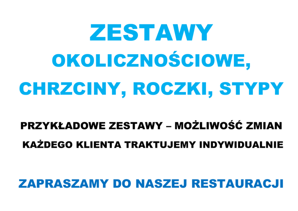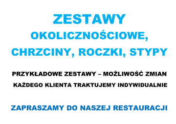 ZESTAWY OKOLICZNOŚCIOWE, CHRZCINY, ROCZKI, STYPY PRZYKŁADOWE ZESTAWY – MOŻLIWOŚĆ ZMIAN KAŻDEGO KLIENTA TRAKTUJEMY INDYWIDUALNIE ZAPRASZAMY DO NASZEJ RESTAURACJI ZESTAW OKOLICZNOŚCIOWY 60,00 zł od osoby sałatki (do wyboru 2 rodzaje) z ryżu, kurczaka i ananasa deser z makaronu tortelini, ogórka i groszku kawa lub herbata z makaronu ryżowego, kukurydzy i kurczaka wędzonego za dopłatą caprese (pomidory z mozarellą) ciasta, torty grecka z serem feta owoce sezonowe meksykańska (fasolka, kukurydza, papryka) mus z truskawek z rumem deser lodowy nicejska (z pstrągiem wędzonym) pieczywo (jasne i ciemne) + masło galaretka owocowa ptasie mleczko napoje (2 sztuki na osobę) - pepsi, mineralna, sok (z marżą) dodatkowe napoje – 1 litr (pepsi, mirinda, 7’up, itp.) - 4,10 zł piwo, szampan kolacja karczek w kapuście + sos czosnkowy lub polędwiczki wieprzowe w sosie pieczarkowym zapiekanka z piersi kurczaka z migdałami lub udko z kurczaka z papryka i oliwkami własne pstrąg smażony w ziołach ciasto owoce wódka zimna płyta hawajskie roladki z szynką placek po węgiersku lub placki ziemniaczane z sosem borowikowym sałatka jarzynowa lub z makaronu tortelini, ogórka i groszku frytki ziemniaki smażone z boczkiem lub cebulą i koperkiem gotowane warzywa (marchewka fasola, brokuła) karczek pieczony na zimno z sosem chrzanowym tatar z wołowiny galaretka z drobiu śledź po japońsku lub w oleju ślimaczki śledziowe lub śledź po wileńsku muszle makaronowe z sałatka (ser + pomidor) lub brzoskwinie z pastą serową BIRRERIA restauracja Rybnik - Chwałowice ul. 1 maja 104 tel./fax. 327393693 www.birreria.pl [email protected] ZESTAW OKOLICZNOŚCIOWY 80,00 zł od osoby drugie danie mięsa - 1,5 sztuki / osobę (do wyboru 5 rodzaji) rolada wieprzowa (z farszem krojonym) biała pieczeń wieprzowa ze śliwką kotlet schabowy kotlet schabowy z pieczarkami lub ananasem i serem filet z kurczaka z serem i szynką lub z brokułą i serem udka z kurczaka kotlet drobiowy z szynką włoska i suszonym pomidorem filet z indyka w skorupce parmezanowej dla jaroszy kotlet z sera pleśniowego ryba smażona (tilapia, dorsz, pstrąg) kapusty i surówki (do wyboru 4 rodzaje) kapusta czerwona gotowana surówka z kapusty białej surówka z kapusty pekińskiej buraczki czerwone surówka z marchwi bukiet z warzyw gotowanych z masłem dodatki ziemniaki gotowane (z wody lub puree) kluski śląskie (białe, czarne) sos z pieczeni deser kawa lub herbata za dopłatą ciasta, torty owoce sezonowe mus z truskawek z rumem deser lodowy galaretka owocowa ptasie mleczko napoje (2 sztuki na osobę) - pepsi, mineralna, sok (z marżą) dodatkowe napoje – 1 litr (pepsi, mirinda, 7’up, itp.) - 4,10 zł piwo, szampan własne ciasto owoce wódka kolacja karczek w kapuście + sos czosnkowy lub polędwiczki wieprzowe w sosie pieczarkowym zapiekanka z piersi kurczaka z migdałami lub udko z kurczaka z papryka i oliwkami pstrąg smażony w ziołach mięso z obiadu placek po węgiersku lub placki ziemniaczane z sosem borowikowym frytki + opiekane kluski ziemniaki smażone z boczkiem lub cebulą i koperkiem gotowane warzywa (marchewka fasola, brokuła) tatar z wołowiny galaretka z drobiu śledź po japońsku lub w oleju pieczywo (jasne i ciemne) + masło sałatki (do wyboru 2 rodzaje) sałatka jarzynowa z ryżu, kurczaka i ananasa z makaronu tortellini, patisonu i groszku z makaronu ryżowego, kukurydzy i kurczaka wędzonego caprese (pomidory z mozarellą) grecka z serem feta meksykańska (fasolka, kukurydza, papryka) nicejska (z pstrągiem wędzonym) BIRRERIA restauracja Rybnik - Chwałowice ul. 1 maja 104 tel./fax. 327393693 www.birreria.pl [email protected] ZESTAW OKOLICZNOŚCIOWY 100,00 zł od osoby zupa rosół z makaronem i podrobami lub żurek śląski z jajkiem drugie danie mięsa - 1,5 sztuki / osobę (do wyboru 5 rodzaji) rolada wieprzowa (z farszem krojonym) biała pieczeń wieprzowa ze śliwką kotlet schabowy kotlet schabowy z pieczarkami lub ananasem i serem filet z kurczaka z serem i szynką lub z brokułą i serem udka z kurczaka kotlet drobiowy z szynką włoska i suszonym pomidorem filet z indyka w skorupce parmezanowej dla jaroszy kotlet z sera pleśniowego ryba smażona (tilapia, dorsz, pstrąg) kapusty i surówki (do wyboru 4 rodzaje) kapusta czerwona gotowana surówka z kapusty białej surówka z kapusty pekińskiej buraczki czerwone surówka z marchwi bukiet z warzyw gotowanych z masłem dodatki ziemniaki gotowane (z wody lub puree) kluski śląskie (białe, czarne) sos z pieczeni deser kawa lub herbata za dopłatą ciasta, torty owoce sezonowe mus z truskawek z rumem deser lodowy galaretka owocowa ptasie mleczko napoje (2 sztuki na osobę) - pepsi, mineralna, sok (z marżą) dodatkowe napoje – 1 litr (pepsi, mirinda, 7’up, itp.) - 4,10 zł piwo, szampan własne ciasto owoce wódka zimna płyta hawajskie roladki z szynką karczek pieczony na zimno z sosem chrzanowym tatar z wołowiny galaretka z drobiu śledź po japońsku lub w oleju ślimaczki śledziowe lub śledź po wileńsku muszle makaronowe z sałatka (ser + pomidor) lub brzoskwinie z pastą serową sałatki (do wyboru 2 rodzaje) z ryżu, kurczaka i ananasa z makaronu tortelini, ogórka i groszku z makaronu ryżowego, kukurydzy i kurczaka wędzonego caprese (pomidory z mozarellą) grecka z serem feta meksykańska (fasolka, kukurydza, papryka) nicejska (z pstrągiem wędzonym) pieczywo (jasne i ciemne) + masło kolacja karczek w kapuście + sos czosnkowy lub polędwiczki wieprzowe w sosie pieczarkowym zapiekanka z piersi kurczaka z migdałami lub udko z kurczaka z papryka i oliwkami pstrąg smażony w ziołach mięso z obiadu placek po węgiersku lub placki ziemniaczane z sosem borowikowym spaghetti carbonara lub po bolońsku sałatka jarzynowa lub z makaronu tortelini, ogórka i groszku frytki + opiekane kluski ziemniaki smażone z boczkiem lub cebulą i koperkiem gotowane warzywa (marchewka fasola, brokuła) lub kalafior gotowany