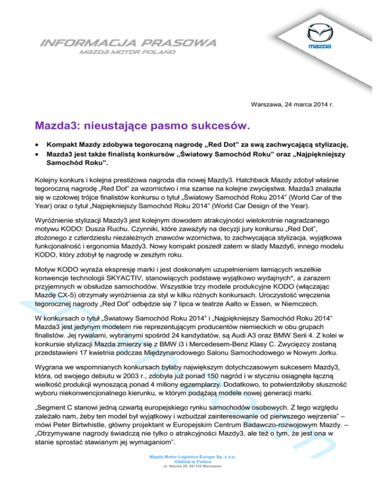 Warszawa, 24 marca 2014 r. Mazda3: nieustające pasmo sukcesów. Kompakt Mazdy zdobywa tegoroczną nagrodę „Red Dot” za swą zachwycającą stylizację, Mazda3 jest także finalistą konkursów „Światowy Samochód Roku” oraz „Najpiękniejszy Samochód Roku”. Kolejny konkurs i kolejna prestiżowa nagroda dla nowej Mazdy3. Hatchback Mazdy zdobył właśnie tegoroczną nagrodę „Red Dot” za wzornictwo i ma szanse na kolejne zwycięstwa. Mazda3 znalazła się w czołowej trójce finalistów konkursu o tytuł „Światowy Samochód Roku 2014” (World Car of the Year) oraz o tytuł „Najpiękniejszy Samochód Roku 2014” (World Car Design of the Year). Wyróżnienie stylizacji Mazdy3 jest kolejnym dowodem atrakcyjności wielokrotnie nagradzanego motywu KODO: Dusza Ruchu. Czynniki, które zaważyły na decyzji jury konkursu „Red Dot”, złożonego z czterdziestu niezależnych znawców wzornictwa, to zachwycająca stylizacja, wyjątkowa funkcjonalność i ergonomia Mazdy3. Nowy kompakt poszedł zatem w ślady Mazdy6, innego modelu KODO, który zdobył tę nagrodę w zeszłym roku. Motyw KODO wyraża ekspresję marki i jest doskonałym uzupełnieniem łamiących wszelkie konwencje technologii SKYACTIV, stanowiących podstawę wyjątkowo wydajnych*, a zarazem przyjemnych w obsłudze samochodów. Wszystkie trzy modele produkcyjne KODO (włączając Mazdę CX-5) otrzymały wyróżnienia za styl w kilku różnych konkursach. Uroczystość wręczenia tegorocznej nagrody „Red Dot” odbędzie się 7 lipca w teatrze Aalto w Essen, w Niemczech. W konkursach o tytuł „Światowy Samochód Roku 2014” i „Najpiękniejszy Samochód Roku 2014” Mazda3 jest jedynym modelem nie reprezentującym producentów niemieckich w obu grupach finalistów. Jej rywalami, wybranymi spośród 24 kandydatów, są Audi A3 oraz BMW Serii 4. Z kolei w konkursie stylizacji Mazda zmierzy się z BMW i3 i Mercedesem-Benz Klasy C. Zwycięzcy zostaną przedstawieni 17 kwietnia podczas Międzynarodowego Salonu Samochodowego w Nowym Jorku. Wygrana we wspomnianych konkursach byłaby największym dotychczasowym sukcesem Mazdy3, która, od swojego debiutu w 2003 r., zdobyła już ponad 150 nagród i w styczniu osiągnęła łączną wielkość produkcji wynoszącą ponad 4 miliony egzemplarzy. Dodatkowo, to potwierdziłoby słuszność wyboru niekonwencjonalnego kierunku, w którym podążają modele nowej generacji marki. „Segment C stanowi jedną czwartą europejskiego rynku samochodów osobowych. Z tego względu zależało nam, żeby ten model był wyjątkowy i wzbudzał zainteresowanie od pierwszego wejrzenia” – mówi Peter Birtwhistle, główny projektant w Europejskim Centrum Badawczo-rozwojowym Mazdy. – „Otrzymywane nagrody świadczą nie tylko o atrakcyjności Mazdy3, ale też o tym, że jest ona w stanie sprostać stawianym jej wymaganiom”. Mazda Motor Logistics Europe Sp. z o.o. Oddział w Polsce ul. Iłżecka 24, 02-135 Warszawa Konkurs o nagrodę „Red Dot” jest organizowany od 1955 r. przez niemieckie Centrum Wzornictwa w Nadrenii Północnej-Westfalii (Design Zentrum Nordrhein Westfalen) z Essen. Kategorie konkursowe to design produktu, wzornictwo koncepcyjne i projektowanie w komunikacji. W tegorocznej edycji jury oceniało 4 815 produktów aż 1 816 producentów, projektantów i architektów z 53 krajów. Nagrodzone produkty zostaną oznaczone symbolem czerwonej kropki, który jest postrzegany jako międzynarodowy certyfikat doskonałego designu. Dodatkowo, zwycięskie eksponaty będzie można podziwiać w Muzeum Red Dot Design, od 8 lipca do 3 sierpnia (oraz online na stronie www.red-dot.de/pd). * Poziomy zużycia paliwa i emisji CO2 rozpoczynają się od 3,9l/100km i 104g/km dla modelu Mazda3 w wersji sedan SKYACTIV-D 2.2 o mocy 150 KM, z 6-stopniową ręczną skrzynią biegów SKYACTIV-MT oraz systemem wyłączania sinika podczas postoju i-stop. ### Kontakt: Magdalena Węglewska tel. 606 600 260 e-mail: [email protected] strona prasowa: www.mazda-press.pl Mazda Motor Logistics Europe Sp. z o.o. Oddział w Polsce ul. Iłżecka 24, 02-135 Warszawa