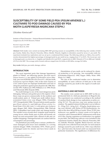 JOURNAL OF PLANT PROTECTION RESEARCH Vol. 50, No. 2 (2010) DOI: 10.2478/v10045-010-0033-1 SUSCEPTIBILITY OF SOME FIELD PEA (PISUM ARVENSE L.) CULTIVARS TO POD DAMAGE CAUSED BY PEA MOTH (LASPEYRESIA NIGRICANA STEPH.) Zdzisław Kaniuczak* Institute of Plant Protection – National Research Institute, Experimental Station in Rzeszów Langiewicza 28, 35-101 Rzeszów, Poland Received: August 20, 2009 Accepted: March 26, 2010 Abstract: Field studies were carried out during 2005–2007 growing seasons on susceptibility of the following nine varieties of field pea: Eureka, Hubal, Kos, Marych, Pomorska, Milwa, Sokolik, Winerek, Zagłoba to infestation caused by larvae of pea moth. The experiment included four replications and was set up in a randomised block design. The following cultivars as: Milwa, Kos and Pomorska demonstrated the highest percentage of damaged pods by pea moth larvae, ranging from 3.7 to 69.0%. The lowest per cent of damaged pods was shown by cv. Zagłoba and Sokolik (21.0 and 29.0%, respectively) in 2005, Winerek (3.7%) in 2006 and Sokolik (13.5%) in the 2007. The average yield of tested cultivars ranged from 16.0 dt/ha to 49.8 dt/ha, average 36.2 dt/ha. Key words: field pea, pea moth, damage, cultivar INTRODUCTION The most important pests that damage leguminous plants in Poland are following species: pea leaf weevil (Sitona lineatus L.), pea aphid [Acyrthosiphon pisum (Harris)], pea weevil (beetle) (Bruchus pisorum L. and pea moth (Laspeyresia nigricana Steph.). One of the main reasons of a low yield of peas are improper fertilization and lack of adequate protection against pests (Sypniewski 1986; Burnoville 1991; Nalborczyk 1993; Williams et al. 1995; Wnuk and Pobożniak 2002; Księżak 2004). Pea moth belongs to one of the most dangerous pests damaging field pea and garden pea in the regions where these crops are grown commercially. In the southern and south-eastern parts of Poland pea moth inflicts heavy economical losses every year (Kagan 1969a; Chodulska 1977; Niezgodziński 1986). The pest infests mainly garden pea (Pisum sativum L.) and field pea (Pisum arvense L.), broad bean (Vicia faba major L.) and green pea (Lathyrus spp.) (Kagan 1962, 1969a; Niezgodziński 1986; Walczak 2001). Caterpillars feed inside pods and damag kernels. The outside covers of pods show irregular spots made by young larvae whilst inside part of pods and kernels are bored out and surrounded with a thread of silk and caterpillar droppings. Damaged kernels are useless both for consumption and processing. On plantations pea moth poses a serious problem because damaged pods lower seed suitability as a sowing material (Kagan 1969b; Chodulska 1977). Plants grown of damaged seeds live shorter and have fewer seeds in pods. *Corresponding address: [email protected] Harmfulness of pea moth can be reduced by chemical protection or by growing less susceptible cultivars (Chodulska-Filipowicz 1992; Kagan 1969a; Wiatr 1999; Wiatr el al. 1989). The aim of the conducted studies was to determine susceptibility of some cultivars of field pea to the seed damage caused by pea moth in the region of south-eastern Poland. MATERIALS AND METHODS The studies were carried out in 2005–2007 on the experimental field of a field pea plantation in Boguchwała. The experiment was conducted according to the method of random block design in four replications on plots covering 16.5 m2. The previous crop were spring cereals in rotation. The applied mineral fertilization was as follows: N – 39 kg, P2O5 – 64 kg, K2O – 95 kg/ha. Seeds before sowing were dressed with Sarfun 65 DS (karbendazim, tiuram) at the dose 400 g/100 kg of seeds, Wisar 70 WG (metrybuzyn) was applied to control weeds at 0.4 kg/ha in a mixture with Command 480 EC (chlomazon) at the dose of 0.2 l/ha. During vegetation no fertilization was applied on pea field. The following cultivars were included in the experiment: Eureka, Hubal, Kos, Marych, Pomorska, Milwa, Sokolik, Winerek, Zagłoba. Before harvest, one hundred pods were collected from each plot for seed analysis damage caused by pea moth larvae. After crop collection by a plot harvester, the kernel yield was measured from particular treatments. The significance of differences be- 198 Journal of Plant Protection Research 50 (2), 2010 tween seed damage (in %) caused by pea moth and the seed yield of tested cultivars were estimated by Tukey’s test at the level of significance 5%. RESULTS AND DISCUSSION In the 2005 and 2007 growing seasons, weather conditions were favorable for the development of the pest. While in 2006 cool and rainy weather from the middle of May until the first week or so of June disturbed the flight of pea moth adults and the process of egg lying. In consequence the pod damage was relatively low at the end of the season (Table 1). Fig. 1. Average decade air temperature and total amount of rainfall in the months: April–July 2005–2007 The level of pod damage by pea moth caterpillars varied from 21.0 to 69.0% in the 2005 experiment. The highest damagee was observed for cv. Milwa with 69.0% of damaged pods. The least injuries were found in the pods of the cv. Zagłoba (21.0%) (Table 1). In 2006 symptoms of feeding of pea moth larvae on the tested field pea cultivars were lower and more diverse. The pod damage ranged from 3.7 to 13.5%. The lowest per cent of damaged pods was found for the cv. Winerek (3.7% of damaged pods). A high per cent of damage was noted on the cultivars: Milwa and Sokolik – 13.5% and 13.2% respectively (Table 1). In 2007 pods of all studied cultivars were damaged to a significantly higher per cent in comparison with the pre- vious year. The highest pod damage was noted for the cv. Pomorska, which amounted to 40.2%. A high per cent of damaged pods was noted for the cvs Kos (38.7% of damaged pods) and Milwa (36.2%). The cv. Sokolik (13.5%) was found to have the lowest pod damage (Table 1). The data presented in table 1 demonstrate consistency in relative ranking