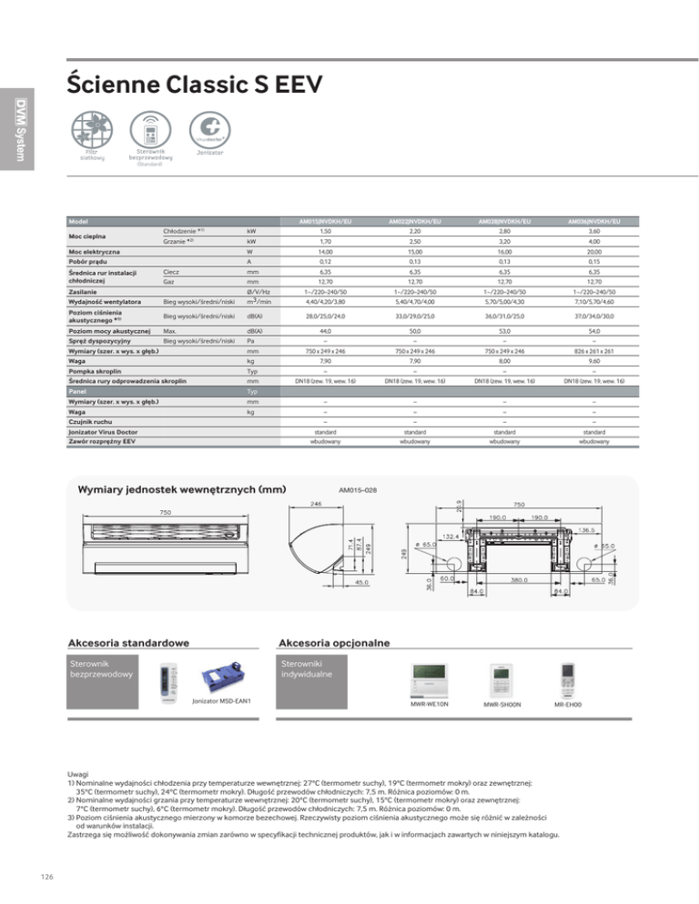 Ścienne Classic S EEV siatkowy (Standard) Model Moc cieplna AM015JNVDKH/EU AM022JNVDKH/EU AM028JNVDKH/EU AM036JNVDKH/EU Chłodzenie *1) kW 1,50 2,20 2,80 3,60 Grzanie *2) kW 1,70 2,50 3,20 4,00 W 14,00 15,00 16,00 20,00 0,15 Moc elektryczna Pobór prądu Średnica rur instalacji chłodniczej A 0,12 0,13 0,13 Ciecz mm 6,35 6,35 6,35 6,35 Gaz mm 12,70 12,70 12,70 12,70 Ø/V/Hz m3/min 1~/220–240/50 1~/220–240/50 1~/220–240/50 1~/220–240/50 Bieg wysoki/średni/niski 4,40/4,20/3,80 5,40/4,70/4,00 5,70/5,00/4,30 7,10/5,70/4,60 Zasilanie Wydajność wentylatora Poziom ciśnienia akustycznego *1) Bieg wysoki/średni/niski dB(A) 28,0/25,0/24,0 33,0/29,0/25,0 36,0/31,0/25,0 37,0/34,0/30,0 Poziom mocy akustycznej Max. dB(A) 44,0 50,0 53,0 54,0 Spręż dyspozycyjny Bieg wysoki/średni/niski Pa – – – – 750 x 249 x 246 750 x 249 x 246 750 x 249 x 246 826 x 261 x 261 9,60 Wymiary (szer. x wys. x głęb.) mm Waga kg 7,90 7,90 8,00 Pompka skroplin Typ – – – – Średnica rury odprowadzenia skroplin mm DN18 (zew. 19, wew. 16) DN18 (zew. 19, wew. 16) DN18 (zew. 19, wew. 16) DN18 (zew. 19, wew. 16) Panel Typ Wymiary (szer. x wys. x głęb.) mm – – – – Waga kg – – – – – – – – standard wbudowany standard wbudowany standard wbudowany standard wbudowany Czujnik ruchu Jonizator Virus Doctor Zawór rozprężny EEV Wymiary jednostek wewnętrznych (mm) AM015–028 Akcesoria standardowe Akcesoria opcjonalne Sterownik bezprzewodowy Sterowniki indywidualne Jonizator MSD-EAN1 MWR-WE10N MWR-SH00N MR-EH00 Uwagi 1) Nominalne wydajności chłodzenia przy temperaturze wewnętrznej: 27°C (termometr suchy), 19°C (termometr mokry) oraz zewnętrznej: 35°C (termometr suchy), 24°C (termometr mokry). Długość przewodów chłodniczych: 7,5 m. Różnica poziomów: 0 m. 2) Nominalne wydajności grzania przy temperaturze wewnętrznej: 20°C (termometr suchy), 15°C (termometr mokry) oraz zewnętrznej: 7°C (termometr suchy), 6°C (termometr mokry). Długość przewodów chłodniczych: 7,5 m. Różnica poziomów: 0 m. 3) Poziom ciśnienia akustycznego mierzony w komorze bezechowej. Rzeczywisty poziom ciśnienia akustycznego może się różnić w zależności od warunków instalacji. Zastrzega się możliwość dokonywania zmian zarówno w specyfikacji technicznej produktów, jak i w informacjach zawartych w niniejszym katalogu. 126 Model Moc cieplna AM045JNVDKH/EU AM056JNVDKH/EU AM071JNVDKH/EU AM082JNVDKH/EU Chłodzenie *1) kW 4,50 5,60 7,10 8,20 Grzanie *2) kW 5,00 6,30 8,00 8,50 W 31,00 27,00 41,00 55,00 0,42 Moc elektryczna Pobór prądu Średnica rur instalacji chłodniczej A 0,24 0,21 0,31 Ciecz mm 6,35 6,35 9,52 9,52 Gaz mm 12,70 12,70 15,88 15,88 Ø/V/Hz m3/min 1~/220–240/50 1~/220–240/50 1~/220–240/50 1~/220–240/50 Bieg wysoki/średni/niski 8,90/7,50/6,00 11,80/10,00/8,20 14,80/12,40/10,00 16,70/14,30/12,40 Zasilanie Wydajność wentylatora Poziom ciśnienia akustycznego *1) Bieg wysoki/średni/niski dB(A) 41,0/38,0/34,0 39,0/36,0/33,0 44,0/41,0/36,0 47,0/43,0/40,0 Poziom mocy akustycznej Max. dB(A) 57,0 57,0 61,0 65,0 Spręż dyspozycyjny Bieg wysoki/średni/niski Pa – – – – 826 x 261 x 261 1065 x 301 x 294 1065 x 301 x 294 1065 x 301 x 294 14,50 mm Waga kg 9,60 14,50 14,50 Pompka skroplin Typ – – – – Średnica rury odprowadzenia skroplin mm DN18 (zew. 19, wew. 16) DN18 (zew. 19, wew. 16) DN18 (zew. 19, wew. 16) DN18 (zew. 19, wew. 16) Panel Typ Wymiary (szer. x wys. x głęb.) mm – – – – Waga kg – – – – – – – – standard wbudowany standard wbudowany standard wbudowany standard wbudowany Czujnik ruchu Jonizator Virus Doctor Zawór rozprężny EEV Jednostki wewnętrzne Wymiary (szer. x wys. x głęb.) Wymiary jednostek wewnętrznych (mm) M036–045 AM056–082 Uwagi 1) Nominalne wydajności chłodzenia przy temperaturze wewnętrznej: 27°C (termometr suchy), 19°C (termometr mokry) oraz zewnętrznej: 35°C (termometr suchy), 24°C (termometr mokry). Długość przewodów chłodniczych: 7,5 m. Różnica poziomów: 0 m. 2) Nominalne wydajności grzania przy temperaturze wewnętrznej: 20°C (termometr suchy), 15°C (termometr mokry) oraz zewnętrznej: 7°C (termometr suchy), 6°C (termometr mokry). Długość przewodów chłodniczych: 7,5 m. Różnica poziomów: 0 m. 3) Poziom ciśnienia akustycznego mierzony w komorze bezechowej. Rzeczywisty poziom ciśnienia akustycznego może się różnić w zależności od warunków instalacji. Zastrzega się możliwość dokonywania zmian zarówno w specyfikacji technicznej produktów, jak i w informacjach zawartych w niniejszym katalogu. Systemy klimatyzacji SAMSUNG 2015 127