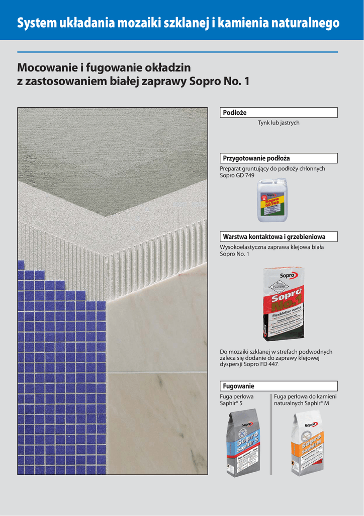 1.1 Zaprawy klejowe cienkowarstwowe System układania mozaiki szklanej i kamienia naturalnego Mocowanie i fugowanie okładzin z zastosowaniem białej zaprawy Sopro No. 1 Podłoże Tynk lub jastrych Przygotowanie podłoża Preparat gruntujący do podłoży chłonnych Sopro GD 749 Warstwa kontaktowa i grzebieniowa Wysokoelastyczna zaprawa klejowa biała Sopro No. 1 Do mozaiki szklanej w strefach podwodnych zaleca się dodanie do zaprawy klejowej dyspersji Sopro FD 447. Fugowanie Fuga perłowa Saphir® 5 Fuga perłowa do kamieni naturalnych Saphir® M