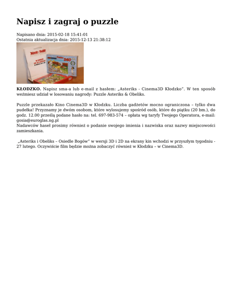 Napisz i zagraj o puzzle Napisano dnia: 2015-02-18 15:41:01 Ostatnia aktualizacja dnia: 2015-12-13 21:38:12 KŁODZKO. Napisz sma-a lub e-mail z hasłem: „Asteriks - Cinema3D Kłodzko”. W ten sposób weźmiesz udział w losowaniu nagrody: Puzzle Asteriks & Obeliks. Puzzle przekazało Kino Cinema3D w Kłodzku. Liczba gadżetów mocno ograniczona – tylko dwa pudełka! Przyznamy je dwóm osobom, które wylosujemy spośród osób, które do piątku (20 bm.), do godz. 12.00 prześlą podane hasło na: tel. 697-983-574 – opłata wg taryfy Twojego Operatora, e-mail: [email protected] Nadawców haseł prosimy również o podanie swojego imienia i nazwiska oraz nazwy miejscowości zamieszkania. „Asteriks i Obeliks – Osiedle Bogów” w wersji 3D i 2D na ekrany kin wchodzi w przyszłym tygodniu 27 lutego. Oczywiście film będzie można zobaczyć również w Kłodzku – w Cinema3D.