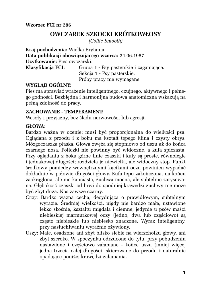 Wzorzec FCI nr 296 OWCZAREK SZKOCKI KRÓTKOWŁOSY (Collie Smooth) Kraj pochodzenia: Wielka Brytania Data publikacji obowiązującego wzorca: 24.06.1987 Użytkowanie: Pies owczarski. Klasyfikacja FCI: Grupa 1 - Psy pasterskie i zaganiające. Sekcja 1 - Psy pasterskie. Próby pracy nie wymagane. WYGLĄD OGÓLNY: Pies ma sprawiać wrażenie inteligentnego, czujnego, aktywnego i pełnego godności. Bezbłędna i harmonijna budowa anatomiczna wskazują na pełną zdolność do pracy. ZACHOWANIE - TEMPERAMENT: Wesoły i przyjazny, bez śladu nerwowości lub agresji. GŁOWA: Bardzo ważna w ocenie; musi być proporcjonalna do wielkości psa. Oglądana z przodu i z boku ma kształt tępego klina i czysty obrys. Mózgoczaszka płaska. Głowa zwęża się stopniowo od uszu aż do końca czarnego nosa. Policzki nie powinny być widoczne, a kufa spiczasta. Przy oglądaniu z boku górne linie czaszki i kufy są proste, równoległe i jednakowej długości; rozdziela je niewielki, ale widoczny stop. Punkt środkowy pomiędzy wewnętrznymi kącikami oczu powinien wypadać dokładnie w połowie długości głowy. Kufa tępo zakończona, na końcu zaokrąglona, ale nie kanciasta, żuchwa mocna, ale subtelnie zarysowana. Głębokość czaszki od brwi do spodniej krawędzi żuchwy nie może być zbyt duża. Nos zawsze czarny. Oczy: Bardzo ważna cecha, decydująca o prawidłowym, subtelnym wyrazie. Średniej wielkości, nigdy nie bardzo małe, ustawione lekko skośnie, kształtu migdała i ciemne, jedynie u psów maści niebieskiej marmurkowej oczy (jedno, dwa lub częściowo) są często niebieskie lub niebiesko znaczone. Wyraz inteligentny, przy nasłuchiwaniu wyraźnie ożywiony. Uszy: Małe, osadzone ani zbyt blisko siebie na wierzchołku głowy, ani zbyt szeroko. W spoczynku odrzucone do tyłu, przy pobudzeniu nastawione i częściowo załamane - końce uszu (mniej więcej jedna trzecia całej długości) skierowane do przodu i naturalnie opadające poniżej krawędzi załamania. 1 Uzębienie: Zęby duże, szczęki mocne, zgryz nożycowy z pełnym kontaktem wszystkich siekaczy. SZYJA: Umięśniona, mocna, dobrej długości, wyraźnie łukowato wysklepiona. KOŃCZYNY PRZEDNIE: Łopatka ustawiona skośnie, tworzy dobry kąt z ramieniem. Przedramię proste i dobrze umięśnione, łokcie przylegające, nie wykręcone na zewnątrz ani do wewnątrz, kościec umiarkowanie mocny. Przedramię masywne, śródręcze elastyczne, ale mocne. TUŁÓW: Długość nieco większa od wysokości w kłębie, grzbiet mocny, lędźwie lekko wysklepione, żebra dobrze wysklepione, klatka piersiowa głęboka, dość szeroka za łopatkami. KOŃCZYNY TYLNE: Uda dobrze umięśnione, niższe partie kończyn suche, z wyraźnymi ścięgnami. Stawy kolanowe dobrze kątowane, stawy skokowe niskie, mocne. ŁAPY: Owalne, z mocnymi opuszkami. Palce zwarte i wysklepione. Tylne łapy trochę mniej wysklepione od przednich. OGON: Długi, zakończeniem kostnym sięga przynajmniej stawu skokowego. W spokoju noszony nisko, z końcem lekko zawiniętym do góry. Przy pobudzeniu może być wzniesiony, ale nigdy powyżej grzbietu. CHODY: Bardzo charakterystyczny. Dobrze zbudowany pies nigdy nie ma luźnych łokci, ale przednie łapy są w ruchu wyraźnie zbieżne. Wysokie podnoszenie przednich kończyn, krzyżowanie lub tocząca akcja przodu są w najwyższym stopniu niepożądane. Akcja tyłu swobodna, dynamiczna, dająca mocny napęd, śródstopia, oglądane z tyłu, poruszają się równolegle i niezbyt wąsko. Pożądany dość długi wykrok, a ruch powinien być lekki i nie zdradzać wysiłku. OKRYWA WŁOSOWA: Sierść: Krótka, gładka, o twardym włosie okrywowym i bardzo gęstym podszerstku. Nie wolno jej strzyc ani trymować. Maść: Uznane są trzy umaszczenia: śniade z białym, trójbarwne (trikolor) i niebieskie marmurkowe (blue merle). 2 Śniade: Rozmaite odcienie od jasnozłotego do mahoniowego, także z czarnym nalotem. Barwa kremowa i jasnosłomkowa w najwyższym stopniu niepożądane. Trójbarwne: Czarne z intensywnym podpalaniem na głowie i nogach. Rdzawy nalot na czerni w najwyższym stopniu niepożądany. Niebieskie marmurkowe: Tło srebrzysto-niebieskie, w czystym odcieniu, na nim czarne plamki i łatki. Pożądane intensywne podpalanie, ale jego brak nie stanowi wady. Rozległe czarne łaty, szare tło czy rdzawe naloty na włosie okrywowym lub podszerstku w najwyższym stopniu niepożądane. Białe znaczenia: Przy każdym z tych umaszczeń powinny występować mniej lub bardziej rozległe białe znaczenia. Szczególnie pożądane są: pełny lub częściowy biały kołnierz, skarpetki i biały koniec ogona. Na głowie występować może biała strzałka różnej długości. Maść całkowicie lub w znacznym stopniu biała wysoce niepożądana. WZROST: Wysokość w kłębie 56-61 cm dla psa, 51-56 cm dla suki. Waga psa od 20,5 do 29,5 kg, suki od 18 do 25 kg. WADY: Wszystkie odstępstwa od tego, co podano powyżej, powinny być traktowane jako wady, powodujące odpowiednie obniżenie oceny. UWAGA: Samce muszą mieć dwa, prawidłowo wykształcone jądra, całkowicie umieszczone w worku mosznowym. 3