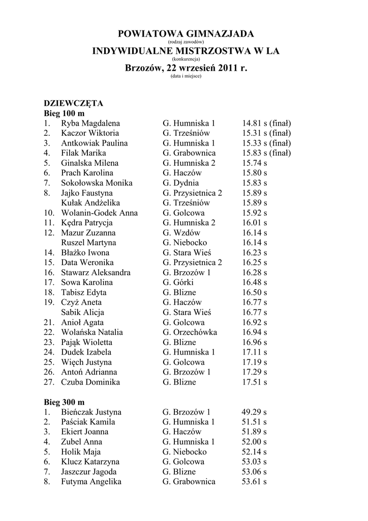 POWIATOWA GIMNAZJADA (rodzaj zawodów) INDYWIDUALNE MISTRZOSTWA W LA (konkurencja) Brzozów, 22 wrzesień 2011 r. (data i miejsce) DZIEWCZĘTA Bieg 100 m 1. Ryba Magdalena 2. Kaczor Wiktoria 3. Antkowiak Paulina 4. Filak Marika 5. Ginalska Milena 6. Prach Karolina 7. Sokołowska Monika 8. Jajko Faustyna Kułak Andżelika 10. Wolanin-Godek Anna 11. Kędra Patrycja 12. Mazur Zuzanna Ruszel Martyna 14. Błażko Iwona 15. Data Weronika 16. Stawarz Aleksandra 17. Sowa Karolina 18. Tabisz Edyta 19. Czyż Aneta Sabik Alicja 21. Anioł Agata 22. Wolańska Natalia 23. Pająk Wioletta 24. Dudek Izabela 25. Więch Justyna 26. Antoń Adrianna 27. Czuba Dominika G. Humniska 1 G. Trześniów G. Humniska 1 G. Grabownica G. Humniska 2 G. Haczów G. Dydnia G. Przysietnica 2 G. Trześniów G. Golcowa G. Humniska 2 G. Wzdów G. Niebocko G. Stara Wieś G. Przysietnica 2 G. Brzozów 1 G. Górki G. Blizne G. Haczów G. Stara Wieś G. Golcowa G. Orzechówka G. Blizne G. Humniska 1 G. Golcowa G. Brzozów 1 G. Blizne 14.81 s (finał) 15.31 s (finał) 15.33 s (finał) 15.83 s (finał) 15.74 s 15.80 s 15.83 s 15.89 s 15.89 s 15.92 s 16.01 s 16.14 s 16.14 s 16.23 s 16.25 s 16.28 s 16.48 s 16.50 s 16.77 s 16.77 s 16.92 s 16.94 s 16.96 s 17.11 s 17.19 s 17.29 s 17.51 s Bieg 300 m 1. Bieńczak Justyna 2. Paściak Kamila 3. Ekiert Joanna 4. Zubel Anna 5. Holik Maja 6. Klucz Katarzyna 7. Jaszczur Jagoda 8. Futyma Angelika G. Brzozów 1 G. Humniska 1 G. Haczów G. Humniska 1 G. Niebocko G. Golcowa G. Blizne G. Grabownica 49.29 s 51.51 s 51.89 s 52.00 s 52.14 s 53.03 s 53.06 s 53.61 s 9. 10. 11. 12. 13. 14. 15. 16. 17. 18. 19. 20. 21. Bielawska Anna Hunia Aneta Wielobób Patrycja Borkowska Karolina Muszańska Katarzyna Bluj Emilia Grządziel Kamila Kaliniecka Patrycja Szjnowska Gabriela Łukaszewska Aleksandra Jaszczur Dominika Pięciak Natalia Mikuła Natalia G. Stara Wieś G. Blizne G. Haczów G. Humniska 2 G. Golcowa G. Dydnia G. Stara Wieś G. Końskie G. Dydnia G. Górki G. Blizne G. Górki G. Golcowa 54.06 s 54.13 s 54.61 s 56.02 s 57.96 s 58.20 s 58.21 s 58.49 s 58.50 s 58.56 s 1.01.41 1.01.76 1.08.36 Bieg 600 m 1. Krowiak Karolina 2. Drożdżal Patrycja 3. Piegdoń Dominika 4. Sawicka Edyta 5. Szmyd Karolina 6. Irzyk Barbara 7. Karwat Maria 8. Kosmala Patrycja 9. Herbut Ewa 10. Dydek Aleksandra 11. Pocałuń Ewa 12. Nowak Natalia 13. Biedka Sabina 14. Czebieniak Estera 15. Rębisz Justyna 16. Rymarowicz Zuzanna 17. Skiba Marzena 18. Walczak Izabela Indyk Patrycja Pietryka Paulina Wania Jolanta G. Humniska 1 G. Izdebki G. Końskie G. Humniska 2 G. Haczów G. Niebocko G. Haczów G. Przysietnica 2 G. Golcowa G. Brzozów 1 G. Dydnia G. Brzozów 1 G. Blizne G. Dydnia G. Brzozów 1 G. Blizne G. Golcowa G. Golcowa G. Niebocko G. Przysietnica 2 G. Przysietnica 2 1.54.34 1.56.69 1.58.37 2.04.07 2.05.02 2.06.66 2.07.53 2.09.14 2.10.32 2.11.02 2.11.68 2.12.25 2.15.69 2.16.78 2.17.38 2.22.31 2.27.84 2.31.31 - Skok w dal 1. Koszela Kinga 2. Pilszak Klaudia 3. Florczak Dominika Bania Sara 4. Jakielarz Klaudia 5. Sadowska Natalia 6. Szmyd Emilia 7. Więcek Justyna G. Humniska 2 G. Humniska 2 G. Humniska 1 G. Haczów G. Brzozów 1 G. Brzozów 1 G. Haczów G. Golcowa 3.93 m 3.92 m 3.88 m 3.88 m 3.84 m 3.80 m 3.69 m 3.60 m 8. 9. 10. 11. 12. 13. 14. 15. 16. Rapa Katarzyna Futyma Angelika Krupska Monika Lewicka Kinga Lipińska Sabina Bargieł Aleksandra Radoń Dominika Wojtowicz Katarzyna Jajko Zuzanna G. Haczów G. Górki G. Brzozów 1 G. Niebocko G. Orzechówka G. Stara Wieś G. Humniska 2 G. Stara Wieś G. Przysietnica 2 3.54 m 3.38 m 3.38 m 3.38 m 3.36 m 3.20 m 3.01 m 2.95 m 2.95 m Pchnięcie kulą 1. Podczaszy Natalia 2. Piątek Karolina 3. Słota Gabriela 4. Szpak Aleksandra 5. Fuksa Diana 6. Czapor Kinga 7. Krzysik Paulina 8. Jagielska Paulina 9. Pantoł Patrycja 10. Wania Sylwia 11. Sabik Monika 12. Masłyk Diana 13. Myćka Izabela 14. Bąk Karolina G. Niebocko G. Blizne G. Humniska 1 G. Brzozów 1 G. Humniska 1 G. Haczów G. Niebocko G. Orzechówka G. Brzozów 1 G. Przysietnica 2 G. Stara Wieś G. Orzechówka G. Górki G. Golcowa 8.15 m 8.09 m 8.05 m 7.98 m 7.84 m 7.82 m 7.53 m 7.34 m 7.04 m 6.60 m 6.47 m 6.19 m nie sklasyfikowana nie sklasyfikowana Rzut dyskiem 1. Sąsiadek Klaudia 2. Kułak Aleksandra 3. Radoń Gabriela 4. Kwiatkowska Aneta 5. Stabryła Diana 6. Wojtas Aneta 7. Kraczkowska Katarzyna G. Niebocko G. Dydnia G. Humniska 2 G. Niebocko G. Niebocko G. Humniska 2 G. Dydnia 19.70 m 18.60 m 18.50 m 18.00 m 16.70 m 15.30 m 15.00 m Rzut oszczepem 1. Nowak Maria 2. Biedka Dominika 3. Pelczarska Arletta 4. Kraczkowska Diana 5. Fejdasz Anna 6. Wójcik Monika 7. Zgłobicka Jolanta Krupa Justyna G. Brzozów 1 G. Blizne G. Brzozów 1 G. Dydnia G. Niebocko G. Dydnia G. Turze Pole G. Golcowa 20.00 m 19.00 m 17.60 m 17.00 m 15.70 m 13.50 m 11.00 m nie sklasyfikowana Sztafeta 4 x 100 m 1. Gimnazjum Humniska 2 2. Gimnazjum Haczów 3. Gimnazjum Humniska 1 4. Gimnazjum Golcowa 5. Gimnazjum Brzozów 1 6. Gimnazjum Przysietnica 2 7. Gimnazjum Blizne 8. Gimnazjum Orzechówka 9. Gimnazjum Dydnia 1.00.59 1.00.89 1.00.96 1.02.70 1.04.58 1.05.05 1.05.19 1.06.84 1.12.61 CHŁOPCY Bieg 100 m 1. Prajsnar Piotr 2. Harbut Lucjan 3. Kędra Dawid 4. Cyparski Jakub 5. Chorążak Konrad 6. Rakoczy Bartłomiej 7. Gotfryd Gabriel 8. Herbut Marek 9. Śnieżek Radosław 10. Pinda Dominik 11. Czopor Daniel Ruchlewicz Bartosz 13. Herbut Piotr 14. Cesarz Michał 15. Sokołowski Piotr 16. Romanik Piotr 17. Wiech Paweł 18. Piątek Artur 19. Gładysz Paweł 20. Ruchlewicz Krystian 21. Jantosz Damian 22. Krynicki Przemysław 23. Drabek Jan 24. Gębuś Michał 25. Froń Mateusz 26. Knurek Aleksander 27. Bogacki Karol G. Blizne G. Golcowa G. Humniska 1 G. Brzozów 1 G. Dydnia G. Dydnia G. Barycz G. Stara Wieś G. Orzechówka G. Przysietnica 2 G. Niebocko G. Humniska 1 G. Golcowa G. Haczów G. Dydnia G. Brzozów 1 G. Górki G. Blizne G. Izdebki G. Górki G. Stara Wieś G. Turze Pole G. Golcowa G. Trześniów G. Haczów G. Grabownica G. Grabownica 12.80 s (fina