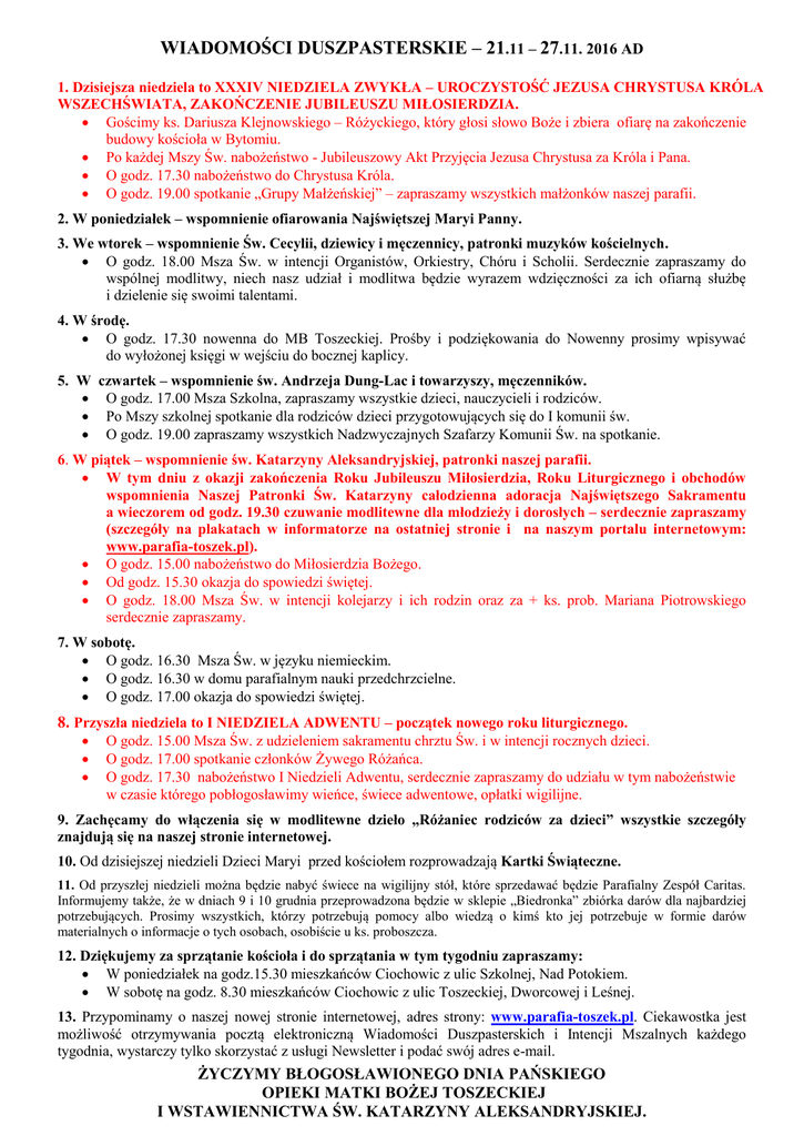 WIADOMOŚCI DUSZPASTERSKIE – 21.11 – 27.11. 2016 AD 1. Dzisiejsza niedziela to XXXIV NIEDZIELA ZWYKŁA – UROCZYSTOŚĆ JEZUSA CHRYSTUSA KRÓLA WSZECHŚWIATA, ZAKOŃCZENIE JUBILEUSZU MIŁOSIERDZIA. Gościmy ks. Dariusza Klejnowskiego – Różyckiego, który głosi słowo Boże i zbiera ofiarę na zakończenie budowy kościoła w Bytomiu. Po każdej Mszy Św. nabożeństwo - Jubileuszowy Akt Przyjęcia Jezusa Chrystusa za Króla i Pana. O godz. 17.30 nabożeństwo do Chrystusa Króla. O godz. 19.00 spotkanie „Grupy Małżeńskiej” – zapraszamy wszystkich małżonków naszej parafii. 2. W poniedziałek – wspomnienie ofiarowania Najświętszej Maryi Panny. 3. We wtorek – wspomnienie Św. Cecylii, dziewicy i męczennicy, patronki muzyków kościelnych. O godz. 18.00 Msza Św. w intencji Organistów, Orkiestry, Chóru i Scholii. Serdecznie zapraszamy do wspólnej modlitwy, niech nasz udział i modlitwa będzie wyrazem wdzięczności za ich ofiarną służbę i dzielenie się swoimi talentami. 4. W środę. O godz. 17.30 nowenna do MB Toszeckiej. Prośby i podziękowania do Nowenny prosimy wpisywać do wyłożonej księgi w wejściu do bocznej kaplicy. 5. W czwartek – wspomnienie św. Andrzeja Dung-Lac i towarzyszy, męczenników. O godz. 17.00 Msza Szkolna, zapraszamy wszystkie dzieci, nauczycieli i rodziców. Po Mszy szkolnej spotkanie dla rodziców dzieci przygotowujących się do I komunii św. O godz. 19.00 zapraszamy wszystkich Nadzwyczajnych Szafarzy Komunii Św. na spotkanie. 6. W piątek – wspomnienie św. Katarzyny Aleksandryjskiej, patronki naszej parafii. W tym dniu z okazji zakończenia Roku Jubileuszu Miłosierdzia, Roku Liturgicznego i obchodów wspomnienia Naszej Patronki Św. Katarzyny całodzienna adoracja Najświętszego Sakramentu a wieczorem od godz. 19.30 czuwanie modlitewne dla młodzieży i dorosłych – serdecznie zapraszamy (szczegóły na plakatach w informatorze na ostatniej stronie i na naszym portalu internetowym: www.parafia-toszek.pl). O godz. 15.00 nabożeństwo do Miłosierdzia Bożego. Od godz. 15.30 okazja do spowiedzi świętej. O godz. 18.00 Msza Św. w intencji kolejarzy i ich rodzin oraz za + ks. prob. Mariana Piotrowskiego serdecznie zapraszamy. 7. W sobotę. O godz. 16.30 Msza Św. w języku niemieckim. O godz. 16.30 w domu parafialnym nauki przedchrzcielne. O godz. 17.00 okazja do spowiedzi świętej. 8. Przyszła niedziela to I NIEDZIELA ADWENTU – początek nowego roku liturgicznego. O godz. 15.00 Msza Św. z udzieleniem sakramentu chrztu Św. i w intencji rocznych dzieci. O godz. 17.00 spotkanie członków Żywego Różańca. O godz. 17.30 nabożeństwo I Niedzieli Adwentu, serdecznie zapraszamy do udziału w tym nabożeństwie w czasie którego pobłogosławimy wieńce, świece adwentowe, opłatki wigilijne. 9. Zachęcamy do włączenia się w modlitewne dzieło „Różaniec rodziców za dzieci” wszystkie szczegóły znajdują się na naszej stronie internetowej. 10. Od dzisiejszej niedzieli Dzieci Maryi przed kościołem rozprowadzają Kartki Świąteczne. 11. Od przyszłej niedzieli można będzie nabyć świece na wigilijny stół, które sprzedawać będzie Parafialny Zespół Caritas. Informujemy także, że w dniach 9 i 10 grudnia przeprowadzona będzie w sklepie „Biedronka” zbiórka darów dla najbardziej potrzebujących. Prosimy wszystkich, którzy potrzebują pomocy albo wiedzą o kimś kto jej potrzebuje w formie darów materialnych o informacje o tych osobach, osobiście u ks. proboszcza. 12. Dziękujemy za sprzątanie kościoła i do sprzątania w tym tygodniu zapraszamy: W poniedziałek na godz.15.30 mieszkańców Ciochowic z ulic Szkolnej, Nad Potokiem. W sobotę na godz. 8.30 mieszkańców Ciochowic z ulic Toszeckiej, Dworcowej i Leśnej. 13. Przypominamy o naszej nowej stronie internetowej, adres strony: www.parafia-toszek.pl. Ciekawostka jest możliwość otrzymywania pocztą elektroniczną Wiadomości Duszpasterskich i Intencji Mszalnych każdego tygodnia, wystarczy tylko skorzystać z usługi Newsletter i podać swój adres e-mail. ŻYCZYMY BŁOGOSŁAWIONEGO DNIA PAŃSKIEGO OPIEKI MATKI BOŻEJ TOSZECKIEJ I WSTAWIENNICTWA ŚW. KATARZYNY ALEKSANDRYJSKIEJ.