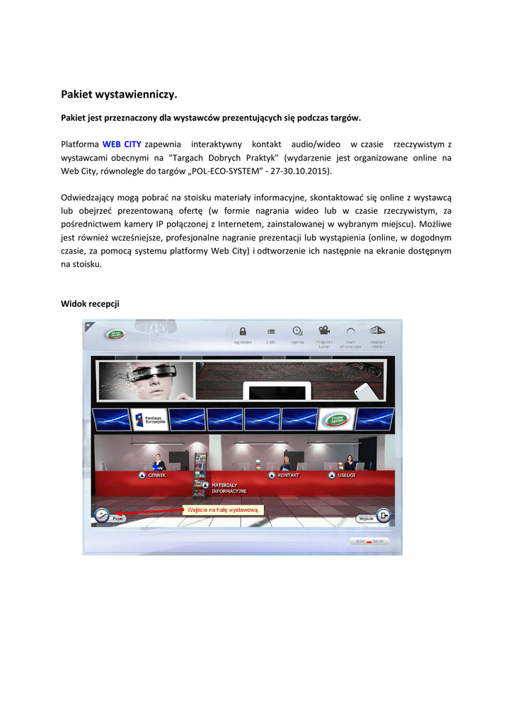 Pakiet wystawienniczy. Pakiet jest przeznaczony dla wystawców prezentujących się podczas targów. Platforma WEB CITY zapewnia interaktywny kontakt audio/wideo w czasie rzeczywistym z wystawcami obecnymi na "Targach Dobrych Praktyk" (wydarzenie jest organizowane online na Web City, równolegle do targów „POL-ECO-SYSTEM” - 27-30.10.2015). Odwiedzający mogą pobrać na stoisku materiały informacyjne, skontaktować się online z wystawcą lub obejrzeć prezentowaną ofertę (w formie nagrania wideo lub w czasie rzeczywistym, za pośrednictwem kamery IP połączonej z Internetem, zainstalowanej w wybranym miejscu). Możliwe jest również wcześniejsze, profesjonalne nagranie prezentacji lub wystąpienia (online, w dogodnym czasie, za pomocą systemu platformy Web City) i odtworzenie ich następnie na ekranie dostępnym na stoisku. Widok recepcji Spis wystawców w recepcji Stoisko w hali wystawienniczej Stoisko wystawiennicze z następującymi możliwościami: a) Film reklamowy b) Opis działalności wystawcy c) Dane kontaktowe d) Wyposażenie techniczne stoiska zapewnia wystawcy możliwość prowadzenia wideokonferencji (zarówno z innymi wystawcami, jak i z odwiedzającymi) oraz transmisji (za pomocą kamery IP połączonej z Internetem) z dowolnego miejsca, co umożliwia np. prezentację online innowacyjnego produktu lub usługi e) Foldery reklamowe do pobrania WARUNKI TECHNICZNE DO KORZYSTANIA Z PLATFORMY ORAZ ZAMIESZCZANIA MATERIAŁÓW REKLAMOWYCH: http://www.webcity.com.pl/pl/2013-05-17-19-20-47/warunki-techniczne