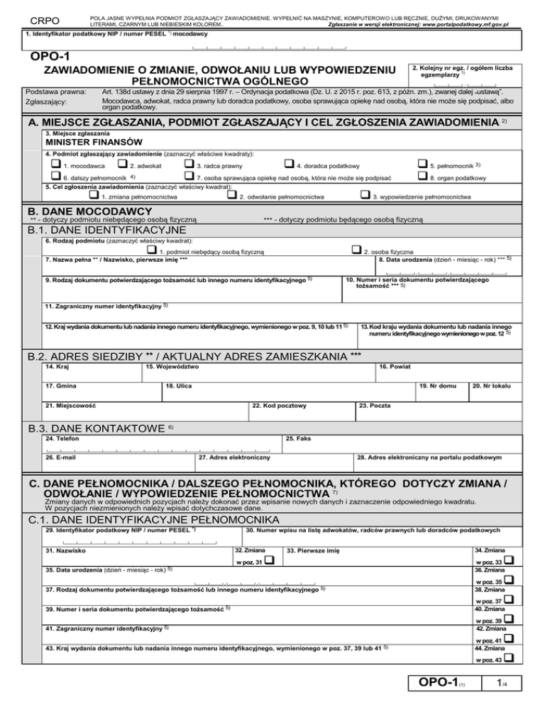 Załącznik nr 2 CRPO POLA JASNE WYPEŁNIA PODMIOT ZGŁASZAJĄCY ZAWIADOMIENIE. WYPEŁNIĆ NA MASZYNIE, KOMPUTEROWO LUB RĘCZNIE, DUŻYMI, DRUKOWANYMI LITERAMI, CZARNYM LUB NIEBIESKIM KOLOREM. Zgłaszanie w wersji elektronicznej: www.portalpodatkowy.mf.gov.pl 1. Identyfikator podatkowy NIP / numer PESEL *) mocodawcy └────┴────┴────┴────┴────┴────┴────┴────┴────┴────┴────┘ OPO-1 ZAWIADOMIENIE O ZMIANIE, ODWOŁANIU LUB WYPOWIEDZENIU PEŁNOMOCNICTWA OGÓLNEGO 2. Kolejny nr egz. / ogółem liczba 1) egzemplarzy └────┴────┘/└────┴────┘ Art. 138d ustawy z dnia 29 sierpnia 1997 r. _ Ordynacja podatkowa (Dz. U. z 2015 r. poz. 613, z późn. zm.), zwanej dalej ”ustawą”. Mocodawca, adwokat, radca prawny lub doradca podatkowy, osoba sprawująca opiekę nad osobą, która nie może się podpisać, albo organ podatkowy. Podstawa prawna: Zgłaszający: A. MIEJSCE ZGŁASZANIA, PODMIOT ZGŁASZAJĄCY I CEL ZGŁOSZENIA ZAWIADOMIENIA 2) 3. Miejsce zgłaszania MINISTER FINANSÓW 4. Podmiot zgłaszający zawiadomienie (zaznaczyć właściwe kwadraty): 1. mocodawca 2. adwokat 6. dalszy pełnomocnik 4) 3. radca prawny 4. doradca podatkowy 7. osoba sprawująca opiekę nad osobą, która nie może się podpisać 5. Cel zgłoszenia zawiadomienia (zaznaczyć właściwy kwadrat): 1. zmiana pełnomocnictwa 2. odwołanie pełnomocnictwa B. DANE MOCODAWCY ** - dotyczy podmiotu niebędącego osobą fizyczną 5. pełnomocnik 3) 8. organ podatkowy 3. wypowiedzenie pełnomocnictwa *** - dotyczy podmiotu będącego osobą fizyczną B.1. DANE IDENTYFIKACYJNE 6. Rodzaj podmiotu (zaznaczyć właściwy kwadrat): 2. osoba fizyczna 1. podmiot niebędący osobą fizyczną 7. Nazwa pełna ** / Nazwisko, pierwsze imię *** 8. Data urodzenia (dzień - miesiąc - rok) *** 5) 9. Rodzaj dokumentu potwierdzającego tożsamość lub innego numeru identyfikacyjnego 5) └────┴────┘-└────┴────┘-└────┴────┴────┴────┘ 10. Numer i seria dokumentu potwierdzającego tożsamość *** 5) 11. Zagraniczny numer identyfikacyjny 5) 12. Kraj wydania dokumentu lub nadania innego numeru identyfikacyjnego, wymienionego w poz. 9, 10 lub 11 5) 13. Kod kraju wydania dokumentu lub nadania innego numeru identyfikacyjnego wymienionego w poz. 12 5) B.2. ADRES SIEDZIBY ** / AKTUALNY ADRES ZAMIESZKANIA *** 14. Kraj 17. Gmina 15. Województwo 16. Powiat 18. Ulica 19. Nr domu 21. Miejscowość 22. Kod pocztowy B.3. DANE KONTAKTOWE 6) 24. Telefon 20. Nr lokalu 23. Poczta 25. Faks └────┴────┴────┴────┴────┴────┴────┴────┴────┴────┴────┴────┴────┴────┴────┴────┘ 26. E-mail 27. Adres elektroniczny 28. Adres elektroniczny na portalu podatkowym C. DANE PEŁNOMOCNIKA / DALSZEGO PEŁNOMOCNIKA, KTÓREGO DOTYCZY ZMIANA / ODWOŁANIE / WYPOWIEDZENIE PEŁNOMOCNICTWA 7) Zmiany danych w odpowiednich pozycjach należy dokonać przez wpisanie nowych danych i zaznaczenie odpowiedniego kwadratu. W pozycjach niezmienionych należy wpisać dotychczasowe dane. C.1. DANE IDENTYFIKACYJNE PEŁNOMOCNIKA 29. Identyfikator podatkowy NIP / numer PESEL *) └────┴────┴────┴────┴────┴────┴────┴────┴────┴────┴────┘ 31. Nazwisko 30. Numer wpisu na listę adwokatów, radców prawnych lub doradców podatkowych 32. Zmiana w poz. 31 35. Data urodzenia (dzień - miesiąc - rok) 5) 34. Zmiana 33. Pierwsze imię w poz. 33 36. Zmiana 37. Rodzaj dokumentu potwierdzającego tożsamość lub innego numeru identyfikacyjnego 5) w poz. 35 38. Zmiana 39. Numer i seria dokumentu potwierdzającego tożsamość 5) w poz. 37 40. Zmiana 41. Zagraniczny numer identyfikacyjny 5) w poz. 39 42. Zmiana 43. Kraj wydania dokumentu lub nadania innego numeru identyfikacyjnego, wymienionego w poz. 37, 39 lub 41 5) w poz. 41 44. Zmiana └────┴────┘-└────┴────┘-└────┴────┴────┴────┘ w poz. 43 OPO-1 (1) 1/4 CRPO POLA JASNE WYPEŁNIA PODMIOT ZGŁASZAJĄCY ZAWIADOMIENIE. WYPEŁNIĆ NA MASZYNIE, KOMPUTEROWO LUB RĘCZNIE, DUŻYMI, DRUKOWANYMI LITERAMI, CZARNYM LUB NIEBIESKIM KOLOREM. Zgłaszanie w wersji elektronicznej: www.portalpodatkowy.mf.gov.pl 45. Kod kraju wydania dokumentu lub nadania innego numeru identyfikacyjnego wymienionego w poz. 43 5) 47. Pełnomocnik do doręczeń 8) 48. Zmiana tak 51. Adres elektroniczny na portalu podatkowym 10) w poz. 47 46. Zmiana w poz. 45 50. Zmiana 49. Adres elektroniczny 9) w poz. 49 52. Zmiana w poz. 51 C.2. ADRES PEŁNOMOCNIKA DO DORĘCZEŃ W KRAJU 11) 53. Nastąpiła zmiana adresu tak 54. Kraj 55. Województwo POLSKA 57. Gmina 56. Powiat 58. Ulica 59. Nr domu 61. Miejscowość 62. Kod pocztowy C.3. DANE KONTAKTOWE PEŁNOMOCNIKA 12) 65. Zmiana 64. Telefon └────┴────┴────┴────┴────┴────┴────┴────┴────┴────┴────┴─────┴────┴────┴────┘ 68. E-mail 60. Nr lokalu 63. Poczta 67. Zmiana 66. Faks w poz. 64 w poz. 66 69. Zmiana w poz. 68 C.4. DANE IDENTYFIKACYJNE DALSZEGO PEŁNOMOCNIKA 70. Identyfikator podatkowy NIP / numer PESEL *) 71. Numer wpisu na listę adwokatów, radców prawnych lub doradców podatkowych └────┴────┴────┴────┴────┴────┴────┴────┴────┴────┴────┘ 72. Nazwisko 73. Zmiana w poz. 72 76. Data urodzenia (dzień - miesiąc - rok) 5) 75. Zmiana 74. Pierwsze imię w poz. 74 77. Zmiana 78. Rodzaj dokumentu potwierdzającego tożsamość 