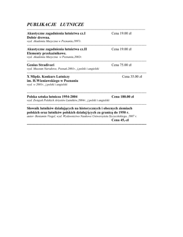 PUBLIKACJE LUTNICZE --------------------------------------------------------------------------------------------------Akustyczne zagadnienia lutnictwa cz.I Cena 19.00 zł Dobór drewna. wyd. Akademia Muzyczna w Poznaniu,1997r. ---------------------------------------------------------------------------------------------------Akustyczne zagadnienia lutnictwa cz.II Cena 19.00 zł Elementy przekaźnikowe. wyd. Akademia Muzyczna w Poznaniu,2002r. ---------------------------------------------------------------------------------------------------Genius Stradivari Cena 75.00 zł wyd. Muzeum Narodowe, Poznań.2001r., j.polski i angielski ---------------------------------------------------------------------------------------------------X Międz. Konkurs Lutniczy Cena 35.00 zł im. H.Wieniawskiego w Poznaniu wyd. w 2001r., j.polski i angielski ---------------------------------------------------------------------------------------------------Polska sztuka lutnicza 1954-2004 Cena 180.00 zł wyd. Związek Polskich Artystów Lutników,2004r., j.polski i angielski ---------------------------------------------------------------------------------------------------Słownik lutników działających na historycznych i obecnych ziemiach polskich oraz lutników polskich działajĄcych za granicą do 1950 r. autor- Beniamin Viogel, wyd. Wydawnictwo Naukowe Uniwersytetu Szczecińskiego, 2007 r. Cena 45,-zł ----------------------------------------------------------------------------------------------------
