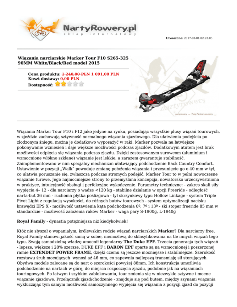 Utworzono: 2017-03-04 02:23:05 Wiązania narciarskie Marker Tour F10 S265-325 90MM White/Black/Red model 2015 Cena produktu: 1 240,00 PLN 1 091,00 PLN Koszt dostawy: 0,00 PLN Dostępność: Wiązania Marker Tour F10 i F12 jako jedyne na rynku, posiadając wszystkie plusy wiązań tourowych, w zjeździe zachowują sztywność normalnego wiązania zjazdowego. Dla ułatwienia podejścia po zlodzonym śniegu, można je dodatkowo wyposażyć w raki. Marker pozwala na łatwiejsze pokonywanie wzniesień i daje większe możliwości podczas zjazdów. Dodatkowym atutem jest brak możliwości odpięcia się wiązania podczas zjazdu. Dzięki zastosowanym surowcom (aluminium i wzmocnione włókno szklane) wiązanie jest lekkie, a zarazem gwarantuje stabilność. Zaimplementowano w nim specjalny mechanizm ułatwiający podchodzenie Back Country Comfort. Ustawienie w pozycji „Walk” powoduje zmianę położenia wiązania i przesunięcie go o 40 mm w tył, co ułatwia poruszanie się, zwłaszcza podczas stromych podejść. Marker Tour to w pełni nowoczesne wiązanie turowe. Jego najmocniejsze strony to przemyślana koncepcja, nowatorsko urzeczywistniona w praktyce, intuicyjność obsługi i perfekcyjne wykończenie. Parametry techniczne: - zakres skali siły wypięcia 4– 12 - dla narciarzy o wadze <120 kg - stabilne działanie w opcji Freeride - odległość narta-but 36 mm - ruchoma płytka poślizgowa - tył skrzynkowy typu Hollow Linkage - system Triple Pivot Light z regulacją wysokości, do różnych butów tourowych - system optymalizacji nacisku krawędzi EPS X - możliwość ustawienia kąta podchodzenia 0º, 7º i 13º - ski stoper freeride 85 mm w standardzie - możliwość założenia raków Marker - waga pary S-1900g, L-1940g Royal Family - dynastia potężniejsza niż kiedykolwiek! Któż nie słyszał o wspaniałym, królewskim rodzie wiązań narciarskich Marker? Dla narciarzy free, Royal Family stanowi jakość samą w sobie, niemożliwą do sklasyfikowania na tle innych wiązań tego typu. Swoją samodzielną władzę umocnił legendarny The Duke EPF. Trzecia generacja tych wiązań - lepsze, większe i 28% szersze. DUKE EPF i BARON EPF oparte są na wzmocnionej i poszerzonej ramie EXTENDET POWER FRAME, dzięki czemu są jeszcze mocniejsze i stabilniejsze. Szerokość rozstawu śrub mocujących wynosi aż 46 mm, co zapewnia najlepszą transmisję sił sterujących. Obydwa modele zalecane są do nart o szerokości powyżej 88mm. Ich konstrukcja umożliwia podchodzenie na nartach w górę, do miejsca rozpoczęcia zjazdu, podobnie jak na wiązaniach touringowych. Po łatwym i szybkim zablokowaniu, tour zmienia się w niezwykle sztywne i mocne wiązanie zjazdowe. Przełącznik zjazd/chodzenie - znajduje się pod butem, między szynami wiązania wykluczając tym samym możliwość samoczynnego wypięcia się wiązania z pozycji zjazd do pozycji chodzenia. Znakomite parametry i konstrukcja wiązań pozwala na bardzo agresywną jazdę poza trasami. Nowym członkiem Royal Family został model Lord SP (Ski Patrol), przeznaczony dla ludzi używających nart do przemieszczania się w dzikim terenie służbowo n.p. ratownicy górscy, pracownicy Parków Narodowych. Wiązanie posiada wzmocnioną konstrukcję, odporną na uszkodzenia, jego przód ma regulację dostosowującą szczęki do różnych rodzajów butów narciarskich. Lord SP, na największych targach sprzętu sportowego ISPO 2013 w Monachium, zwyciężył w kategorii Wiązania Narciarskie. Jester PRO to najlepsza broń dla zagorzałych, profesjonalnych narciarzy FREE. Posiada oryginalny design i więcej mocy niż kiedykolwiek dzięki szerszej płycie bazowej i na nowo zaprojektowanej piętce. Konstrukcja pięty zapewnia doskonałe trzymanie podczas ostrej jazdy poza trasami, gdyż pietka "próbuje" ciągle dociskać buta do narty, minimalizując przy tym możliwość przypadkowego wypięcia się buta z wiązania. Nowo zaprojektowana przednia część wiązania posiada poziomo wstawioną sprężynę, który wraz z płytką antypoślizgową, ustawioną pod kątem 5%, zapewnia niesamowicie precyzyjne działanie mechanizmu zwalniającego oraz przekaz sił, aby zminimalizować ryzyko przypadkowego wypięcia buta. Aluminiowy most na górze zapewnia dodatkowe usztywnienie i redukcję wagi, ale również pozwala na łatwe pozbycie się przyklejonego do podeszwy buta śniegu. The Jester i Griffon to lekkie i mocne wiązania freeridowo-freestylowe, o masie skupionej blisko środka narty, co ułatwia wykonywanie tricków w snowparku. Dla młodzieży przeznaczone są lekkie (1530g) freestylowe wiązania Squire. Wiązania Jester, Griffon, Squire występują w wersji Schizo. Jest to mechanizm pozwalający na zmianę położenia buta na narcie, w zakresie 60 mm. Zmianę można dokonać bez wypinania buta z wiązania. Schizo daje Ci możliwość ustawienie pozycji wiązania w zależności od stylu jazdy. Prosty i szybki sposób na przestawienie się z freeridu na freestyle! Wiązania Markera są szersze, niższe i krótsze od konkurencji. Większa szerokość zapewnia najlepszą transmisję sił sterujących. Obniżenie środka ciężkości poprawia stabilność narciarza, a mniejsza długość wiązania to mniejsze usztywnienie narty. Producent Marker Rozmiar 90 Kolekcja zima 2014/15 Płeć Męskie Kolory White/Black/Red Siła wypięcia Adres: http://nartyrowery.pl/ 4-10 Telefon: 34 365 66 09 Email: [email protected] Gadu-Gadu: Skype: