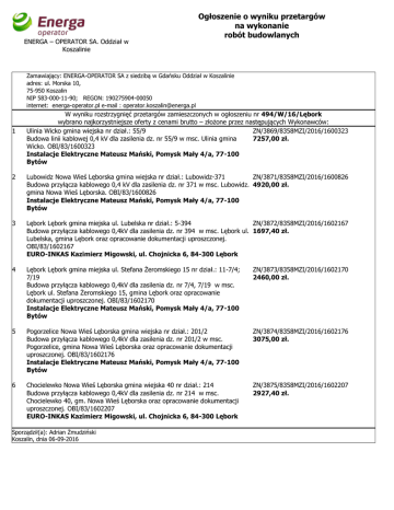 ENERGA – OPERATOR SA. Oddział w Koszalinie Ogłoszenie o wyniku przetargów na wykonanie robót budowlanych Zamawiający: ENERGA-OPERATOR SA z siedzibą w Gdańsku Oddział w Koszalinie adres: ul. Morska 10, 75-950 Koszalin NIP 583-000-11-90; REGON: 190275904-00050 internet: energa-operator.pl e-mail : [email protected] 1 W wyniku rozstrzygnięć przetargów zamieszczonych w ogłoszeniu nr 494/W/16/Lębork wybrano najkorzystniejsze oferty z cenami brutto – złożone przez następujących Wykonawców: Ulinia Wicko gmina wiejska nr dział.: 55/9 ZN/3869/8358MZI/2016/1600323 Budowa linii kablowej 0,4 kV dla zasilenia dz. nr 55/9 w msc. Ulinia gmina 7257,00 zł. Wicko. OBI/83/1600323 Instalacje Elektryczne Mateusz Mański, Pomysk Mały 4/a, 77-100 Bytów 2 Lubowidz Nowa Wieś Lęborska gmina wiejska nr dział.: Lubowidz-371 ZN/3871/8358MZI/2016/1600826 Budowa przyłącza kablowego 0,4 kV dla zasilenia dz. nr 371 w msc. Lubowidz. 4920,00 zł. gmina Nowa Wieś Lęborska. OBI/83/1600826 Instalacje Elektryczne Mateusz Mański, Pomysk Mały 4/a, 77-100 Bytów 3 Lębork Lębork gmina miejska ul. Lubelska nr dział.: 5-394 ZN/3872/8358MZI/2016/1602167 Budowa przyłącza kablowego 0,4kV dla zasilenia dz. nr 394 w msc. Lębork ul. 1697,40 zł. Lubelska, gmina Lębork oraz opracowanie dokumentacji uproszczonej. OBI/83/1602167 EURO-INKAS Kazimierz Migowski, ul. Chojnicka 6, 84-300 Lębork 4 Lębork Lębork gmina miejska ul. Stefana Żeromskiego 15 nr dział.: 11-7/4; 7/19 Budowa przyłącza kablowego 0,4kV dla zasilenia dz. nr 7/4, 7/19 w msc. Lębork ul. Stefana Żeromskiego 15, gmina Lębork oraz opracowanie dokumentacji uproszczonej. OBI/83/1602170 Instalacje Elektryczne Mateusz Mański, Pomysk Mały 4/a, 77-100 Bytów ZN/3873/8358MZI/2016/1602170 2460,00 zł. 5 Pogorzelice Nowa Wieś Lęborska gmina wiejska nr dział.: 201/2 Budowa przyłącza kablowego 0,4kV dla zasilenia dz. nr 201/2 w msc. Pogorzelice, gmina Nowa Wieś Lęborska oraz opracowanie dokumentacji uproszczonej. OBI/83/1602176 Instalacje Elektryczne Mateusz Mański, Pomysk Mały 4/a, 77-100 Bytów ZN/3874/8358MZI/2016/1602176 3075,00 zł. 6 Chocielewko Nowa Wieś Lęborska gmina wiejska 40 nr dział.: 214 Budowa przyłącza kablowego 0,4kV dla zasilenia dz. nr 214 w msc. Chocielewko 40, gm. Nowa Wieś Lęborska oraz opracowanie dokumentacji uproszczonej. OBI/83/1602207 EURO-INKAS Kazimierz Migowski, ul. Chojnicka 6, 84-300 Lębork ZN/3875/8358MZI/2016/1602207 2927,40 zł. Sporządził(a): Adrian Żmudziński Koszalin, dnia 06-09-2016
