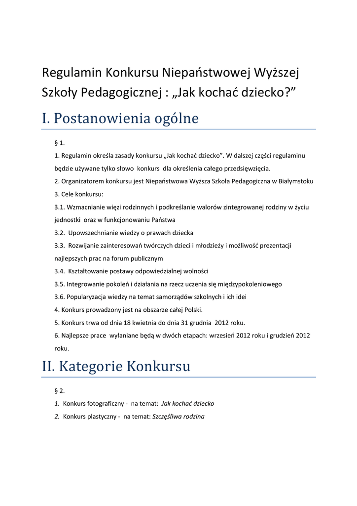Regulamin Konkursu Niepaństwowej Wyższej Szkoły Pedagogicznej : „Jak kochać dziecko?” I. Postanowienia ogólne § 1. 1. Regulamin określa zasady konkursu „Jak kochać dziecko”. W dalszej części regulaminu będzie używane tylko słowo konkurs dla określenia całego przedsięwzięcia. 2. Organizatorem konkursu jest Niepaństwowa Wyższa Szkoła Pedagogiczna w Białymstoku 3. Cele konkursu: 3.1. Wzmacnianie więzi rodzinnych i podkreślanie walorów zintegrowanej rodziny w życiu jednostki oraz w funkcjonowaniu Państwa 3.2. Upowszechnianie wiedzy o prawach dziecka 3.3. Rozwijanie zainteresowań twórczych dzieci i młodzieży i możliwość prezentacji najlepszych prac na forum publicznym 3.4. Kształtowanie postawy odpowiedzialnej wolności 3.5. Integrowanie pokoleń i działania na rzecz uczenia się międzypokoleniowego 3.6. Popularyzacja wiedzy na temat samorządów szkolnych i ich idei 4. Konkurs prowadzony jest na obszarze całej Polski. 5. Konkurs trwa od dnia 18 kwietnia do dnia 31 grudnia 2012 roku. 6. Najlepsze prace wyłaniane będą w dwóch etapach: wrzesień 2012 roku i grudzień 2012 roku. II. Kategorie Konkursu § 2. 1. Konkurs fotograficzny - na temat: Jak kochać dziecko 2. Konkurs plastyczny - na temat: Szczęśliwa rodzina 3. Konkurs na najlepszy reportaż, film lub esej - na tematy: Dekalog mądrego rodzica według nastolatka lub Samorząd szkolny dziś, jutro, pojutrze... II. Uczestnictwo w Konkursie § 3. 1. Konkurs fotograficzny - mieszkańcy Polski 2. Konkurs plastyczny - uczniowie szkół podstawowych 3. Konkurs na najlepszy reportaż, film lub esej – uczniowie gimnazjów, szkół zawodowych, liceów i techników III. Zasady Konkursu § 4. 1. Uczestnik musi wykonać pracę samodzielnie. 2. Konkurs fotograficzny 2.1. Uczestnik wykona zdjęcia rodzinne na temat: Jak kochać dziecko? 2.2. Na zdjęciu powinno być dziecko /-ci w dowolnym wieku z osobą/-ami z rodziny ukazujące wspólnie spędzany czas. 2.3. Każdy z autorów może nadesłać maksymalnie 5 fotografii. 2.4.Prace należy nadsyłać w formacie JPG o wymiarach 2048X1536 w plikach nie przekraczających 2MB jedynie pocztą elektroniczną na adres: [email protected] 2.5.Fotografie, na których będą się znajdować znaki, cyfry (np. daty) będą dyskwalifikowane. 3. Konkurs plastyczny 3.1. Uczestnik w ramach konkursu wykona jedną pracę na temat: Szczęśliwa rodzina. 3.2. Pracę należy wykonać w formacie A3. 3.3. Praca może zostać wykonana dowolną techniką. 3.4. Praca nie może być wykonana przy użyciu edytorów komputerowych. 4. Konkurs na najlepszy reportaż, film lub esej 4.1. Film, esej lub reportaż musi dotyczyć tematyki „Samorząd szkolny -dziś , jutro, pojutrze” lub „Dekalog mądrego rodzica według nastolatka”. 4.2. Reportaż może mieć dowolną formę artystyczną. 4.3. Esej lub reportaż /prasowy/ musi być napisany czcionką Times New Roman, wielkość czcionki 12. 4.4. Film i reportaż /radiowy, telewizyjny/, podpisany własnoręcznie esej i reportaż /prasowy/ należy przesłać ze zgłoszeniem na płycie CD na adres: Niepaństwowa Wyższa Szkoła Pedagogiczna w Białymstoku, Aleja Jana Pawła II 91 w Białymstoku 15 -703. § 5. 1. Uczestnikiem w konkursie fotograficznym jest ta osoba , która nadesłała kupon konkursowy i dostarczyła swoją pracę w wersji elektronicznej, na adres: [email protected] Niepaństwowa Wyższa Szkoła Pedagogiczna w Białymstoku, Aleja Jana Pawła II 91 w Białymstoku 15-703. 2. Uczestnikiem w konkursie plastycznym jest ta osoba , która dostarczyła swoją pracę z własnoręcznym podpisem i z wypełnionym kuponem konkursowym, na adres: Niepaństwowa Wyższa Szkoła Pedagogiczna w Białymstoku, Aleja Jana Pawła II 91 w Białymstoku 15-703 z dopiskiem Szczęśliwa rodzina. 3. Uczestnikiem w konkursie na najlepszy reportaż, film lub esej jest ta osoba , która dostarczyła swoją pracę z własnoręcznym podpisem i z wypełnionym kuponem konkursowym, na adres: Niepaństwowa Wyższa Szkoła Pedagogiczna w Białymstoku, Aleja Jana Pawła II 91 w Białymstoku 15-703 z dopiskiem Dekalog mądrego rodzica według nastolatka lub Samorząd szkolny dziś, jutro, pojutrze... 3. W konkursie nie będą uwzględniane zgłoszenia nie spełniające warunków określonych w niniejszym Regulaminie, w tym w przypadku: a) zgłoszenia przesłane po 31.12.2012 roku, b) przesłanie kuponu konkursowego wypełnionego nieczytelnie, nieprawidłowo lub niekompletnego, d) zgłoszenia tego samego uczestnika więcej niż jeden raz /poza konkursem fotograficznym, gdzie akceptujemy 5 zdjęć/ - jedna osoba może uczestniczyć jednocześnie w konkursie fotograficznym oraz w konkursie plastycznym lub w konkursie na najlepszy reportaż, film lub esej e) zgłoszenia na kuponie konkursowym więcej niż jednego uczestnika, f) zgłoszenia pracy w innym rozmiarze niż dopuszczony §6. Organizator nie ponosi odpowiedzialności za zgłoszenia zniszczone, niekompletne lub doręczone po terminie, o którym mowa w § 4 ust. 1. § 7. Jeżeli w toku trwania konkursu lub po jego zakończeniu okaże się, że uczestnik nie jest autorem nadesłanej pracy lub nie przysługują mu pełne autorskie prawa majątkowe do nadesłanej pracy, opiekun prawny uczestnika ponosić będzie odpowiedzialność za spowodowaną szkodę. IV. Zasady przyznawania nagród w konkursie § 8. 1. Prace konkursowe zostaną ocenione przez specjalnie powołaną Kapitułę złożoną z przedstawicieli świata nauki, kultury i sztuki. Przy ocenie prac ważne będą następujące kryteria: a) zgodność pracy z tematyką, b) inwencja i pomysłowość prezentacji tematyki, c) ogólne wrażenia estetyczne. 2. Najwyżej ocenione prace zostaną nagrodzone. 3. Nagrody rzeczowe w konkursie są ufundowane przez sponsorów. Nagrodom rzeczowym towarzyszyć będą listy gratulacyjne , wystawa prac zorganizowana na Rynku Tadeusza Kościuszki w Białymstoku, a następnie w innych miastach Polski, publikacja najciek