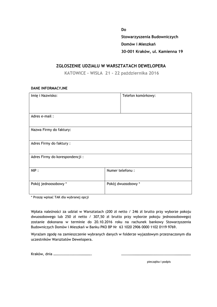 Do Stowarzyszenia Budowniczych Domów i Mieszkań 30-001 Kraków, ul. Kamienna 19 ZGŁOSZENIE UDZIAŁU W WARSZTATACH DEWELOPERA KATOWICE - WISŁA 21 - 22 października 2016 DANE INFORMACYJNE Imię i Nazwisko: Telefon komórkowy: Adres e-mail : Nazwa Firmy do faktury: Adres Firmy do faktury : Adres Firmy do korespondencji : NIP : Numer telefonu : Pokój jednoosobowy * Pokój dwuosobowy * * Proszę wpisać TAK dla wybranej opcji Wpłata należności za udział w Warsztatach (200 zł netto / 246 zł brutto przy wyborze pokoju dwuosobowego lub 250 zł netto / 307,50 zł brutto przy wyborze pokoju jednoosobowego) zostanie dokonana w terminie do 20.10.2016 roku na rachunek bankowy Stowarzyszenia Budowniczych Domów i Mieszkań w Banku PKO BP Nr 63 1020 2906 0000 1102 0119 9769. Wyrażam zgodę na zamieszczenie wybranych danych w folderze wyjazdowym przeznaczonym dla uczestników Warsztatów Dewelopera. Kraków, dnia ……………………………………. …………………………………………………………………… pieczątka i podpis