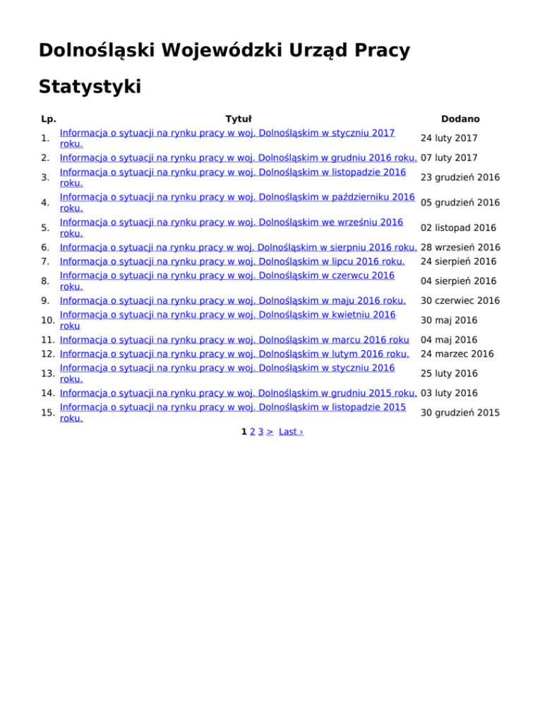 Dolnośląski Wojewódzki Urząd Pracy Statystyki Lp. Tytuł Dodano 1. Informacja o sytuacji na rynku pracy w woj. Dolnośląskim w styczniu 2017 roku. 2. Informacja o sytuacji na rynku pracy w woj. Dolnośląskim w grudniu 2016 roku. 07 luty 2017 3. Informacja o sytuacji na rynku pracy w woj. Dolnośląskim w listopadzie 2016 roku. 4. Informacja o sytuacji na rynku pracy w woj. Dolnośląskim w październiku 2016 05 grudzień 2016 roku. 5. Informacja o sytuacji na rynku pracy w woj. Dolnośląskim we wrześniu 2016 roku. 6. Informacja o sytuacji na rynku pracy w woj. Dolnośląskim w sierpniu 2016 roku. 28 wrzesień 2016 7. Informacja o sytuacji na rynku pracy w woj. Dolnośląskim w lipcu 2016 roku. 24 sierpień 2016 8. Informacja o sytuacji na rynku pracy w woj. Dolnośląskim w czerwcu 2016 roku. 04 sierpień 2016 9. Informacja o sytuacji na rynku pracy w woj. Dolnośląskim w maju 2016 roku. 30 czerwiec 2016 10. Informacja o sytuacji na rynku pracy w woj. Dolnośląskim w kwietniu 2016 roku 30 maj 2016 11. Informacja o sytuacji na rynku pracy w woj. Dolnośląskim w marcu 2016 roku 04 maj 2016 12. Informacja o sytuacji na rynku pracy w woj. Dolnośląskim w lutym 2016 roku. 24 marzec 2016 13. Informacja o sytuacji na rynku pracy w woj. Dolnośląskim w styczniu 2016 roku. 24 luty 2017 23 grudzień 2016 02 listopad 2016 25 luty 2016 14. Informacja o sytuacji na rynku pracy w woj. Dolnośląskim w grudniu 2015 roku. 03 luty 2016 15. Informacja o sytuacji na rynku pracy w woj. Dolnośląskim w listopadzie 2015 roku. 1 2 3 > Last › 30 grudzień 2015