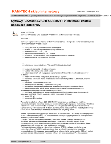 KAM-TECH sklep internetowy Utworzono : 11 listopad 2014 TV PRZEMYSŁOWA > systemy bezprzewodowe > obserwacja bezprzewodowa > Cyfrowy CAMsat 5,2 GHz CDS5021 T Cyfrowy CAMsat 5,2 GHz CDS5021 TV 300 mobil zestaw nadawczo-odbiorczy Model : CDS5021 Cyfrowy CAMsat 5,2 GHz CDS5021 TV 300 mobil zestaw nadawczo-odbiorczy Producent : Cyfrowy, bezprzewodowy, mobilny system transmisji obrazu i dźwięku dla kamer poruszających się 5.2 GHz CDS 5021 TV 300�mobil � zasięg do 300m w pomieszczeniach zamkniętych � od 4 do 21�niezależnych kanałów pracy video/audio � rozdzielczość 720�576 ( D1) � prędkości wyświetlania przy D1� 25 kl/s. � modulacja OFDM ( WIMAX) zastosowanie dla ruchomych obiektów � anteny odbiorcze z przewodami D=1.5m � wysoka jakość transmisji obrazu PAL oraz NTSC ( auto detekcja) � kodowanie transmisji 128 bitowym kodem � wejścia video Composite oraz S-video � anteny dookolne 6 szt. wyłapujące sygnał z różnych kierunków (możliwość rozbudowy do 800 m) � możliwa retransmisja oraz przedłużenie zasięgu sygnału � transmisja całkowicie wolna od zakłóceń, sieci internetowych 802.11, Bluetooth, telefonii radiowej itp. � transmisja z opóźnieniem do 400ms � bardzo prosty w instalacji i w pełni bezobsługowy � mocowanie nadajnika przystosowane do kamery z uchwytem typu Anton Bauer. � dodatkowo nadajnik może zostać wyposażony w mocowanie akumulatorów oraz akumulatory z uchwytem Anton Bauer lub V-lock (Sony). � możliwość zainstalowania bezprzewodowego modułu telemetrycznego do sterowania obiektywami (RS232, RS485, prędkości: 1200, 2400, 4800, 9600bps) � waga: 500 g� � gwarancja: 24 miesiące Wewnętrzna radiolinia cyfrowa CDS-5021 TV/300 przeznaczona jest do pracy mobilnej, wykorzystywany jako transmisja obrazu od operatora kamery lub z pojazdu ruchomego. Umożliwia przesył video oraz audio wewnątrz budynków na odległość do 100m a przy rozbudowaniu o większe anteny odbiorcze nawet do 800m. Dzięki cyfrowej modulacji OFDM może być stosowany w warunkach zabudowanych bez „widzialności optycznej" anten ! System zapewnia transmisję pełnego obrazu PAL w rozdzielczości 720�576 (D1) oraz prędkości 25 kl/s. Zabezpieczony ( AES) 128 bitowym kodem identyfikacyjnym gwarantuje zabezpieczenie przed podglądem osób trzecich. CDS-5021 TV-300 posiada wejścia video Composite, S-video z dwoma kanałami audio. Umożliwia także transmisję sygnału sterującego z dowolnego pilota IR (opcja). Dzięki zastosowaniu osobnych anten nadawczo odbiorczych uzyskano możliwość szerokiego doboru anten odbiorczych a co za tym idzie zwiększenia zasięgów. Podstawą stabilnego działania sytemu jest modulacja OFDM ( opisana poniżej) znana z systemów cyfrowych WIMAX gdzie uzyskano dużą prędkość transmisji przy niewielkiej kompresji obrazu. Występujące łączne opóźnienia w transmisji to maksymalnie <400ms� co jest wynikiem bardzo dobrym jak na transmisje cyfrowe czy bezprzewodowe IP o tak wysokiej kontakt : - [email protected] Strona 1 KAM-TECH sklep internetowy Utworzono : 11 listopad 2014 TV PRZEMYSŁOWA > systemy bezprzewodowe > obserwacja bezprzewodowa > Cyfrowy CAMsat 5,2 GHz CDS5021 T Cyfrowy CAMsat 5,2 GHz CDS5021 TV 300 mobil zestaw nadawczo-odbiorczy rozdzielczości. Nadajnik jak i odbiornik systemu CDS-5021 TV-300�to urządzenia dwukierunkowe które posiadają osobną antenę nadawczą (antena nadawcza, miniaturowa dookolna - moc wypromieniowana przez antenę nadawczą nie może przekraczać mocy dozwolonej, opisanej w normie� EN 301 893 równej� 23dbm oraz dwie antenki odbiorcze które podwójnie odbierają sygnały z różnych kierunków co zwiększa stabilność w trudnych warunkach pracy). CDS-5021 TV 300�przeznaczony jest jako nadajnik video przesyłający obraz: � od kamerzysty mobilnego poruszającego się bezprzewodowo po scenie/stadionie do wozu transmisyjnego, � radiowy podgląd obrazu z kamery w trakcie nagrywania programów TV, � przesył obrazu na żywo z samochodu rajdowego czy pojazdu latającego, Uruchomienie systemu CDS-5021 TV/300�polega wyłącznie na ukierunkowaniu anten odbiorczych i podłączeniu sygnału video i zasilania. Nie ma konieczności szukania wolnych częstotliwości czy ustawiania kanałów pracy. Urządzenie w chwili włączenia zasilania przez pierwsze 30s samo wyszukuje wolną częstotliwość na danym terenie i zapisuje dany kanał pracy na stałe. Jest to wymóg urządzeń pracujących w paśmie 5.2 GHz gdzie wyeliminowano wzajemne zakłócanie się. Wyjątkową jakoś transmisji uzyskaliśmy dzięki zastosowaniu: � modulacji OFDM znanej z systemów cyfrowych WIMAX � dynamicznie wybieranej mocy oraz częstotliwości ( kanału) pracy � 128 bitowego kodu zabezpieczającego transmisję � mechanizmowi QoS który zapewniają wysoką jakość transmisji � kompresji MPEG2 - umożliwia transmisję danych o dużej szybkości strumieni wideo i danych multimedialnych. Obecna jest w innych systemach takich jak satelitarna telewizja cyfrowa oraz DVB-T . � technologi MIMO zwiększającej przepustowość łącza bezprzewodowego, polegająca na transmisji wieloantenowej zarówno po stronie nadawczej jak i po stronie odbiorczej. Zastosowanie techniki MIMO posiada wiele korzyści, do których należą: � wzrost niezawodności łącza spowodowany zwiększeniem odporności na zaniki oraz odbicia sygnału radiowego kontakt : - [email protected] Strona 2 KAM-TECH sklep internetowy Utworzono : 11 listopad 2014 TV PRZEMYSŁOWA > systemy bezprzewodowe > obserwacja bezprzewodowa > Cyfrowy CAMsat 5,2 GHz CDS5021 T Cyfrowy CAMsat 5,2 GHz CDS5021 TV 300 mobil zestaw nadawczo-odbiorczy � zysk jakości transmisji wynikający z jednoczesnego odbioru zbiorczego sygnału Zastosowanie�CDS-5021 TV-300: � transmisja mobilna od operatora kamery do wozu transmisyjnego � podgląd mobilnych obrazów na planach zdjęciowych i reżyserkach � w telewizji kablo