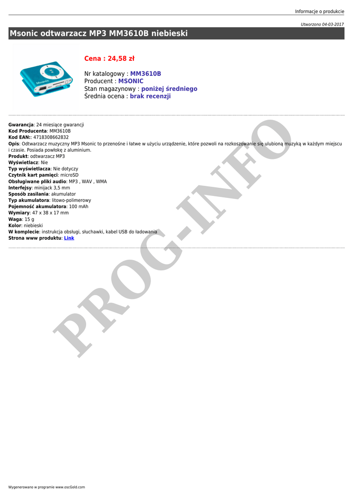 Informacje o produkcie Utworzono 04-03-2017 Msonic odtwarzacz MP3 MM3610B niebieski Cena : 24,58 zł Nr katalogowy : MM3610B Producent : MSONIC Stan magazynowy : poniżej średniego Średnia ocena : brak recenzji PR O G -I N FO Gwarancja: 24 miesiące gwarancji Kod Producenta: MM3610B Kod EAN:: 4718308662832 Opis: Odtwarzacz muzyczny MP3 Msonic to przenośne i łatwe w użyciu urządzenie, które pozwoli na rozkoszowanie się ulubioną muzyką w każdym miejscu i czasie. Posiada powłokę z aluminium. Produkt: odtwarzacz MP3 Wyświetlacz: Nie Typ wyświetlacza: Nie dotyczy Czytnik kart pamięci: microSD Obsługiwane pliki audio: MP3 , WAV , WMA Interfejsy: minijack 3,5 mm Sposób zasilania: akumulator Typ akumulatora: litowo-polimerowy Pojemność akumulatora: 100 mAh Wymiary: 47 x 38 x 17 mm Waga: 15 g Kolor: niebieski W komplecie: instrukcja obsługi, słuchawki, kabel USB do ładowania Strona www produktu: Link Wygenerowano w programie www.oscGold.com