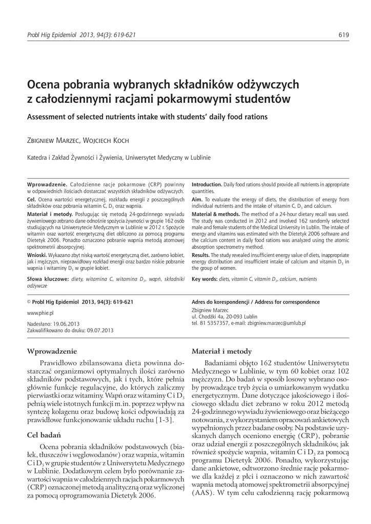 Marzec Probl Hig Z, Epidemiol Koch W. Ocena 2013,pobrania 94(3): 619-621 wybranych składników odżywczych z całodziennymi racjami pokarmowymi studentów 619 Ocena pobrania wybranych składników odżywczych z całodziennymi racjami pokarmowymi studentów Assessment of selected nutrients intake with students’ daily food rations Zbigniew Marzec, Wojciech Koch Katedra i Zakład Żywności i Żywienia, Uniwersytet Medyczny w Lublinie Wprowadzenie. Całodzienne racje pokarmowe (CRP) powinny w odpowiednich ilościach dostarczać wszystkich składników odżywczych. Introduction. Daily food rations should provide all nutrients in appropriate quantities. Cel. Ocena wartości energetycznej, rozkładu energii z poszczególnych składników oraz pobrania witamin C, D3 oraz wapnia. Aim. To evaluate the energy of diets, the distribution of energy from individual nutrients and the intake of vitamin C, D3 and calcium. Materiał i metody. Posługując się metodą 24-godzinnego wywiadu żywieniowego zebrano dane odnośnie spożycia żywności w grupie 162 osób studiujących na Uniwersytecie Medycznym w Lublinie w 2012 r. Spożycie witamin oraz wartość energetyczną diet obliczono za pomocą programu Dietetyk 2006. Ponadto oznaczono pobranie wapnia metodą atomowej spektrometrii absorpcyjnej. Material & methods. The method of a 24-hour dietary recall was used. The study was conducted in 2012 and involved 162 randomly selected male and female students of the Medical University in Lublin. The intake of energy and vitamins was estimated with the Dietetyk 2006 software and the calcium content in daily food rations was analyzed using the atomic absorption spectrometry method. Wnioski. Wykazano zbyt niską wartość energetyczną diet, zarówno kobiet, jak i mężczyzn, nieprawidłowy rozkład energii oraz bardzo niskie pobranie wapnia i witaminy D3 w grupie kobiet. Results. The study revealed insufficient energy value of diets, inappropriate energy distribution and insufficient intake of calcium and vitamin D3 in the group of women. Słowa kluczowe: diety, witamina C, witamina D 3, wapń, składniki odżywcze Key words: diets, vitamin C, vitamin D3, calcium, nutrients © Probl Hig Epidemiol 2013, 94(3): 619-621 Adres do korespondencji / Address for correspondence www.phie.pl Nadesłano: 19.06.2013 Zakwalifikowano do druku: 09.07.2013 Zbigniew Marzec ul. Chodźki 4a, 20-093 Lublin tel. 81 5357357, e-mail: [email protected] Wprowadzenie Materiał i metody Prawidłowo zbilansowana dieta powinna dostarczać organizmowi optymalnych ilości zarówno składników podstawowych, jak i tych, które pełnia głównie funkcje regulacyjne, do których zaliczmy pierwiastki oraz witaminy. Wapń oraz witaminy C i D3 pełnią wiele istotnych funkcji m.in. poprzez wpływ na syntezę kolagenu oraz budowę kości odpowiadają za prawidłowe funkcjonowanie układu ruchu [1-3]. Badaniami objęto 162 studentów Uniwersytetu Medycznego w Lublinie, w tym 60 kobiet oraz 102 mężczyzn. Do badań w sposób losowy wybrano osoby prowadzące tryb życia o umiarkowanym wydatku energetycznym. Dane dotyczące jakościowego i ilościowego składu diet zebrano w roku 2012 metodą 24-godzinnego wywiadu żywieniowego oraz bieżącego notowania, z wykorzystaniem opracowań ankietowych wypełnionych przez badane osoby. Na podstawie uzyskanych danych oceniono energię (CRP), pobranie oraz udział energii z poszczególnych składników, jak również spożycie wapnia, witamin C i D3 za pomocą programu Dietetyk 2006. Ponadto, wykorzystując dane ankietowe, odtworzono średnie racje pokarmowe dla każdej z płci i oznaczono w nich zawartość wapnia metodą atomowej spektrometrii absorpcyjnej (AAS). W tym celu całodzienną rację pokarmową Cel badań Ocena pobrania składników podstawowych (białek, tłuszczów i węglowodanów) oraz wapnia, witamin C i D3 w grupie studentów z Uniwersytetu Medycznego w Lublinie. Dodatkowym celem było porównanie zawartości wapnia w całodziennych racjach pokarmowych (CRP) oznaczonej metodą analityczną oraz wyliczonej za pomocą oprogramowania Dietetyk 2006. 620 Probl Hig Epidemiol 2013, 94(3): 619-621 homogenizowano i pobierano z niej po 4 próbki do analizy. Próbki mineralizowano metodą „na sucho” spopielając je w temp. 450°C, a następnie oznaczano wapń metodą płomieniową atomowej spektrometrii absorpcyjnej w aparacie Varian Spectra A20 Plus stosując jako bufor spektralny chlorek lantanu (III). Wyniki i omówienie W tabeli I przedstawiono wyniki pobrania składników podstawowych (białka, tłuszcze, węglowodany), witamin C i D3 oraz wapnia, jak również wartość energetyczną i rozkład energii z poszczególnych składników. Wyniki wartości energetycznej CRP oraz pobrania składników odżywczych zostały obliczone za pomocą programu Dietetyk 2006 w oparciu o krajową bazę danych. Natomiast wyniki pobrania wapnia otrzymano dwoma metodami: obliczeniową w oparciu o ww. program oraz analityczną (metoda AAS). W analizie statystycznej (średnia i SD) uwzględniono dwukrotne odtworzenie średniej racji pokarmowej dla obu płci oraz czterokrotne pobranie uśrednionych próbek analitycznych. Zaobserwowano zbyt niską wartość energetyczną całodziennych racji pokarmowych, zarówno w grupie kobiet, jak i mężczyzn. Również rozkład energii z poszczególnych składników diet nieznacznie odbiegał od wartości zalecanych [4]. Można akceptować wysoki Tabela I. Wartość energetyczna, zawartość składników podstawowych oraz wapnia, witamin C i D3 w całodziennych racjach pokarmowych studentów (X±SD) Table I. Energy value, content of basic nutrients, calcium, vitamins C and D3 in daily food rations of students (X±SD) Kobiety /Women n=60 Parametr /Parameter Mężczyźni /Men n=102 Dietetyk Dietetyk analiza analiza /Dietetyk /Dietetyk /analysis /analysis software Software Masa (g) /Mass (g) 1783±522 2178±653 Energia (kcal) /Energy (kcal) 1614±539 2542±853 Energia z białek (