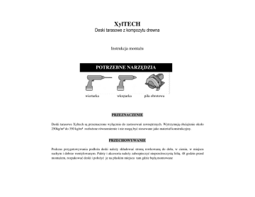 XylTECH Deski tarasowe z kompozytu drewna Instrukcja montaŜu POTRZEBNE NARZĘDZIA wiertarka wkrętarka piła obrotowa PRZEZNACZENIE Deski tarasowe Xyltech są przeznaczone wyłącznie do zastosowań zewnętrznych. Wytrzymują obciąŜenie około 250kg/m² do 350 kg/m² rozłoŜone równomiernie i nie mogą być stosowane jako materiał konstrukcyjny. PRZECHOWYWANIE Podczas przygotowywania podłoŜa deski naleŜy składować stroną rowkowaną do dołu, w cieniu, w miejscu suchym i dobrze wentylowanym. Palety i akcesoria naleŜy zabezpieczyć nieprzeźroczystą folią. 48 godzin przed montaŜem, rozpakować deski i połoŜyć je na płaskim miejscu tam gdzie będą montowane PRZYGOTOWANIE PODŁOśA Tarasy Xyltech montuje się na podłoŜu betonowym lub płytach betonowych połoŜonych co 50 cm na stabilnym podłoŜu zabezpieczonym przed porostem niepoŜądanych chwastów. Nachylenie co najmniej 1 cm na 2 m jest wskazane celem ułatwienia odpływu wody. POŁOśENIE DESEK Aby zabezpieczyć dobrą wentylację deski Xyltech kładzie się i mocuje na kantówkach Xyltech wykonanych z takiego samego materiału o przekroju 5cm x 3cm. Tradycyjne ułoŜenie desek wykonuje się na prostopadle połoŜonych kantówkach. W tym wypadku odległość między kantówkami nie powinna przekraczać 35 cm. (W miejscach intensywnie uczęszczanych 25cm) Kantówki kłaść wzdłuŜ spadku dla ułatwienia odpływu wody. W innym przypadku naleŜy przewidzieć przepływ wody poprzez nacięcia w kantówkach. Kantówki nie mogą leŜeć w kałuŜach ani hamować odpływu wody. Dla uzyskania lepszego efektu estetycznego, moŜna kłaść deski pod kątem 45º w stosunku do kantówek. W tym wypadku odległość między kantówkami powinna wynosić 20cm ( a 10cm dla kąta 30º). Kantówki przytwierdza się do podłoŜa betonowego lub pozostawia „pływające” . NaleŜy zachować 10 mm dylatacji między kantówkami i 15 mm miedzy kantówką a ścianą. MOCOWANIE I ŁĄCZENIE DESEK WYKOŃCZENIE Końce desek muszą spoczywać na kantówkach. Gdy wszystkie deski są juŜ przymocowane, naleŜy wyrównać końce za pomocą piły obrotowej. Następnie wcisnąć zamknięcia profili lub przymocować listwę do deski lub kantówki zachowując dylatację 5mm. Wkręty co 30 cm zapewniają dobre trzymanie się listwy (naleŜy jednak nawiercić większe otwory w listwie aby umoŜliwić dylatacje). JeŜeli stosujemy zamknięcia profili, naleŜy nawiercić 4 otwory o średnicy 15 mm w dolnej części deski, aby umoŜliwić odpływ wody. Zalecana szerokość dylatacji w mm RóŜnica między temperaturą składowania a temperaturą w dniu układania Łączna długość desek Deski układa się stroną rowkowaną (przeciwpoślizgową) do góry, pozostawiając dystans na długości i szerokości ok. 8 mm (12mm dla desek o dł. 3,60m)aby ułatwić odpływ wody i śniegu. Aby uzyskać równe odstępy naleŜy uŜyć klinów tej szerokości. Aby uniknąć nierówności deski mocować na kantówkach za pomocą klipsów ze stali nierdzewnej. Na początku nie naleŜy dopasowywać deski do brzegu tarasu. Wyrównanie jej nastąpi w chwili wykończania. Deski moŜna układać prostopadle do kantówek, lub tworzyć desenie skośne do 90º. NaleŜy przedtem przewidzieć połoŜenie kantówek. Deski przytwierdza się klipsami ze stali nierdzewnej i wkrętami 4x30mm. NaleŜy wcisnąć klips w brzeg deski, przykręcić go w środku kantówki, minimum 3 cm od końca deski aby uniknąć pęknięcia kompozytu. Następnie dopchnąć kolejną deskę. Deski przytwierdzać do kaŜdej kantówki. KONIECZNE JEST ZACHOWANIE DYLATACJI WG TABELI OBOK. 100cm 200cm 240cm 300cm 360cm 400cm 500cm 600cm 10°C 20°C 3,4 6,8 8,2 10,2 12,2 13,6 17,0 20,4 3,8 7,6 9,1 11,4 13,7 15,2 18,9 22,7 30° C 4,2 8,4 10,0 12,6 15,0 16,7 20,9 25,1 40°C 50°C 4,6 9,2 11,0 13,7 16,5 18,3 22,8 27,4 5,0 9,9 12,0 14,9 18,9 19,8 27,8 29,7 CZYSZCZENIE DESEK XYLTECH Deski Xyltech nie wymagają szczególnego czyszczenia: - naleŜy utrzymać w czystości szczeliny między deskami, aby umoŜliwić odpływ wody. - zmywanie myjką ciśnieniową z łagodnym detergentem. - plamy z pleśni usuwać rozcieńczonymi środkami zawierającymi chlor. - plamy tłuste lub olej zmywać środkiem odtłuszczającym najszybciej jak to moŜliwe. Jeśli są starsze uŜyć szczotki drucianej. - nie uŜywać rozpuszczalników. - rowki czyści się drucianą szczotką. - Deski Xyltech nie wymagają Ŝadnej szczególnej konserwacji. MoŜna je jednak lakierować i malować nie wcześniej niŜ 4 do 6 miesięcy od połoŜenia. NaleŜy wykonać próbę na niewidocznej powierzchni. W momencie dostawy deski mogą posiadać miejscowe wyblaknięcia, które znikają pod wpływem promieni słonecznych. NAJCZĘSTSZE BŁĘDY, KTÓRYCH MOśNA UNIKNĄĆ - nie zatapiać kantówek w betonie - nie sklejać ze sobą desek - nie łączyć desek - nie łączyć kantówek bez zachowania dylatacji - nie kłaść kantówek i desek na ścianę - nie zatykać szczelin między deskami - nie kłaść desek stroną rowkowaną do dołu - nie przykręcać klipsów zbyt mocno. ZAWSZE NALEśY ZABEZPIECZYĆ DOBRY ODPŁYW WODY I DOSKONAŁY OBIEG POWIETRZA. WARUNKI GWARANCJI Uwaga: Deski Xyltech są kompozytem drewna i polietylenu wysokiej gęstości . Deski komorowe +/- 140 x 25mm z kompozytu drewna Xyltech nie są przeznaczone na pasaŜe lecz wyłącznie do uŜytku domowego. Do realizacji w miejscach intensywnego uŜytkowania zalecamy inne deski z naszej gamy( np. HAVANA). Zastosowania wewnętrzne nie są zalecane. Deski Xyltech są materiałem wykończeniowym nie konstrukcyjnym, mogącym znieść nacisk miejscowy od 250kg/m² do 350kg/m² równomiernie rozłoŜonym. Lekkie przebarwienia i róŜnice kolorystyczne znikają pod wpływem promieni słonecznych. Kolory desek prezentowane w broszurach nie są wiąŜące i mogą się nieznacznie róŜnić, wskutek uŜycia róŜnych rodzajów drewna i materiałów plastycznych, jak równieŜ głębokości ro