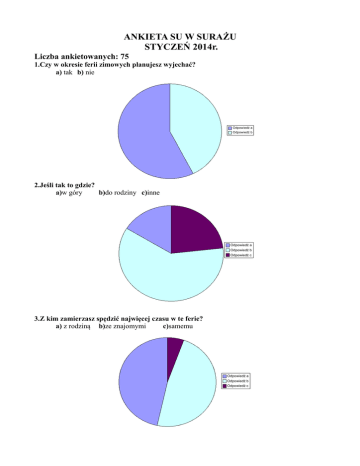 ANKIETA SU W SURAŻU STYCZEŃ 2014r. Liczba ankietowanych: 75 1.Czy w okresie ferii zimowych planujesz wyjechać? a) tak b) nie Odpowiedź a Odpowiedź b 2.Jeśli tak to gdzie? a)w góry b)do rodziny c)inne Odpowiedź a Odpowiedź b Odpowiedź c 3.Z kim zamierzasz spędzić najwięcej czasu w te ferie? a) z rodziną b)ze znajomymi c)samemu Odpowiedź a Odpowiedź b Odpowiedź c 4.Czy podczas ferii będziesz uprawiać sporty zimowe? a)tak b)nie Odpowiedź a Odpowiedź b 5.Czy uważasz, że ferie zimowe są za krótkie? a)tak b)nie Odpowiedź a Odpowiedź b Opracował: Jakub Jankowski