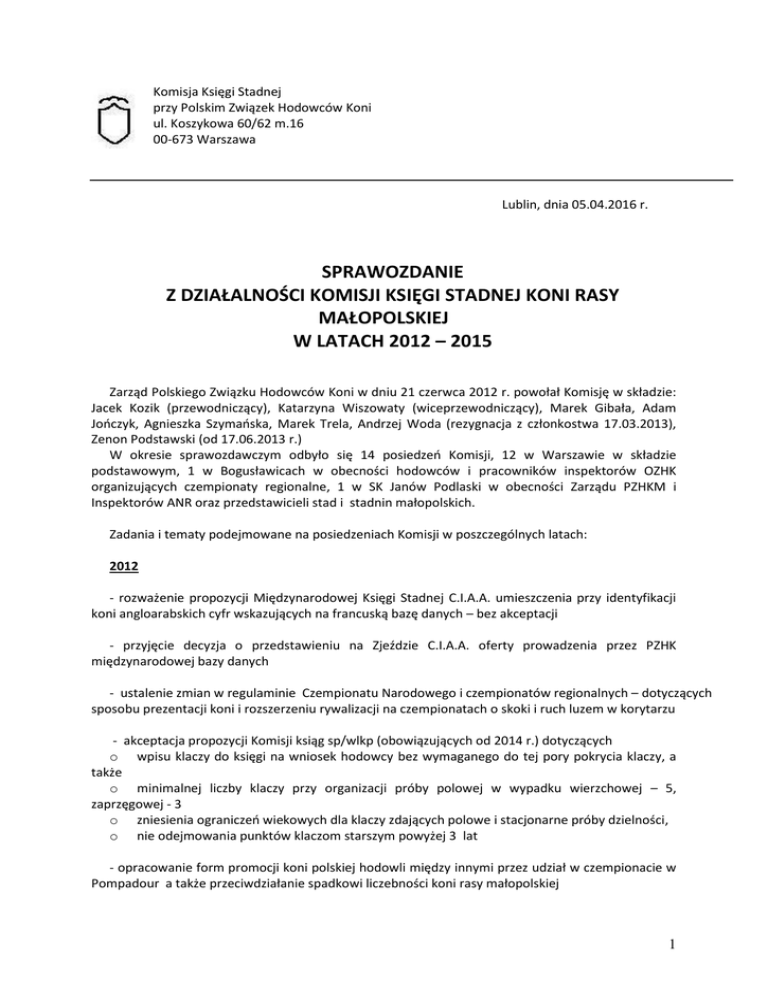 Komisja Księgi Stadnej przy Polskim Związek Hodowców Koni ul. Koszykowa 60/62 m.16 00-673 Warszawa Lublin, dnia 05.04.2016 r. SPRAWOZDANIE Z DZIAŁALNOŚCI KOMISJI KSIĘGI STADNEJ KONI RASY MAŁOPOLSKIEJ W LATACH 2012 – 2015 Zarząd Polskiego Związku Hodowców Koni w dniu 21 czerwca 2012 r. powołał Komisję w składzie: Jacek Kozik (przewodniczący), Katarzyna Wiszowaty (wiceprzewodniczący), Marek Gibała, Adam Jończyk, Agnieszka Szymańska, Marek Trela, Andrzej Woda (rezygnacja z członkostwa 17.03.2013), Zenon Podstawski (od 17.06.2013 r.) W okresie sprawozdawczym odbyło się 14 posiedzeń Komisji, 12 w Warszawie w składzie podstawowym, 1 w Bogusławicach w obecności hodowców i pracowników inspektorów OZHK organizujących czempionaty regionalne, 1 w SK Janów Podlaski w obecności Zarządu PZHKM i Inspektorów ANR oraz przedstawicieli stad i stadnin małopolskich. Zadania i tematy podejmowane na posiedzeniach Komisji w poszczególnych latach: 2012 - rozważenie propozycji Międzynarodowej Księgi Stadnej C.I.A.A. umieszczenia przy identyfikacji koni angloarabskich cyfr wskazujących na francuską bazę danych – bez akceptacji - przyjęcie decyzja o przedstawieniu na Zjeździe C.I.A.A. oferty prowadzenia przez PZHK międzynarodowej bazy danych - ustalenie zmian w regulaminie Czempionatu Narodowego i czempionatów regionalnych – dotyczących sposobu prezentacji koni i rozszerzeniu rywalizacji na czempionatach o skoki i ruch luzem w korytarzu - akceptacja propozycji Komisji ksiąg sp/wlkp (obowiązujących od 2014 r.) dotyczących o wpisu klaczy do księgi na wniosek hodowcy bez wymaganego do tej pory pokrycia klaczy, a także o minimalnej liczby klaczy przy organizacji próby polowej w wypadku wierzchowej – 5, zaprzęgowej - 3 o zniesienia ograniczeń wiekowych dla klaczy zdających polowe i stacjonarne próby dzielności, o nie odejmowania punktów klaczom starszym powyżej 3 lat - opracowanie form promocji koni polskiej hodowli między innymi przez udział w czempionacie w Pompadour a także przeciwdziałanie spadkowi liczebności koni rasy małopolskiej 1 o przygotowanie specjalnych nagród dla właścicieli koni osiągających wysokie wyniki w sporcie, oraz stypendiów dla jeźdźców dosiadających konie małopolskie o decyzja o przygotowaniu bazy danych dotyczącej wyników sportowych oraz oceny grupowej źrebiąt. - dalsze zachowanie selekcji ogierów poprzez Zakład Treningowy oraz rozważenie koncepcji oddzielnej oceny ogierów rasy małopolskiej w ZT i zmiany oceny na punktową - rozważenie propozycji dotyczącej wpisania klaczy do G I po zdanej próbie dzielności zagwarantowania w przyszłości tych klaczy jako matek uznanych ogierów - praca nad programem pokazów w Janowie Podlaskim mających odbywać się podczas Zjazdów WBFSH w 2013 r. i Walnego 2013 - ustalenie zmian do regulaminu Czempionatu Narodowego i czempionatów regionalnych; o wprowadzenie oceny skoków luzem koni 2-3-letnich oraz ruchu luzem roczniaków, na zasadzie konkursów dodatkowych (tylko dla chętnych) o opracowanie nowego wzoru karty katalogowej uwzględniającego % krwi arabskiej i nowego systemu ocen - zaakceptowanie propozycji zmian – obowiązujących w ZT od 2014 r. - wprowadzenie bonitowania i mierzenia klaczy podczas próby dzielności (w tym wpisu do księgi) - zlikwidowanie oceny miernej w skali ocen prób dzielności klaczy (30-34,99 pkt – ocena dostateczna) - zatwierdzenie zmian systemu liczenia wyników w wierzchowym ZT ogierów (ocena punktowa uwzględniająca wagi cech i odchylenie standardowe, brak oceny słownej) oraz przeprowadzenia wspólnego treningu zaprzęgowego dla ogierów ras szlachetnych i śląskich (na wzór próby ogierów rasy śląskiej) - akceptacja propozycji dotyczącej wymagań dla uznawania ogierów na podstawie wyników MPMK w powożeniu zaprzęgami oraz kategoryzacji (obowiązujące od 2013 r.): - wprowadzenie zmiany w regulaminie wpisu do ksiąg stadnych (obowiązujące od 1.08.2013): o „Do księgi stadnej może być także wpisane potomstwo pochodzące od jednego lub obojga rodziców wpisanych do ksiąg ras półkrwi innych niż wymienione poniżej*, jeśli w trzecim pokoleniu w rodowodzie tegoż potomka występuje tylko jeden przodek obcy dla rasy małopolskiej.” *małopolska, pełna krew angielska, czysta krew arabska i angloarabska, półkrew angloarabska (zagraniczne), półkrew arabska i angielska (z dawnych rodów austro-węgierskich). - zgoda na użycie w rozrodzie nasienia ogiera Mighty Magic hol. (10 klaczy), oraz ogiera Lucier m (2 lata + uzyskanie kwalifikacji do MPMK) - opracowanie regulaminu dla wszystkich czempionatów małopolskich w nowej formule ze skokami i ruchem luzem w korytarzu (jako fakultatywne – do końcowej klasyfikacji) - propozycja zmian w programie hodowlanym dotyczących wspólnego treningu ras szlachetnych m, śl, sp, wlkp w ZT zaprzęgowym 2 - zorganizowanie spotkania z Komisją Kwalifikacyjną przed ZT w celu omówienia rodowodów zgłaszanych ogierów i ich analizy w kierunku sportowym - ustosunkowanie do projektu polowej próby dla ogierów z końcowym wnioskiem, końcowa oceny może być nieadekwatna do prawdziwej wartości ogiera iż - analiza projektu uznawania ogierów na podstawie wyników uzyskanych w zawodach WKKW i powożenia zaprzęgami jednokonnymi z możliwością obniżenia progu punktowego dla ogierów programowych - podsumowanie zasad programu ochrony i wyrażenie opinii dotyczącej ewentualnych skutków jego działania - praca nad nowymi zasadami wpisu koni i próbami dzielności w programach hodowlanych o obniżenie dolnego progu ilości punktów bonitacyjnych do 72 przy wpisie klaczy do Głównej Księgi o 75 dla klaczy ubiegającej się o wpis do Księgi Wstępnej - akceptacja nowego miejsca przeprowadzenia treningu dla młodych ogierów i spraw organizacyjnych związanych z ZT, zapoznanie z propozycjami KKS sp i wlkp dotyczącymi o jeźdźców testowych, o akceptacji listy sędzi