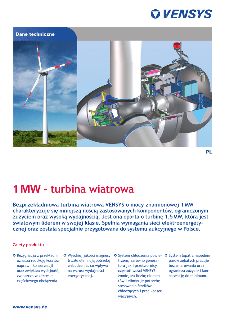 Specyfikacja turbiny wiatrowej VENSYS o mocy 1 MW
