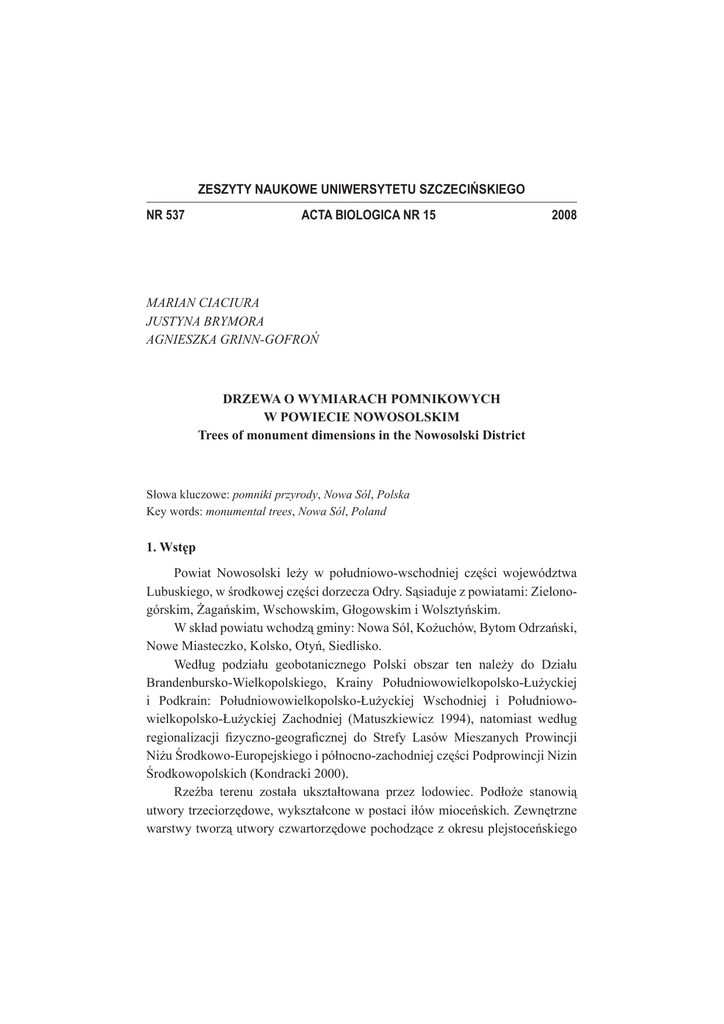 ZESZYTY NAUKOWE UNIWERSYTETU SZCZECIŃSKIEGO NR 537 ACTA BIOLOGICA NR 15 2008 MARIAN CIACIURA JUSTYNA BRYMORA AGNIESZKA GRINN-GOFROŃ DRZEWA O WYMIARACH POMNIKOWYCH W POWIECIE NOWOSOLSKIM Trees of monument dimensions in the Nowosolski District Słowa kluczowe: pomniki przyrody, Nowa Sól, Polska Key words: monumental trees, Nowa Sól, Poland 1. Wstęp Powiat Nowosolski leży w południowo-wschodniej części województwa Lubuskiego, w środkowej części dorzecza Odry. Sąsiaduje z powiatami: Zielonogórskim, Żagańskim, Wschowskim, Głogowskim i Wolsztyńskim. W skład powiatu wchodzą gminy: Nowa Sól, Kożuchów, Bytom Odrzański, Nowe Miasteczko, Kolsko, Otyń, Siedlisko. Według podziału geobotanicznego Polski obszar ten należy do Działu Brandenbursko-Wielkopolskiego, Krainy Południowowielkopolsko-Łużyckiej i Podkrain: Południowowielkopolsko-Łużyckiej Wschodniej i Południowowielkopolsko-Łużyckiej Zachodniej (Matuszkiewicz 1994), natomiast według regionalizacji fizyczno-geograficznej do Strefy Lasów Mieszanych Prowincji Niżu Środkowo-Europejskiego i północno-zachodniej części Podprowincji Nizin Środkowopolskich (Kondracki 2000). Rzeźba terenu została ukształtowana przez lodowiec. Podłoże stanowią utwory trzeciorzędowe, wykształcone w postaci iłów mioceńskich. Zewnętrzne warstwy tworzą utwory czwartorzędowe pochodzące z okresu plejstoceńskiego 26 Marian Ciaciura, Justyna Brymora, Agnieszka Grinn-Gofroń (lodowcowego). Podczas wkraczania lądolodu zlodowacenia środkowopolskiego doszło do powstawania szeregu zaburzeń glacitektonicznych. Najważniejszym skutkiem działalności lądolodu są liczne kry i porwaki starszego, głównie trzeciorzędowego podłoża oraz bardzo różna głębokość jego występowania. Trudno jednoznacznie stwierdzić, czy struktury utworów trzeciorzędowych zachowują ciągłość w podłożu, czy są to tylko kry i porwaki. Utwory iłów mioceńskich występują tutaj również w zasięgu zlodowacenia północnopolskiego. Są to prawdopodobnie wypiętrzone wcześniej struktury, które nie do końca zostały rozmyte w zlodowaceniu północnopolskim (Elaborat Nadleśnictwa Nowa Sól 2001). Według Wosia (1999) obszar powiatu należy do regionu klimatycznego Krainy Wielkich Dolin. Na tym terenie wieją przeważnie wiatry północno-zachodnie i południowo-zachodnie. Opady atmosferyczne wynoszą średnio ok. 605 mm rocznie. Średnia temperatura roczna wynosi 8,1 °C, a roczna amplituda 20,2 °C. Okres zimowy to około 70–80 dni w roku, czas zalegania pokrywy śnieżnej 50–60 dni. Lato trwa około 110 dni, wegetacja 220–240 dni. Przymrozki wiosenne występują średnio do 30 kwietnia, skrajnie do 30 maja. Przymrozki jesienne występują średnio od około 20 października (Operaty Leśne Nadleśnictwo Nowa Sól 2001). Najwięcej informacji o pomnikach przyrody i florze poszczególnych części powiatu można znaleźć w inwentaryzacjach przyrodniczych gmin. Dokumenty te wymagają jednak aktualizacji, ponieważ zostały sporządzone w 1995 roku. Nowe inwentaryzacje przyrodnicze są w opracowaniu. Dokumentację posiadają wszystkie gminy powiatu, zostały one sporządzone przez Ligę Ochrony Przyrody Z. U. „Natura” 1995. Praca stanowi kontynuację monitoringu cennych przyrodniczo obiektów, w tym monumentalnych drzew, prowadzonego przez pracowników i magistrantów Katedry Taksonomii Roślin i Fitogeografii Uniwersytetu Szczecińskiego, głównie na terenie Pomorza Zachodniego i terenów przyległych. 2. Metody badań Badania terenowe na obszarze powiatu prowadzono w okresie zimowym 2005 i letnim 2006. Zinwentaryzowano 161 drzew, podanych w waloryzacjach gmin i nadleśnictw jako pomniki przyrody i określono ich stan zdrowotny. Odnaleziono 14 nowych okazów, których wymiary kwalifikują je do przyznania im statusu pomnika przyrody. Za drzewo pomnikowe uznano takie, które przekracza 27 Drzewa o wymiarach pomnikowych... określone w literaturze progi wymiarowe (Pawlaczyk, Jermaczyk 1997). Obwody pni mierzono na wysokości 1,3 m. Przedstawiony poniżej wykaz drzew o wymiarach pomnikowych sporządzony został na podstawie badań magisterskich oraz informacji uzyskanych w Nadleśnictwie Nowa Sól. Wykaz ten zawiera: – liczbę porządkową, – nazwę gatunkową w języku łacińskim (według Mirka i in. 1995), – wymiary (obwód w cm), – lokalizację, – informacje o stanie zdrowotnym. 3. Wykaz drzew o wymiarach pomnikowych Tabela 1. Zarejestrowane drzewa pomnikowe Table 1. Registered monumental trees Lp. Gatunek Obwód (cm) Lokalizacja Uwagi 1 2 3 4 5 1 Quercus robur 520 Nowa Sól, ul. Piłsudzkiego Ogrodzony, 3 konary, rozpiętość korony 50 m, stan bardzo dobry 2 Taxus baccata 142 Nowa Sól, ul. Moniuszki Ogrodzony, rozpiętość korony 11 m, stan bardzo dobry 3 Quercus robur 472 Nowa Sól, park „Kacza górka” Ogrodzony, 3 konary, rozpiętość korony 30 m, stan bardzo dobry 4 Quercus robur 345 Nowa Sól, park „Kacza górka” 2 konary, rozpiętość korony 20 m, stan bardzo dobry 5 Quercus robur 420 Nowa Sól, park „Kacza górka” 2 konary, rozpiętość korony 30 m, stan bardzo dobry 6 Platanus x acerifolia 550 Nowa Sól, park „Odry” Ogrodzony, 4 konary, rozpiętość korony 33 m, stan bardzo dobry 7 Gingko biloba 175 Nowa Sól, ul. Witosa Ogrodzony, rozpiętość korony 16 m, stan bardzo dobry Gmina Nowa Sól 28 Marian Ciaciura, Justyna Brymora, Agnieszka Grinn-Gofroń 1 2 3 4 5 8 Platanus x acerifolia 300 Nowa Sól, ul. Św. Barbary Ogrodzony, 2 konary, stan bardzo dobry, rozpiętość korony 40 m 9 Platanus x acerifolia 280 Nowa Sól, ul. Św. Barbary Ogrodzony, 4 konary, stan bardzo dobry, rozpiętość korony 35 m 10 Taxodium distichum 240 Nowa Sól, ul. Witosa Ogrodzony, rozpiętość korony 15 m, stan dobry 11 Taxus baccata 115 Nowa Sól, ul. Muzealna Ogrodzony, 2 konary, stan bardzo dobry, rozpiętość korony 10 m 12 Quercus robur 450 Nowa Sól, park „Kacza górka” Ogrodzony, 2 ko