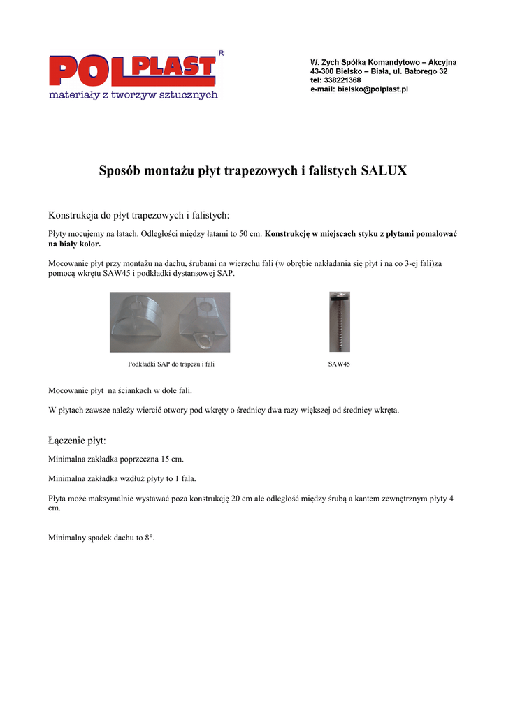 Sposób montażu płyt trapezowych i falistych SALUX Konstrukcja do płyt trapezowych i falistych: Płyty mocujemy na łatach. Odległości między łatami to 50 cm. Konstrukcję w miejscach styku z płytami pomalować na biały kolor. Mocowanie płyt przy montażu na dachu, śrubami na wierzchu fali (w obrębie nakładania się płyt i na co 3-ej fali)za pomocą wkrętu SAW45 i podkładki dystansowej SAP. Podkładki SAP do trapezu i fali SAW45 Mocowanie płyt na ściankach w dole fali. W płytach zawsze należy wiercić otwory pod wkręty o średnicy dwa razy większej od średnicy wkręta. Łączenie płyt: Minimalna zakładka poprzeczna 15 cm. Minimalna zakładka wzdłuż płyty to 1 fala. Płyta może maksymalnie wystawać poza konstrukcję 20 cm ale odległość między śrubą a kantem zewnętrznym płyty 4 cm. Minimalny spadek dachu to 8°.