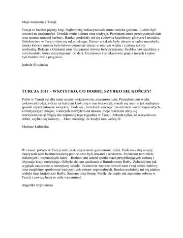 Moje wrażenia z Turcji. Turcja to bardzo piękny kraj. Najbardziej zafascynowała mnie turecka gościna. Ludzie byli otwarci na znajomości. Urzekła mnie kultura oraz tradycja. Pamiętam smak przepysznych dań oraz aromat mocnej herbaty. Bardzo podobały mi się cudowne krajobrazy górzyste i morskie. Szkolnictwo w Turcji różni się od polskiego. Dzieci w szkole były ubrane w ładne mundurki, dzięki którym można było łatwo rozpoznać dzieci w różnym wieku i z jakiej szkoły pochodzą. Relacje z Grekami oraz Bułgarami równie były przyjazne. Szybko nawiązaliśmy z nimi kontakt, który utrzymujemy do dziś. Uczniowie i opiekunowie grup z innych krajów byli bardzo mili i przyjaźni. Izabela Śliwińska TURCJA 2011 - WSZYSTKO, CO DOBRE, SZYBKO SIĘ KOŃCZY! Pobyt w Turcji był dla mnie czymś wyjątkowym, niesamowitym. Poznałem tam wielu ciekawych ludzi, którzy na każdym kroku się o nas troszczyli, starali się nam w jak najlepszy sposób zaprezentować swój kraj. Podczas „tureckich wakacji” zwiedziłem wiele wspaniałych, klimatycznych miejsc, o których marzyłem od dawna, moje marzenia stały się rzeczywistością! Nigdy nie zapomnę tego tygodnia w Turcji. Szkoda tylko, że wszystko co dobre, szybko się kończy… Mam nadzieję, że kiedyś tam wrócę Mariusz Łubianka W czasie pobytu w Turcji mile zaskoczyła mnie gościnność ludzi. Podczas całej wizyty okazywali nam bezinteresowną pomoc oraz byli otwarci i serdeczni. Poznałam tam wiele ciekawych i wspaniałych ludzi. Brałam tam udział spotkaniach przybliżających kulturę i obyczaje kraju tureckiego. Odbyło się tam spotkanie z Burmistrzem Bafry. Zobaczyłam jak wygląda nauczanie w tamtejszej szkole. Uczniowie zaprezentowali nam swój taniec ludowy oraz mogliśmy spróbować tradycyjnych potraw regionalnych. Bardzo podobały mi się piękne widoki oraz krajobrazy Bafry, Samsun oraz Sinop. Myślę, że nigdy nie zapomnę pobytu w Turcji i zawsze będę to mile wspominać. Angelika Szymańska
