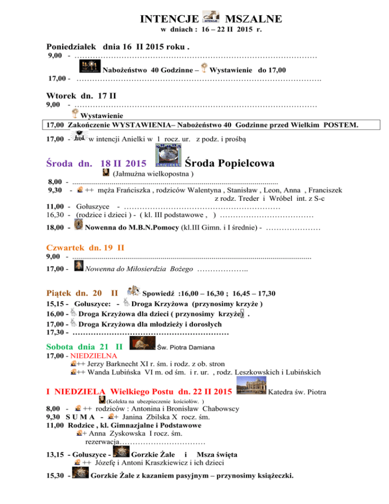 INTENCJE MSZALNE w dniach : 16 – 22 II 2015 r. Poniedziałek dnia 16 II 2015 roku . 9,00 - ………………………………………………………………………………… Nabożeństwo 40 Godzinne – Wystawienie do 17,00 17,00 - …………………………………………………………………………………. Wtorek dn. 17 II 9,00 - ………………………………………………………………………………… Wystawienie 17,00 Zakończenie WYSTAWIENIA– Nabożeństwo 40 Godzinne przed Wielkim POSTEM. 17,00 - w intencji Anielki w 1 rocz. ur. z podz. i prośbą Środa dn. 18 II 2015 Środa Popielcowa (Jałmużna wielkopostna ) 8,00 - ......................................................................................................... ++ męża Frańciszka , rodziców Walentyna , Stanisław , Leon, Anna , Franciszek 9,30 z rodz. Treder i Wróbel int. z S-c 11,00 - Gołuszyce - …………………………………………………… 16,30 - (rodzice i dzieci ) - ( kl. III podstawowe , ) ……………………………… 18,00 - Nowenna do M.B.N.Pomocy (kl.III Gimn. i I średnie) - ………………… Czwartek dn. 19 II 9,00 - .......................................................................................................................... 17,00 - Nowenna do Miłosierdzia Bożego ……………….. Piątek dn. 20 II 15,15 16,00 17,00 17,30 - Spowiedź :16,00 – 16,30 ; 16,45 – 17,30 Gołuszyce: Droga Krzyżowa (przynosimy krzyże ) Droga Krzyżowa dla dzieci ( przynosimy krzyże) . Droga Krzyżowa dla młodzieży i dorosłych …………………………………………………… Sobota dnia 21 II Św. Piotra Damiana 17,00 - NIEDZIELNA ++ Jerzy Barknecht XI r. śm. i rodz. z ob. stron ++ Wanda Lubińska VI m. od śm. i r. ur. , rodz. Leszkowskich i Lubińskich I NIEDZIELA Wielkiego Postu dn. 22 II 2015 Katedra św. Piotra (Kolekta na ubezpieczenie kościołów. ) 8,00 ++ rodziców : Antonina i Bronisław Chabowscy 9,30 S U M A - + Janina Zbilska X rocz. śm. 11,00 Rodzice , kl. Gimnazjalne i Podstawowe + Anna Zyskowska I rocz. śm. rezerwacja…………………………… Gorzkie Żale i Msza święta 13,15 - Gołuszyce ++ Józefę i Antoni Kraszkiewicz i ich dzieci 15,30 - Gorzkie Żale z kazaniem pasyjnym – przynosimy książeczki.