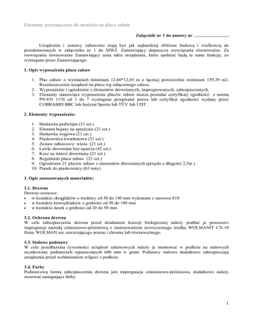 Elementy przeznaczone do montażu na placu zabaw Załącznik nr 1 do umowy nr ………………….. Urządzenia i zestawy zabawowe mają być jak najbardziej zbliżone budową i wielkością do przedstawionych w załączniku nr 1 do SIWZ. Zamawiający dopuszcza rozwiązania równoważne. Za rozwiązania równoważne Zamawiający uzna takie urządzenia, które spełniać będą te same funkcje, co wymagane przez Zamawiającego. 1. Opis wyposażenia placu zabaw 1. Plac zabaw o wymiarach minimum 12,60*12,65 m o łącznej powierzchni minimum 159,39 m2. Rozmieszczenie urządzeń na placu wg załączonego szkicu. 2. Wyposażenie i ogrodzenie z elementów drewnianych, impregnowanych, zabezpieczonych. 3. Elementy stanowiące wyposażenie placów zabaw musza posiadać certyfikaty zgodności z normą PN-EN 1176 od 1 do 7 wymagane przepisami prawa lub certyfikat zgodności wydany przez COBRABID BBC lub Instytut Sportu lub TÜV lub UDT . 2. Elementy wyposażenia: 1. 2. 3. 4. 5. 6. 7. 8. 9. 10. Huśtawka podwójna (21 szt.) Element bujany na sprężynie (21 szt.) Huśtawka wagowa (21 szt.) Piaskownica kwadratowa (21 szt.) Zestaw zabawowy: wieża (21 szt.) Ławki drewniane bez oparcia (42 szt.) Kosz na śmieci drewniany (21 szt.) Regulamin placu zabaw (21 szt.) Ogrodzenie 21 placów zabaw z elementów drewnianych (przęsło o długości 2,5m ) Piasek do piaskownicy (63 tony) 3. Opis zastosowanych materiałów: 3.1. Drewno Drewno sosnowe: • w kształcie okrąglaków o średnicy od 50 do 140 mm wykonane z surowca S10 • w kształcie krawędziaków o grubości od 50 do 140 mm • w kształcie desek o grubości od 20 do 50 mm 3.2. Ochrona drewna W celu zabezpieczenia drewna przed działaniem korozji biologicznej należy poddać je procesowi impregnacji metodą ciśnieniowo-próżniową z zastosowaniem nowoczesnego środka WOLMANIT CX-10 firmy WOLMAN nie zawierającego arsenu i chromu lub równoważnego. 3.3. Stalowe podstawy W celu przedłużenia żywotności urządzeń zabawowych należy je montować w podłożu na stalowych ocynkowany podstawach wpuszczanych 600 mm w grunt. Podstawy stalowe dodatkowo zabezpieczają urządzenia przed wchłanianiem wilgoci z podłoża. 3.4. Farby Podstawową formą zabezpieczenia drewna jest impregnacja ciśnieniowo-próżniowa, dodatkowo należy stosować następujące farby: 1 Elementy przeznaczone do montażu na placu zabaw • • Rustical Top Interior w kolorach : żółtym, niebieskim, zielonym, czerwonym do malowania takich elementów jak dachy wież, barierki, spągi itp., Rustical Drewnolit w kolorze tico do malowania części konstrukcyjnych urządzeń np.: nogi wież, poręcze pomostów itp. 3.5. Sklejka Elementy powierzchniowe: daszki, bariery, wykonane z kolorowej, wodoodpornej sklejki laminowanej o gr. min. 15mm Wodoodporna, z drewna liściastego o wysokiej wytrzymałości, laminowana filmem melaminowym i malowana na eliptycznych krawędziach utwardzonymi farbami 3.6. Elementy metalowe Płaskowniki, rury, ceowniki oraz profile zamknięte wykonane ze stali węglowej i zabezpieczone przed korozją przez ocynkowanie. 3.7. Elementy z tworzyw sztucznych Elementy plastykowe wykonane z poliwęglanu lub polipropylenu. 3.8. Zjeżdżalnie Element zjazdowy wykonany z blachy kwasoodpornej o grubości do 2,50 mm. Boki wykonane z blachy węglowej o grubości do 2,00 mm wzmocnionej profilami zamkniętymi i rurą. Boki malowane farba antykorozyjną. 3.9. Łańcuchy Łańcuch techniczny ogniowy o ogniwach krótkich z drutu 6 mm ( maksymalnie otwór jednego „oczka” w jednym kierunku 8 mm ), ocynkowany. 3.10. Elementy łączeniowe Elementy łączeniowe: śruby ocynkowane z łbem grzybkowym, podsadzanym, których nakrętki wpuszczane są w otwory w drewnie o średnicy 30 i 35 mm i głębokości 20 mm. Nakrętki zabezpieczone przed odkręceniem plastykowymi zaślepkami. 3.11. Beton Do mocowania w podłożu niektórych urządzeń zastosować się prefabrykowane bloczki betonowe z osadzonymi kotwami metalowymi lub beton klasy co najmniej B-15. 3.12. Liny Liny wykonane z wstępnie rozciągniętego perlonu, wzmocnionego linką stalową. Liny zakończone aluminiowymi kauszami i do konstrukcji drewnianej dokręcane są poprzez uchwyty metalowo-plastykowe. 3.13. Piasek do piaskownicy Naturalny piasek kwarcowy, wolny od zanieczyszczeń organicznych - frakcja 0,1 - 0,5 4. Specyfikacja urządzeń 4.1. Huśtawka podwójna (21 szt.) Wykonana z drewna toczonego cylindrycznie o przekroju: Impregnowana metodą ciśnieniowo – próżniową środkiem WOLMANIT CX 10 Zawiesia wykonane z łańcucha technicznego, ocynkowanego, siedzisko płaskie oraz koszyk zapewniające 2 Elementy przeznaczone do montażu na placu zabaw odpowiednią amortyzację w przypadku uderzenia. Aksonometria przykładowej huśtawki podwójnej (wymiary urządzenia: 2 x 3,5 x 2 m) 4.2. Element bujany na sprężynie (21 szt.) Element wieloosobowy wykonany z drewna sosnowego – elementy drewniane impregnowane metodą ciśnieniowo - próżniową środkiem WOLMANIT CX 10. Mocowanie sprężyn ( 4 szt.) do podstaw metalowych wykonanych z blachy ocynkowanej. Sprężyna wykonana ze stali. Przykładowa aksonometria urządzenia na sprężynie 3 Elementy przeznaczone do montażu na placu zabaw 4.3. Huśtawka wagowa (21 szt.) Wykonana z drewna toczonego cylindrycznie Impregnowana metodą ciśnieniowo - próżniową środkiem WOLMANIT CX 10. Siedziska wykonane z gumy. W gruncie przy końcach huśtawki wkopane opony amortyzujące uderzenie. Zastosowane łożysko ślizgowe. Aksonometria przykładowej huśtawki wagowej (wymiary urządzenia: 0,5 x 3 x 0,5 m) 4.4. Piaskownica kwadratowa z desek (21 szt.) Piaskownica kwadratowa z palisady wykonana z kantówki sosnowej. Impregnowanej metodą ciśnieniowo – próżniową środkiem WOLMANIT CX 10. Wypełniona piaskiem w ilości około 3 ton piasku. 4 Elementy przeznaczone do montażu na placu zabaw Aksonometria przykładowej piaskownicy (wymiary urządzenia: 0,3 x 2,5 x 2,5) 4.5. Zestaw 