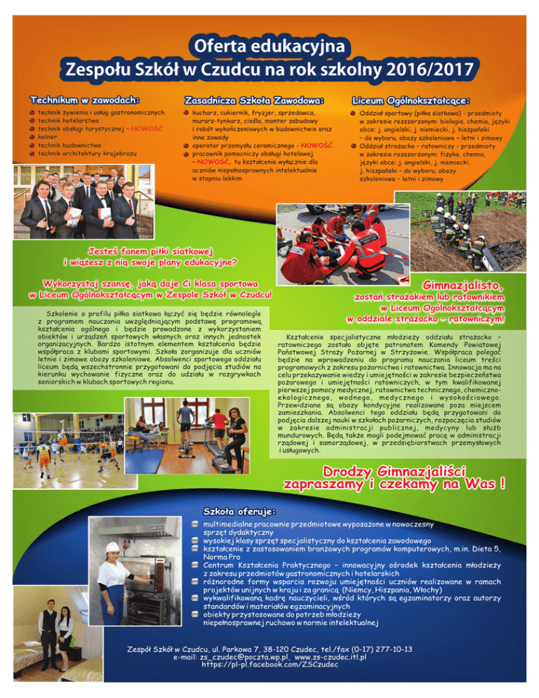 Oferta edukacyjna Zespołu Szkół w Czudcu na rok szkolny 2016/2017 Technikum w zawodach: technik żywienia i usług gastronomicznych technik hotelarstwa technik obsługi turystycznej – NOWOŚĆ kelner technik budownictwa technik architektury krajobrazu Zasadnicza Szkoła Zawodowa: kucharz, cukiernik, fryzjer, sprzedawca, murarz-tynkarz, cieśla, monter zabudowy i robót wykończeniowych w budownictwie oraz inne zawody operator przemysłu ceramicznego - NOWOŚĆ pracownik pomocniczy obsługi hotelowej – NOWOŚĆ, tu kształcenie wyłącznie dla uczniów niepełnosprawnych intelektualnie w stopniu lekkim Liceum Ogólnokształcące: Oddział sportowy (piłka siatkowa) - przedmioty w zakresie rozszerzonym: biologia, chemia, języki obce: j. angielski, j. niemiecki, j. hiszpański – do wyboru, obozy szkoleniowe – letni i zimowy Oddział strażacko – ratowniczy - przedmioty w zakresie rozszerzonym: fizyka, chemia, języki obce: j. angielski, j. niemiecki, j. hiszpański – do wyboru, obozy szkoleniowe – letni i zimowy Jesteś fanem piłki siatkowej i wiążesz z nią swoje plany edukacyjne? Wykorzystaj szansę, jaką daje Ci klasa sportowa w Liceum Ogólnokształcącym w Zespole Szkół w Czudcu! Szkolenie o profilu piłka siatkowa łączyć się będzie równolegle z programem nauczania uwzględniającym podstawę programową kształcenia ogólnego i będzie prowadzone z wykorzystaniem obiektów i urządzeń sportowych własnych oraz innych jednostek organizacyjnych. Bardzo istotnym elementem kształcenia będzie współpraca z klubami sportowymi. Szkoła zorganizuje dla uczniów letnie i zimowe obozy szkoleniowe. Absolwenci sportowego oddziału liceum będą wszechstronnie przygotowani do podjęcia studiów na kierunku wychowanie fizyczne oraz do udziału w rozgrywkach seniorskich w klubach sportowych regionu. Gimnazjalisto, zostań strażakiem lub ratownikiem w Liceum Ogólnokształcącym w oddziale strażacko – ratowniczym! Kształcenie specjalistyczne młodzieży oddziału strażacko – ratowniczego zostało objęte patronatem Komendy Powiatowej Państwowej Straży Pożarnej w Strzyżowie. Współpraca polegać będzie na wprowadzeniu do programu nauczania liceum treści programowych z zakresu pożarnictwa i ratownictwa. Innowacja ma na celu przekazywanie wiedzy i umiejętności w zakresie bezpieczeństwa pożarowego i umiejętności ratowniczych, w tym kwalifikowanej pierwszej pomocy medycznej, ratownictwa technicznego, chemicznoekologicznego, wodnego, medycznego i wysokościowego. Przewidziane są obozy kondycyjne realizowane poza miejscem zamieszkania. Absolwenci tego oddziału będą przygotowani do podjęcia dalszej nauki w szkołach pożarniczych, rozpoczęcia studiów w zakresie administracji publicznej, medycyny lub służb mundurowych. Będą także mogli podejmować pracę w administracji rządowej i samorządowej, w przedsiębiorstwach przemysłowych i usługowych. Drodzy Gimnazjaliści zapraszamy i czekamy na Was ! Szkoła oferuje: multimedialne pracownie przedmiotowe wyposażone w nowoczesny sprzęt dydaktyczny wysokiej klasy sprzęt specjalistyczny do kształcenia zawodowego kształcenie z zastosowaniem branżowych programów komputerowych, m.in. Dieta 5, Norma Pro Centrum Kształcenia Praktycznego – innowacyjny ośrodek kształcenia młodzieży z zakresu przedmiotów gastronomicznych i hotelarskich różnorodne formy wsparcia rozwoju umiejętności uczniów realizowane w ramach projektów unijnych w kraju i za granicą (Niemcy, Hiszpania, Włochy) wykwalifikowaną kadrę nauczycieli, wśród których są egzaminatorzy oraz autorzy standardów i materiałów egzaminacyjnych obiekty przystosowane do potrzeb młodzieży niepełnosprawnej ruchowo w normie intelektualnej Zespół Szkół w Czudcu, ul. Parkowa 7, 38-120 Czudec, tel./fax (0-17) 277-10-13 e-mail: [email protected], www.zs-czudec.itl.pl https://pl-pl.facebook.com/ZSCzudec