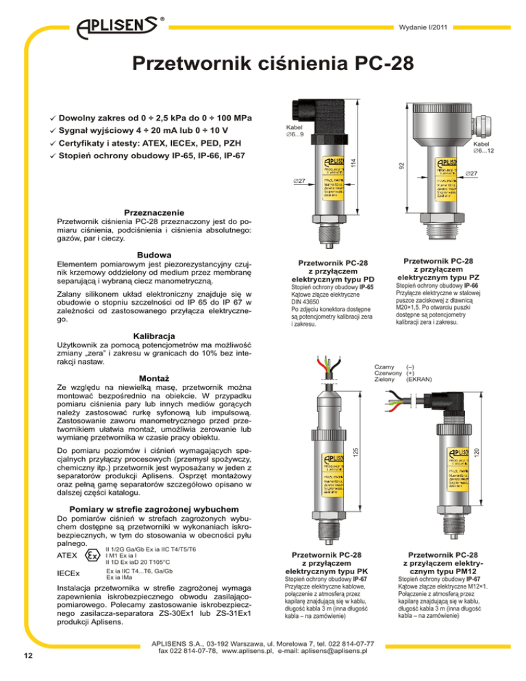 Wydanie I/2011 Przetwornik ciśnienia PC-28 Kabel Ć6...9 92 Kabel Ć6...12 114 [ Dowolny zakres od 0 ÷ 2,5 kPa do 0 ÷ 100 MPa [ Sygnał wyjściowy 4 ÷ 20 mA lub 0 ÷ 10 V [ Certyfikaty i atesty: ATEX, IECEx, PED, PZH [ Stopień ochrony obudowy IP-65, IP-66, IP-67 Ć27 Ć27 Przeznaczenie Przetwornik ciśnienia PC-28 przeznaczony jest do pomiaru ciśnienia, podciśnienia i ciśnienia absolutnego: gazów, par i cieczy. Budowa Elementem pomiarowym jest piezorezystancyjny czujnik krzemowy oddzielony od medium przez membranę separującą i wybraną ciecz manometryczną. Zalany silikonem układ elektroniczny znajduje się w obudowie o stopniu szczelności od IP 65 do IP 67 w zależności od zastosowanego przyłącza elektrycznego. Przetwornik PC-28 z przyłączem elektrycznym typu PD Stopień ochrony obudowy IP-65 Kątowe złącze elektryczne DIN 43650 Po zdjęciu konektora dostępne są potencjometry kalibracji zera i zakresu. Przetwornik PC-28 z przyłączem elektrycznym typu PZ Stopień ochrony obudowy IP-66 Przyłącze elektryczne w stalowej puszce zaciskowej z dławnicą M20×1,5. Po otwarciu puszki dostępne są potencjometry kalibracji zera i zakresu. Kalibracja Użytkownik za pomocą potencjometrów ma możliwość zmiany „zera” i zakresu w granicach do 10% bez interakcji nastaw. Czarny (–) Czerwony (+) Zielony (EKRAN) Montaż 120 Do pomiaru poziomów i ciśnień wymagających specjalnych przyłączy procesowych (przemysł spożywczy, chemiczny itp.) przetwornik jest wyposażany w jeden z separatorów produkcji Aplisens. Osprzęt montażowy oraz pełną gamę separatorów szczegółowo opisano w dalszej części katalogu. 125 Ze względu na niewielką masę, przetwornik można montować bezpośrednio na obiekcie. W przypadku pomiaru ciśnienia pary lub innych mediów gorących należy zastosować rurkę syfonową lub impulsową. Zastosowanie zaworu manometrycznego przed przetwornikiem ułatwia montaż, umożliwia zerowanie lub wymianę przetwornika w czasie pracy obiektu. Pomiary w strefie zagrożonej wybuchem Do pomiarów ciśnień w strefach zagrożonych wybuchem dostępne są przetworniki w wykonaniach iskrobezpiecznych, w tym do stosowania w obecności pyłu palnego. ATEX II 1/2G Ga/Gb Ex ia IIC T4/T5/T6 I M1 Ex ia I II 1D Ex iaD 20 T105°C IECEx Ex ia IIC T4...T6, Ga/Gb Ex ia IMa Instalacja przetwornika w strefie zagrożonej wymaga zapewnienia iskrobezpiecznego obwodu zasilającopomiarowego. Polecamy zastosowanie iskrobezpiecznego zasilacza-separatora ZS-30Ex1 lub ZS-31Ex1 produkcji Aplisens. 12 Przetwornik PC-28 z przyłączem elektrycznym typu PK Przetwornik PC-28 z przyłączem elektrycznym typu PM12 Stopień ochrony obudowy IP-67 Przyłącze elektryczne kablowe, połączenie z atmosferą przez kapilarę znajdującą się w kablu, długość kabla 3 m (inna długość kabla – na zamówienie) Stopień ochrony obudowy IP-67 Kątowe złącze elektryczne M12×1. Połączenie z atmosferą przez kapilarę znajdującą się w kablu, długość kabla 3 m (inna długość kabla – na zamówienie) APLISENS S.A., 03-192 Warszawa, ul. Morelowa 7, tel. 022 814-07-77 fax 022 814-07-78, www.aplisens.pl, e-mail: [email protected] Wydanie I/2011 SW27 max 148 Wybór przyłączy procesowych – króćców SW27 20 20 19 8 8 8 SW27 5 G1/4’’ Ć4 5 Ć25 Ć4 Typ 1/2”NPT Typ M Typ RM Typ RG Króciec 1/2”NPT, Gwint wewnętrzny G1/4” Materiał części zwilżanych: 316Lss Króciec M20×1,5, otwór Ć4 Typ G1/2 Króciec G1/2", otwór Ć4 16 kPa Ł p < 4 MPa Materiał części zwilżanych: 316Lss Zastosowanie Materiał części zwilżanych: 316Lss Tlen (wyk. spec.) – głowica przystosowana do pomiaru tlenu. Au (wyk. spec.) – złocona membrana; p ł 2,5 MPa Zastosowanie Króćce typu M i G1/2 – popularne przyłącza manometryczne – przeznaczone są do pomiaru ciśnienia niezanieczyszczonych gazów, par i cieczy we wszystkich zakresach pomiarowych. Wykonanie specjalne Au - ze złoconą membraną, zalecane jest do pomiaru ciśnienia mediów zawierających wodór lub jony wodoru w zakresach powyżej 2,5 MPa. Radiator z króćcem M Radiator z króćcem G Zastosowanie Króciec typu 1/2”NPT – przyłącze manometryczne – przeznaczony jest do pomiaru ciśnienia niezanieczyszczonych gazów, par i cieczy we wszystkich zakresach pomiarowych. Otwór w króćcu wyposażony jest dodatkowo w gwint wewnętrzny G1/4” umożliwiający podłączenie rurki impulsowej. Króćce typu RM i RG – przeznaczone są do pomiaru ciśnienia niezanieczyszczonych gazów, par i cieczy o temperaturze do 170°C, bez konieczności stosowania rurki impulsowej. SW27 SW27 O-ring 15×2 10 O-ring 26 × 2 20,5 31 G1B 10 15 10,5 2 8 SW41 Ć18 Ć30 G1/2B Ć12 Ć25 Typ CG1/2 Typ CG1 Typ P Króciec G1" z czołową membraną 10 kPa Ł p < 7 MPa Materiał części zwilżanych: 316Lss Króciec M20×1,5, otwór Ć12 Typ GP Króciec CG1/2" z czołową membraną 250 kPa Ł p < 60 MPa Materiał części zwilżanych: 316Lss Króciec G1/2", otwór Ć12 2,5 kPa Ł p Ł 35 MPa SW32 2 10 Zastosowanie Króćce typu P i GP – przyłącza manometryczne z powiększonym otworem – przeznaczone są do pomiaru ciśnienia mediów lepkich i zanieczyszczonych. Zastosowanie Króćce z czołowymi membranami przeznaczone są do pomiarów ciśnienia gazów zapylonych, oraz cieczy lepkich i krzepnących. 15 Materiał części zwilżanych: 316Lss – wyk. standard Hastelloy C-276 – wyk. spec. Ć25 Ć35 Typ CM30×2 Króciec M30×2 z czołową membraną 25 kPa Ł p < 7 MPa Materiał części zwilżanych: 316Lss – wyk. standard Przetworniki z tymi króćcami znajdują zastosowanie w przemyśle spożywczym i farmaceutycznym w instalacjach aseptycznych. Zaleca się użycie gniazd montażowych produkcji Aplisens (str. 80) z uszczelnieniem przed gwintem króćca. Przetworniki z króćcem CM30×2 mogą być montowane do standardowych złączy higienicznych typu DIN lub Clamp przy wykorzystaniu odpowiednich adapterów produkcji Aplisens (str. 8