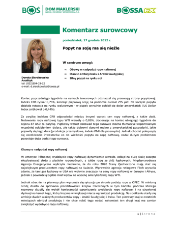 Komentarz surowcowy poniedziałek, 17 grudnia 2012 r. Popyt na soję ma się nieźle W centrum uwagi: Dorota Sierakowska Analityk tel: (022)504-33-22 e-mail: [email protected] • • • Obawy o nadpodaż ropy naftowej Starcie ambicji Iraku i Arabii Saudyjskiej Silny popyt na rynku soi Koniec poprzedniego tygodnia na rynkach towarowych odznaczał się przewagą strony popytowej. Indeks CRB zyskał 0,75%, kończąc piątkową sesję na poziomie niemal 295 pkt. Na korzyść popytu działała sytuacja na rynku walutowym - w piątek wyraźnie osłabił się dolar amerykański (US Dollar Index zniżkował o 0,44%). Za zwyżkę indeksu CRB odpowiadał między innymi wzrost cen ropy naftowej, a także zbóż. Notowania ropy naftowej typu WTI wzrosły o 0,86%, docierając na koniec ubiegłego tygodnia do rejonu 87 USD za baryłkę. Piątkowy wzrost notowań tego surowca można tłumaczyć wspomnianym wcześniej osłabieniem dolara, ale także dobrymi danymi makro z amerykańskiej gospodarki, jakie pojawiły się tego dnia (produkcja przemysłowa, indeks PMI dla przemysłu). Jednak chociaż polepszyły się oczekiwania inwestorów co do wielkości popytu na ropę naftową, nadal dużym problemem pozostaje duża podaż tego surowca. Obawy o nadpodaż ropy naftowej W Ameryce Północnej wydobycie ropy naftowej dynamicznie wzrosło, odkąd na dużą skalę zaczęto eksploatować złoża z piasków roponośnych, a także ropę ze złóż łupkowych. Międzynarodowa Agencja Energetyczna wyliczyła niedawno, że do roku 2020 Stany Zjednoczone mają stać się największym producentem ropy naftowej na świecie. Wprawdzie agencja ratingowa Fitch wyraziła zdanie, że tani gaz łupkowy w USA nie wpłynie znacząco na ceny ropy naftowej w Europie i Afryce, jednak z pewnością będzie miał wpływ na wycenę amerykańskiej ropy WTI. Jednak obecnie na pierwszy plan wysunęła się sytuacja po stronie podaży ropy w OPEC. W minioną środę doszło do spotkania przedstawicieli krajów zrzeszonych w tym kartelu, podczas którego rozmowy skupiły się wokół konieczności ograniczenia wydobycia ropy naftowej i na ożywionej dyskusji na temat tego, który kraj ma w większej mierze ograniczyć produkcję. Na spotkaniu starły się ambicje dwóch ważnych producentów ropy - Arabii Saudyjskiej i Iraku. Ten pierwszy kraj w ostatnich miesiącach obniżył produkcję i nie chce robić tego nadal, natomiast ten drugi kraj ma zamiar zwiększyć wydobycie ropy naftowej. 1|Strona Starcie ambicji Iraku i Arabii Saudyjskiej Nękany przez wiele lat wojnami i zamieszkami Irak odbudowuje swój wydobywczy potencjał i nie chce teraz się ograniczać w tej kwestii. W bieżącym roku średnie dzienne wydobycie ma wynieść 3,35 mln baryłek, a więc o 650 tysięcy baryłek dziennie niż w 2011 r. Oznacza to także największą dynamikę wzrostu wydobycia od 14 lat. Natomiast w przyszłym roku Irak ma wydobywać porównywalną ilość ropy, jak ponad trzydzieści lat temu, gdy do władzy doszedł Saddam Husajn. W 2013 r. średnie dzienne wydobycie prawdopodobnie wyniesie 3,7 mln baryłek, podczas gdy w rekordowym 1979 r. było to 3,8 mln baryłek. Arabia Saudyjska musi więc rozstrzygnąć, czy jako największy producent ropy naftowej w OPEC zdecyduje się ograniczyć wydobycie, by nie dopuścić do dalszego spadku notowań ropy naftowej na światowym rynku. Ta kwestia może stać się jeszcze bardziej istotna, jeśli Iran złagodzi swoje stanowisko w sprawie programu nuklearnego. W ostatnich dniach na rynku pojawiały się bowiem spekulacje, że Iran, dla którego zachodnie sankcje okazały się bardzo dotkliwe, jest w stanie iść na ustępstwa w kwestii programu atomowego. Jeśli faktycznie takie zdarzenie miałoby miejsce, to mogłoby to oznaczać załagodzenie sankcji amerykańskich i europejskich względem Iranu, a tym samym - możliwość większego wydobycia i eksportu ropy w tym kraju. Taki scenariusz niewątpliwie wywarłby dużą presję na spadek cen ropy naftowej, zwłaszcza gatunku Brent. Dzisiaj rano cena amerykańskiej ropy WTI pnie się delikatnie w górę, jednak nadal pozostaje ona poniżej istotnych poziomów technicznego oporu. Dzisiaj nie są planowane publikacje istotnych danych makro dla tego rynku, dlatego ewentualne wzrosty mogłyby być wspierane jedynie przez niepokojące informacje z Bliskiego Wschodu. Tymczasem jednak dużo bardziej prawdopodobnym scenariuszem jest konsolidacja cen ropy naftowej lub ich spadek na skutek obaw o nadwyżkę podaży tego surowca. Wykres 1. Notowania ropy WTI – dane dzienne. 2|Strona Silny popyt na rynku soi Strona popytowa pozostaje dzisiaj silna na rynku soi. W piątek cena tego zboża wzrosła o ponad 1,2%, a dzisiaj rośnie o kolejne pół procenta. W przeciwieństwie do rynku pszenicy, popyt na soję z USA jest duży – amerykańskie zboże jest w dużych ilościach eksportowane przede wszystkim do Chin. Dodatkowo, w piątek pojawiły się informacje National Oilseed Processors Association, z których wynika, że także popyt wewnętrzny na soję ma się nieźle – w listopadzie przerób soi w USA wyniósł 157,3 mln buszli, co jest najwyższym wynikiem od trzech lat. Czynnikiem, który dodatkowo sprzyja stronie popytowej, są niewielkie zapasy soi w Stanach Zjednoczonych, których w tym roku nie udało się odbudować. Istotną kwestią pozostaje produkcja tego zboża w Ameryce Południowej – szacuje się, że ilość zebranego wiosną zboża ma być rekordowa. Jeszcze do niedawna takie spekulacje przyczyniały się do spadku notowań soi, jednak ostatnio coraz częściej mówi się o problemach z pogodą w Argentynie i Brazylii. Oba te kraje doświadczyły suszy w ubiegłym sezonie, dlatego ograniczenie podaży soi w tych krajach byłoby bardzo niepokojące i wzmagałoby presję na wzrost cen soi. Wykres 2. Notowania soi – dane dzienne. ---Prezentowany raport został przygotowany w Wydziale Doradztwa i Analiz Rynkowych Domu Maklerskiego Banku Ochrony Ś
