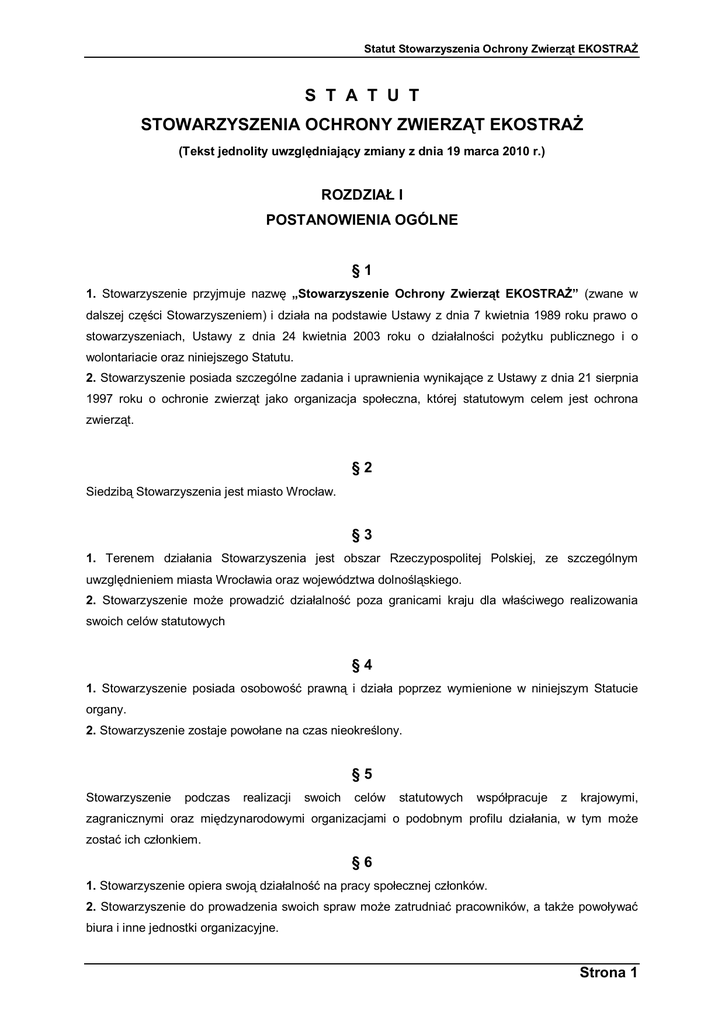 statut stowarzyszenia ochrony zwierząt ekostraż