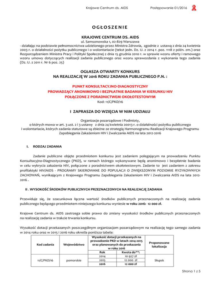 Krajowe Centrum ds. AIDS Postępowanie 01/2016 OGŁOSZENIE KRAJOWE CENTRUM DS. AIDS ul. Samsonowska 1, 02-829 Warszawa - działając na podstawie pełnomocnictwa udzielonego przez Ministra Zdrowia, zgodnie z ustawą z dnia 24 kwietnia 2003 r. o działalności pożytku publicznego i o wolontariacie (tekst jedn. Dz. U. z 2014 r. poz. 1118 z późn. zm.) oraz Rozporządzeniem Ministra Pracy i Polityki Społecznej z dnia 15 grudnia 2010 r. w sprawie wzoru oferty i ramowego wzoru umowy dotyczących realizacji zadania publicznego oraz wzoru sprawozdania z wykonania tego zadania (Dz. U. z 2011 r. Nr 6 poz. 25) OGŁASZA OTWARTY KONKURS NA REALIZACJĘ W 2016 ROKU ZADANIA PUBLICZNEGO P.N. : PUNKT KONSULTACYJNO-DIAGNOSTYCZNY PROWADZĄCY ANONIMOWO I BEZPŁATNIE BADANIA W KIERUNKU HIV POŁĄCZONE Z PORADNICTWEM OKOŁOTESTOWYM Kod: 11/C/PKD/16 I ZAPRASZA DO WZIĘCIA W NIM UDZIAŁU Organizacje pozarządowe i Podmioty, o których mowa w art. 3 ust. 2 i 3 ustawy z dnia 24 kwietnia 20013 r. o działalności pożytku publicznego i wolontariacie, których zadania statutowe są zbieżne ze strategią Harmonogramu Realizacji Krajowego Programu Zapobiegania Zakażeniom HIV i Zwalczania AIDS na lata 2012-2016 I. RODZAJ ZADANIA Zadanie publiczne objęte przedmiotem konkursu jest zadaniem polegającym na prowadzeniu Punktu Konsultacyjno-Diagnostycznego (PKD), w ramach którego wykonywane będą anonimowo i bezpłatnie badania w celu wykrycia zakażenia HIV, połączone z poradnictwem okołotestowym. Zadanie to jest zadaniem z zakresu profilaktyki HIV/AIDS - PROGRAMY SKIEROWANE DO POPULACJI O ZWIĘKSZONYM POZIOMIE RYZYKOWNYCH ZACHOWAŃ, wynikającym z Krajowego Programu Zapobiegania Zakażeniom HIV i Zwalczania AIDS na lata 20122016 . II . WYSOKOŚĆ ŚRODKÓW PUBLICZNYCH PRZEZNACZONYCH NA REALIZACJĘ ZADANIA Przewiduje się, że szacunkowa łączna wartość środków publicznych przeznaczonych na realizację zadania publicznego będącego przedmiotem niniejszego konkursu wyniesie w roku 2016: 12 000 zł. Krajowe Centrum ds. AIDS zastrzega sobie prawo do zmiany wysokości środków publicznych przeznaczonych na realizację zadania w trakcie trwania konkursu. Wysokość dotacji przekazanych poszczególnym organizacjom pozarządowym na realizację tego samego zadania w 2014 roku oraz w 2015 i 2016 roku określa poniższa tabela: Kod zadania Województwo 11/C/PKD/16 pomorskie Wysokość dotacji przekazanych na prowadzenie PKD w latach 2014-2015 oraz planowanych do przekazania w roku 2016 Rok Kwota do**: 2014 10 927 zł 2015 12 000 zł 2016 12 000 zł Proponowane lokalizacja Słupsk Strona 1 z 5 Krajowe Centrum ds. AIDS Postępowanie 01/2016 Oferent obowiązany jest dokonać kalkulacji kosztów w oparciu o taryfikator KC ds. AIDS, stanowiący załącznik nr 2 do „Procedur wyboru w roku 2016 realizatorów programów profilaktycznych przewidzianych w Harmonogramie Realizacji Krajowego Programu Zwalczania AIDS i Zapobiegania Zakażeniom HIV na lata 2012-2016”, zwanych dalej: Procedurami Wyboru, dostępnych na stronie internetowej KC ds. AIDS www.aids.gov.pl w zakładce „organizacje pozarządowe/konkursy/procedury i dokumenty”, ze szczególnym uwzględnieniem następujących zasad: 1) Stawka godzinowa doradcy wraz z pochodnymi ewentualnie obciążającymi oferenta jako pracodawcę nie może być wyższa niż 80 zł/godz.; stawka ta przy składaniu oferty może zostać podwyższona przez Oferenta wyłącznie w ramach środków pozyskanych z innych źródeł, które oferent (wraz z wysokością tych środków) powinien wskazać w ofercie; 2) Koszty obsługi zadania publicznego (koordynator, księgowa, obsługa administracyjno-organizacyjna i inne związane wyłącznie z obsługą zadania) nie mogą przekroczyć 10% kwoty dotacji wnioskowanej w Ofercie w przypadku dotacji do 100.000 zł. III. ZASADY PRZYZNAWANIA DOTACJI Dotacja budżetowa na realizację zadania publicznego objętego przedmiotem konkursu może zostać przyznana oferentowi, który: 1) złoży ofertę spełniającą wszystkie wymagania formalne i merytoryczne określone w Rozdziale 3 pkt 7 i 8 Procedur Wyboru; 2) zostanie zakwalifikowany przez Komisję Konkursową (w oparciu o kryteria oceny ofert wskazane w Rozdziale VI. pkt 2 niniejszego ogłoszenia) do realizacji zadania publicznego i przyznania na ten cel dotacji budżetowej. Dotacja celowa na realizację zadania publicznego objętego przedmiotem niniejszego konkursu przyznawana jest ze środków budżetu Ministra Zdrowia przeznaczonych na realizację zadań z zakresu problematyki HIV/AIDS - w drodze umowy zawieranej z Ministrem Zdrowia, w imieniu którego działa Krajowe Centrum ds. AIDS . Zlecanie realizacji zadania publicznego i udzielanie na ten cel dotacji budżetowej, odbywa się z zachowaniem przepisów ustawy z dnia 27 sierpnia 2009 r. o finansach publicznych (tekst jedn. Dz.U. z 2013 r. poz. 885 z późn.zm.) przy odpowiednim zastosowaniu przepisów art. 12-19 ustawy z dnia 24 kwietnia 2003 r. o działalności pożytku publicznego i o wolontariacie (tekst jedn. Dz. U. z 2014 r. poz. 1118 z późn.zm.). Zakres realizacji zadania publicznego objętego przedmiotem konkursu może zostać zmodyfikowany w stosunku do uprzednio planowanego w razie gdy ogłaszający niniejszy konkurs nie będzie dysponować wystarczającymi środkami finansowymi dla realizacji zadania publicznego w całości. IV. TERMIN I WARUNKI UBIEGANIA SIĘ O REALIZACJĘ ZADANIA PUBLICZNEGO 1. Termin realizacji zadania: od 02 stycznia 2016 r. do 31 grudnia 2016 r. 2. Warunki ubiegania się o realizację zadania publicznego: O realizację zadania może ubiegać się każdy oferent, który spełnia wszystkie wymienione niżej warunki: 1) posiada status organizacji pozarządowej w rozumieniu art. 3 ust. 2 ustawy o działalności pożytku publicznego i o wolontariacie, lub podmiotu, o którym mowa w art. 3 ust. 3 cyt. ustawy; 2) jego zadania statutowe są zbieżne z obszarem, którego dotyczy otwarty konkurs ofert; 3) jest wiarygo
