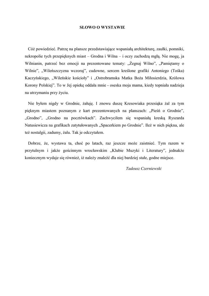 SŁOWO O WYSTAWIE Cóż powiedzieć. Patrzę na plansze przedstawiające wspaniałą architekturę, zaułki, pomniki, nekropolie tych przepięknych miast – Grodna i Wilna – i oczy zachodzą mgłą. Nie mogę, ja Wilnianin, patrzeć bez emocji na prezentowane tematy: „Żegnaj Wilno”, „Pamiętamy o Wilnie”, „Wileńszczyzna wczoraj”, cudowne, sercem kreślone grafiki Antoniego (Tośka) Kaczyńskiego, „Wileńskie kościoły” i „Ostrobramska Matka Boża Miłosierdzia, Królowa Korony Polskiej”. To w Jej opiekę oddała mnie - oseska moja mama, kiedy topniała nadzieja na utrzymaniu przy życiu. Nie byłem nigdy w Grodnie, żałuję. I znowu duszę Kresowiaka przesiąka żal za tym pięknym miastem poznanym z kart prezentowanych na planszach: „Pieśń o Grodnie”, „Grodno”, „Grodno na pocztówkach”. Zachwyciłem się wspaniałą kreską Ryszarda Natusiewicza na grafikach zatytułowanych „Spacerkiem po Grodnie”. Ileż w nich piękna, ale też nostalgii, zadumy, żalu. Tak je odczytałem. Dobrze, że, wystawa ta, choć po latach, raz jeszcze może zaistnieć. Tym razem w przytulnym i jakże gościnnym wrocławskim „Klubie Muzyki i Literatury”, jednakże koniecznym wydaje się również, iż należy znaleźć dla niej bardziej stałe, godne miejsce. Tadeusz Czerniewski