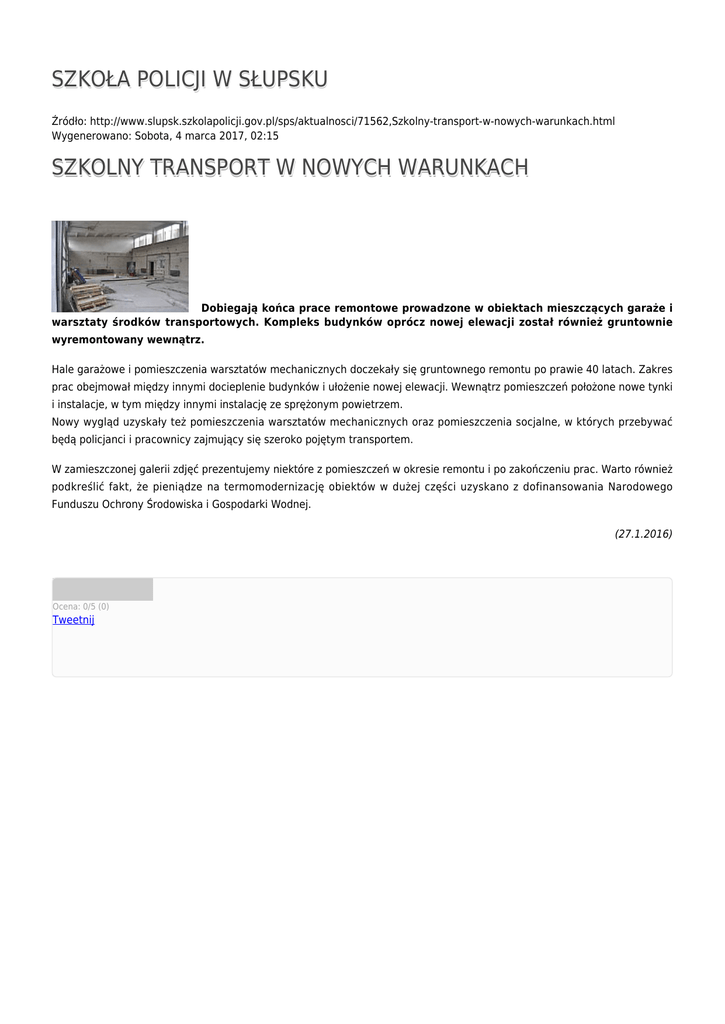 SZKOŁA POLICJI W SŁUPSKU Źródło: http://www.slupsk.szkolapolicji.gov.pl/sps/aktualnosci/71562,Szkolny-transport-w-nowych-warunkach.html Wygenerowano: Sobota, 4 marca 2017, 02:15 SZKOLNY TRANSPORT W NOWYCH WARUNKACH Dobiegają końca prace remontowe prowadzone w obiektach mieszczących garaże i warsztaty środków transportowych. Kompleks budynków oprócz nowej elewacji został również gruntownie wyremontowany wewnątrz. Hale garażowe i pomieszczenia warsztatów mechanicznych doczekały się gruntownego remontu po prawie 40 latach. Zakres prac obejmował między innymi docieplenie budynków i ułożenie nowej elewacji. Wewnątrz pomieszczeń położone nowe tynki i instalacje, w tym między innymi instalację ze sprężonym powietrzem. Nowy wygląd uzyskały też pomieszczenia warsztatów mechanicznych oraz pomieszczenia socjalne, w których przebywać będą policjanci i pracownicy zajmujący się szeroko pojętym transportem. W zamieszczonej galerii zdjęć prezentujemy niektóre z pomieszczeń w okresie remontu i po zakończeniu prac. Warto również podkreślić fakt, że pieniądze na termomodernizację obiektów w dużej części uzyskano z dofinansowania Narodowego Funduszu Ochrony Środowiska i Gospodarki Wodnej. (27.1.2016) Ocena: 0/5 (0) Tweetnij