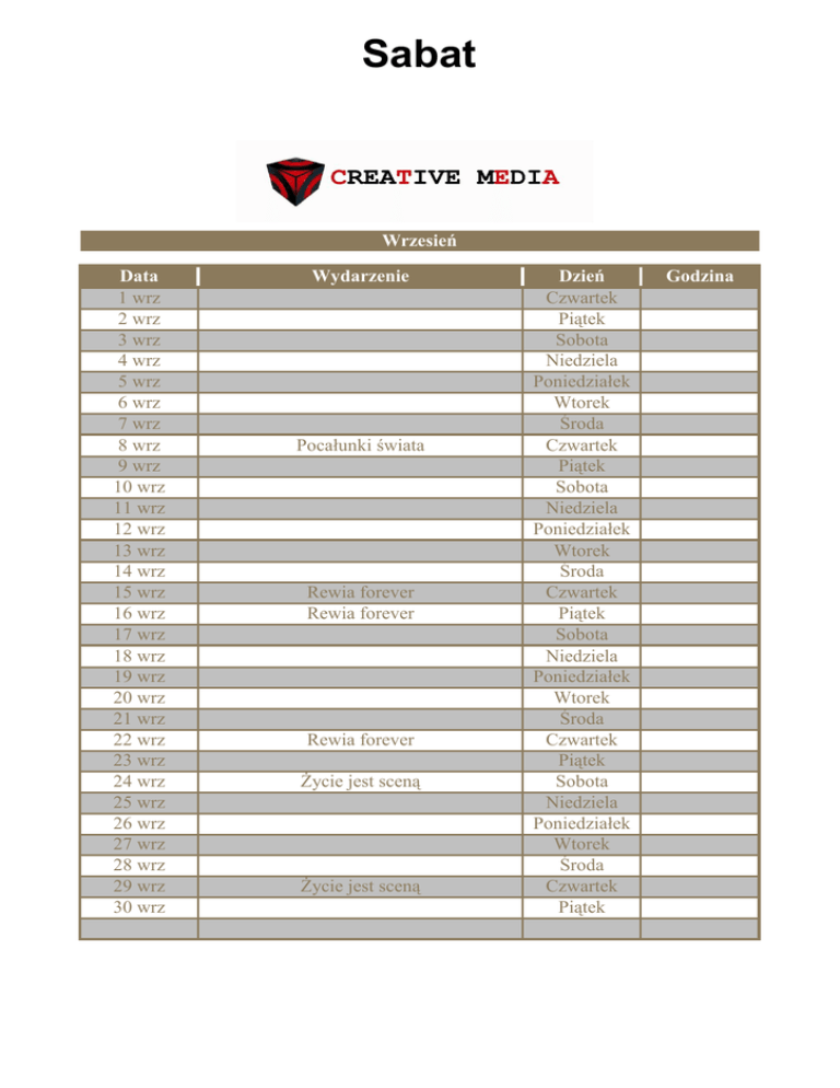 Sabat Wrzesień Data 1 wrz 2 wrz 3 wrz 4 wrz 5 wrz 6 wrz 7 wrz 8 wrz 9 wrz 10 wrz 11 wrz 12 wrz 13 wrz 14 wrz 15 wrz 16 wrz 17 wrz 18 wrz 19 wrz 20 wrz 21 wrz 22 wrz 23 wrz 24 wrz 25 wrz 26 wrz 27 wrz 28 wrz 29 wrz 30 wrz Wydarzenie Pocałunki świata Rewia forever Rewia forever Rewia forever Życie jest sceną Życie jest sceną Dzień Czwartek Piątek Sobota Niedziela Poniedziałek Wtorek Środa Czwartek Piątek Sobota Niedziela Poniedziałek Wtorek Środa Czwartek Piątek Sobota Niedziela Poniedziałek Wtorek Środa Czwartek Piątek Sobota Niedziela Poniedziałek Wtorek Środa Czwartek Piątek Godzina