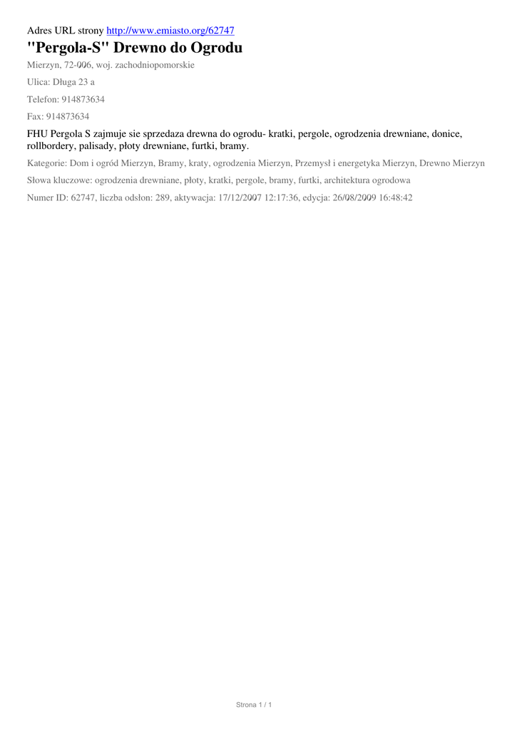 Adres URL strony http://www.emiasto.org/62747 "Pergola-S" Drewno do Ogrodu Mierzyn, 72-006, woj. zachodniopomorskie Ulica: Długa 23 a Telefon: 914873634 Fax: 914873634 FHU Pergola S zajmuje sie sprzedaza drewna do ogrodu- kratki, pergole, ogrodzenia drewniane, donice, rollbordery, palisady, płoty drewniane, furtki, bramy. Kategorie: Dom i ogród Mierzyn, Bramy, kraty, ogrodzenia Mierzyn, Przemysł i energetyka Mierzyn, Drewno Mierzyn Słowa kluczowe: ogrodzenia drewniane, płoty, kratki, pergole, bramy, furtki, architektura ogrodowa Numer ID: 62747, liczba odsłon: 289, aktywacja: 17/12/2007 12:17:36, edycja: 26/08/2009 16:48:42 Strona 1 / 1
