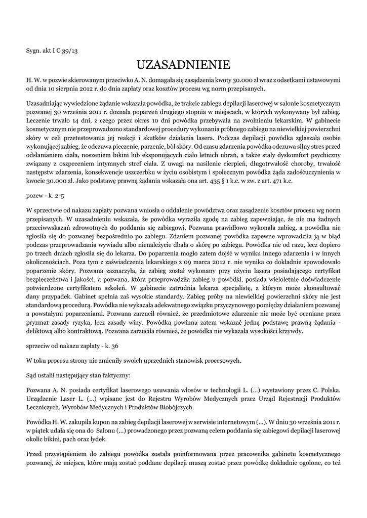 Sygn. akt I C 39/13 UZASADNIENIE H. W. w pozwie skierowanym przeciwko A. N. domagała się zasądzenia kwoty 30.000 zł wraz z odsetkami ustawowymi od dnia 10 sierpnia 2012 r. do dnia zapłaty oraz kosztów procesu wg norm przepisanych. Uzasadniając wywiedzione żądanie wskazała powódka, że trakcie zabiegu depilacji laserowej w salonie kosmetycznym pozwanej 30 września 2011 r. doznała poparzeń drugiego stopnia w miejscach, w których wykonywany był zabieg. Leczenie trwało 14 dni, z czego przez okres 10 dni powódka przebywała na zwolnieniu lekarskim. W gabinecie kosmetycznym nie przeprowadzono standardowej procedury wykonania próbnego zabiegu na niewielkiej powierzchni skóry w celi przetestowania jej reakcji i skutków działania lasera. Podczas depilacji powódka zgłaszała osobie wykonującej zabieg, że odczuwa pieczenie, parzenie, ból skóry. Od czasu zdarzenia powódka odczuwa silny stres przed odsłanianiem ciała, noszeniem bikini lub eksponujących ciało letnich ubrań, a także stały dyskomfort psychiczny związany z oszpeceniem intymnych stref ciała. Z uwagi na nasilenie cierpień, długotrwałość choroby, trwałość następstw zdarzenia, konsekwencje uszczerbku w życiu osobistym i społecznym powódka żąda zadośćuczynienia w kwocie 30.000 zł. Jako podstawę prawną żądania wskazała ona art. 435 § 1 k.c. w zw. z art. 471 k.c. pozew - k. 2-5 W sprzeciwie od nakazu zapłaty pozwana wniosła o oddalenie powództwa oraz zasądzenie kosztów procesu wg norm przepisanych. W uzasadnieniu wskazała, że powódka wyraziła zgodę na zabieg zapewniając, że nie ma żadnych przeciwwskazań zdrowotnych do poddania się zabiegowi. Pozwana prawidłowo wykonała zabieg, a powódka nie zgłosiła się do pozwanej bezpośrednio po zabiegu. Zdaniem pozwanej powódka zapewne wprowadziła ją w błąd podczas przeprowadzania wywiadu albo nienależycie dbała o skórę po zabiegu. Powódka nie od razu, lecz dopiero po trzech dniach zgłosiła się do lekarza. Do poparzenia mogło zatem dojść w wyniku innego zdarzenia i w innych okolicznościach. Poza tym z zaświadczenia lekarskiego z 09 marca 2012 r. nie wynika co dokładnie spowodowało poparzenie skóry. Pozwana zaznaczyła, że zabieg został wykonany przy użyciu lasera posiadającego certyfikat bezpieczeństwa i jakości, a pozwana, która przeprowadziła zabieg u powódki, posiada wieloletnie doświadczenie potwierdzone certyfikatem szkoleń. W gabinecie zatrudnia lekarza specjalistę, z którym może skonsultować dany przypadek. Gabinet spełnia zaś wysokie standardy. Zabieg próby na niewielkiej powierzchni skóry nie jest standardową procedurą. Powódka nie wykazała adekwatnego związku przyczynowego pomiędzy działaniem pozwanej a powstałymi poparzeniami. Pozwana zarzucił również, że przedmiotowe zdarzenie nie może być oceniane przez pryzmat zasady ryzyka, lecz zasady winy. Powódka powinna zatem wskazać jedną podstawę prawną żądania deliktową albo kontraktową. Pozwana zarzuciła również, że powódka nie wykazała wysokości krzywdy. sprzeciw od nakazu zapłaty - k. 36 W toku procesu strony nie zmieniły swoich uprzednich stanowisk procesowych. Sąd ustalił następujący stan faktyczny: Pozwana A. N. posiada certyfikat laserowego usuwania włosów w technologii L. (...) wystawiony przez C. Polska. Urządzenie Laser L. (...) wpisane jest do Rejestru Wyrobów Medycznych przez Urząd Rejestracji Produktów Leczniczych, Wyrobów Medycznych i Produktów Biobójczych. Powódka H. W. zakupiła kupon na zabieg depilacji laserowej w serwisie internetowym (...). W dniu 30 września 2011 r. w piątek udała się ona do Salonu (...) prowadzonego przez pozwaną celem poddania się zabiegowi depilacji laserowej okolic bikini, pach oraz łydek. Przed przystąpieniem do zabiegu powódka została poinformowana przez pracownika gabinetu kosmetycznego pozwanej, że miejsca, które mają zostać poddane depilacji muszą zostać przez powódkę dokładnie ogolone, co też powódka uczyniła. Następnie pozwana przeprowadziła z powódką wywiad zdrowotny celem ustalenia, czy powódka kwalifikuje się do zabiegu. Powódka nie cierpiała na żadne ze schorzeń wskazanych w ankiecie zabiegowej. Pozwana nie wykonała próbnego zabiegu na niewielkiej powierzchni skóry w celu przetestowania reakcji organizmu powódki i skutków oddziaływania lasera. Podczas zabiegu wykonywanego za pomocą urządzenia Laser L. S. powódka zgłaszała, iż odczuwa pieczenie, parzenie i ból w miejscach, w których przeprowadzano depilację. Pozwana zapewniała ją wówczas, że depilacja laserowa nie jest zabiegiem relaksacyjnym. Po wykonanym zabiegu depilacji pozwana poleciła powódce, aby miejsca wydepilowane smarować maścią A.. Powódka do wskazówek tych zastosowała się. dowód: oferta internetowa - k. 26, karta zabiegowa - k. 44-45, certyfikat wraz z tłumaczeniem - k. 46-47, specyfikacja urządzenia wraz z zaświadczeniem - k. 48-51, zeznania powódki - k. 71-73, 153-157, częściowo zeznania pozwanej k.73-75, 155-156 Po powrocie do domu powódka zaobserwowała, iż miejsca, w których przeprowadzana była depilacja są poparzone. Celem złagodzenia odczuwanego bólu brała ona środki przeciwbólowe, a miejsca wydepilowane smarowała ww. maścią. Próby kontaktu w sobotę z gabinetem kosmetycznym pozwanej nie powiodły się. W dniu 03 października 2011 r. w poniedziałek powódka udała się do lekarza zaobserwowawszy strupy w miejscach depilowanych. Lekarz zdiagnozował poparzenia laserowe. Leczenie oparzeń trwało 14 dni, przy czym w ciągu 10 dni (od 03 października do 12 października) powódka przebywała na zwolnieniu lekarskim. Przez tydzień odczuwała ból okolic depilowanych, a w miejscach depilacji widoczne były liczne strupy, które zaczęły powoli schodzić. Przez tydzień powódka nie chodziła do pracy. Odczuwała ból przy noszeniu ubrania. Pomimo zakończonego leczenia, w miejscach depil