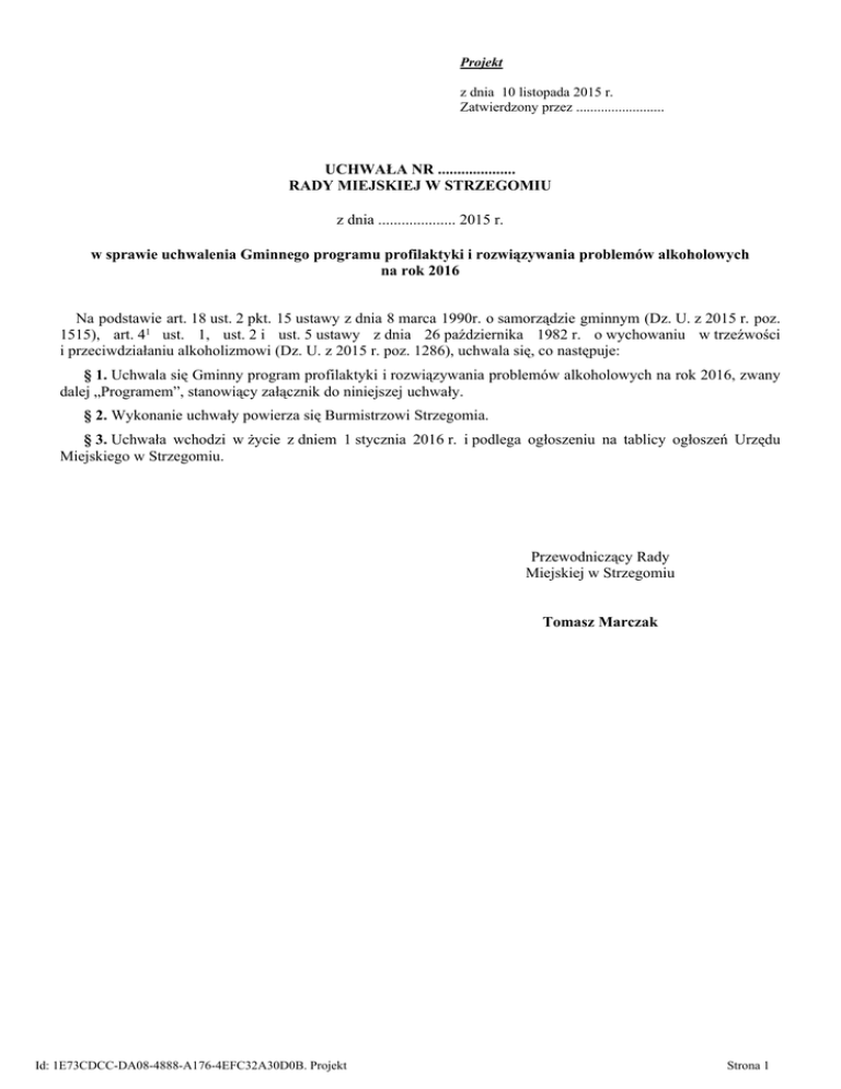 Projekt z dnia 10 listopada 2015 r. Zatwierdzony przez ......................... UCHWAŁA NR .................... RADY MIEJSKIEJ W STRZEGOMIU z dnia .................... 2015 r. w sprawie uchwalenia Gminnego programu profilaktyki i rozwiązywania problemów alkoholowych na rok 2016 Na podstawie art. 18 ust. 2 pkt. 15 ustawy z dnia 8 marca 1990r. o samorządzie gminnym (Dz. U. z 2015 r. poz. 1515), art. 41 ust. 1, ust. 2 i ust. 5 ustawy z dnia 26 października 1982 r. o wychowaniu w trzeźwości i przeciwdziałaniu alkoholizmowi (Dz. U. z 2015 r. poz. 1286), uchwala się, co następuje: § 1. Uchwala się Gminny program profilaktyki i rozwiązywania problemów alkoholowych na rok 2016, zwany dalej „Programem”, stanowiący załącznik do niniejszej uchwały. § 2. Wykonanie uchwały powierza się Burmistrzowi Strzegomia. § 3. Uchwała wchodzi w życie z dniem 1 stycznia 2016 r. i podlega ogłoszeniu na tablicy ogłoszeń Urzędu Miejskiego w Strzegomiu. Przewodniczący Rady Miejskiej w Strzegomiu Tomasz Marczak Id: 1E73CDCC-DA08-4888-A176-4EFC32A30D0B. Projekt Strona 1 Załącznik do Uchwały Nr .................... Rady Miejskiej w Strzegomiu z dnia....................2015 r. GMINNY PROGRAM PROFILAKTYKI I ROZWIĄZYWANIA PROBLEMÓW ALKOHOLOWYCH NA ROK 2016 Rozdział 1. WPROWADZENIE Przepisy ustawy z dnia 26 października 1982 r. o wychowaniu w trzeźwości i przeciwdziałaniu alkoholizmowi stanowią, że prowadzenie działań związanych z profilaktyką i rozwiązywaniem problemów alkoholowych oraz integracji społecznej osób uzależnionych od alkoholu należy do zadań własnych gminy. Podstawowym aktem prawnym, na podstawie którego prowadzona jest realizacja wskazanych działań, jest gminny program profilaktyki i rozwiązywania problemów alkoholowych uchwalany corocznie przez Radę Gminy. Realizatorem Programu jest Burmistrz Strzegomia.W realizacji zadań współpracuje z Gminną Komisją Rozwiązywania Problemów Alkoholowych. Zadania zawarte w Gminnym Programie Profilaktyki i Rozwiązywania Problemów Alkoholowych na rok 2016 są kontynuacją zadań realizowanych w ubiegłych latach z wykorzystaniem danych zawartych w opracowanej w 2013 r. Diagnozie Lokalnych Zagrożeń Społecznych dla Gminy Strzegom. Rozdział 2. CELE PROGRAMU Celami programu są: 1) zmniejszenie rozmiaru istniejących problemów alkoholowych, zapobieganie powstawaniu nowych przypadków uzależnienia; 2) edukacja publiczna dotycząca konsekwencji nadużywania alkoholu, metod zapobiegania szkodom zdrowotnym, a także promująca zdrowy styl życia, trzeźwość i abstynencję; 3) promocja zdrowego i wolnego od używek stylu życia; 4) ograniczenie procesu degradacji osób uzależnionych i ich rodzin oraz osób zagrożonych uzależnieniem; 5) zwiększenie skuteczności i dostępności do pomocy terapeutycznej i rehabilitacyjnej dla osób uzależnionych i współuzależnionych; 6) przeciwdziałanie przemocy w rodzinach, w których występują problemy związane z uzależnieniem oraz udzielanie im pomocy psychospołecznej i prawnej; 7) prowadzenie profilaktycznej działalności informacyjnej i edukacyjnej kierowanej w szczególności dla dzieci i młodzieży szkolnej, w tym prowadzenie pozalekcyjnych zajęć sportowych z programem profilaktycznym. Dożywianie dzieci uczestniczących w pozalekcyjnych programach opiekuńczowychowawczych i socjoterapeutycznych; 8) wspieranie zatrudnienia socjalnego osób uzależnionych od alkoholu po zakończonym programie psychoterapii w zakładzie lecznictwa odwykowego; 9) wspomaganie działalności instytucji, stowarzyszeń i osób fizycznych służących rozwiązywaniu problemów alkoholowych, wynikających z uzależnienia; 10) zmniejszanie rozmiarów naruszeń przepisów prawa w zakresie obrotu i spożywania napojów alkoholowych. Id: 1E73CDCC-DA08-4888-A176-4EFC32A30D0B. Projekt Strona 1 Rozdział 3. ZADANIA PROGRAMU Zadaniami programu są: 1) Zwiększanie dostępności pomocy terapeutycznej i rehabilitacyjnej dla osób uzależnionych od alkoholu. Udzielanie rodzinom, w których występują problemy alkoholowe, pomocy psychospołecznej i prawnej, a w szczególności ochrony przed przemocą w rodzinie: a) pomoc informacyjna i psychologiczna, porady, konsultacje dla osób uzależnionych od alkoholu oraz członków ich rodzin, b) motywowanie przez Gminną Komisję Rozwiązywania Problemów Alkoholowych osób uzależnionych do podjęcia leczenia, podejmowanie czynności zmierzających do orzeczenia o zastosowaniu obowiązku poddania się leczeniu odwykowemu wobec osób, które w związku nadużywaniem alkoholu powodują rozkład życia rodzinnego, demoralizację małoletnich oraz systematycznie zakłócają spokój lub porządek publiczny, c) prowadzenie specjalistycznych miejsc pomocy dla ofiar przemocy domowej (dorosłych i dzieci): - w grupie wsparcia dla osób współuzależnionych, w grupie wsparcia dla ofiar przemocy w rodzinie, w grupie motywacyjnej dla osób z problemem alkoholowym, - w punkcie interwencji kryzysowej udzielającym pomocy w sytuacjach kryzysowych - zapobieganie przemocy domowej, interwencji wobec sprawców przemocy, pomocy prawnej, terapeutycznej, psychologicznej. Współpraca punktu m.in. ze schroniskami dla ofiar przemocy domowej, policją, - wspieranie bazy lokalowej dla ww. grup terapeutycznych, d) zakup materiałów informacyjno-edukacyjnych i czasopism problemowych dla klientów punktów terapeutycznych oraz instytucji i organizacji współpracujących z Gminną Komisją Rozwiązywania Problemów Alkoholowych - Klub Abstynenta, Policja, szkoły, e) prowadzenie działalności edukacyjnej służącej zmniejszeniu skali zjawiska przemocy w rodzinie związanej z problemem alkoholowym, f) prowadzenie badań w środowisku lokalnym, g) szkolenia z zakresu profilaktyki i rozwiązywania problemów uzależnień dla pomagających uzależnionym i ich rodzinom: - szkolenia dla przedstawicieli różnych grup zawodowych, m.in. dla pedagogów, nauczycieli, policji, 