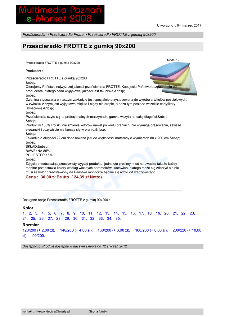Utworzono : 04 marzec 2017 Prześcieradła > Prześcieradła Frotte > Prześcieradło FROTTE z gumką 90x200 Prześcieradło FROTTE z gumką 90x200 Model : - Prześcieradło FROTTE z gumką 90x200 Producent : Prześcieradło FROTTE z gumką 90x200 Oferujemy Państwu najwyższej jakości prześcieradła FROTTE. Kupujecie Państwo bezpośrednio od producenta, dlatego cena wyjątkowej jakości jest tak niska. Dzianina stosowana w naszym zakładzie jest specjalnie przystosowana do wyrobu artykułów pościelowych, w zwiazku z czym jest wyjątkowo miękka i nigdy nie drapie, a poza tym posiada wszelkie certyfikaty jakościowe. Prześcieradła szyte są na profesjonalnych maszynach, gumka wszyta na całej długości. Produkt w 100% Polski, nie zmienia kolorów nawet po wielu praniach, nie wymaga prasowania, zawsze elegancki i oczywiście nie kurczy się w praniu. Zakładka o długości 22 cm dopasowana jest do większości materacy o wymiarach 80 x 200 cm. SKŁAD: BAWEŁNA 85% POLIESTER 15%. Zdjęcia przedstawiają rzeczywisty wygląd produktu, jednakże prosimy mieć na uwadze fakt że każdy monitor przedstawia kolory według własnych parametrów i ustawień, dlatego może się zdarzyć ale nie musi że kolor przedstawiony na Państwa monitorze będzie się różnił od rzeczywistego. P X Cena : 30,00 zł Brutto ( 24,39 zł Netto) E T L O Dostępne opcje Prześcieradło FROTTE z gumką 90x200 : Kolor 1, 2, 3, 4, 5, 6, 7, 8, 9, 10, 11, 12, 13, 14, 15, 16, 17, 18, 19, 20, 21, 22, 23, 24, 25, 26, 27, 28, 29, 30, 31, 32, 33, 34, 35. Rozmiar 120/200 (+ 2,00 zł), zł), 90/200. 140/200 (+ 4,00 zł), 160/200 (+ 6,00 zł), Dostępność: Produkt dostępny w naszym sklepie od 12 styczeń 2012 kontakt : - [email protected] Strona 1/{nb} 180/200 (+ 8,00 zł), 200/220 (+ 10,00