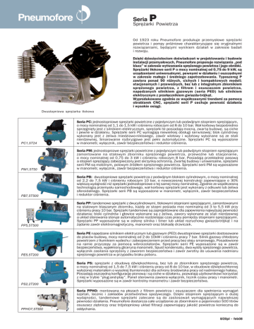 Seria P Sprê¿arki Powietrza Od 1923 roku Pneumofore produkuje przemys³owe sprê¿arki powietrza i pompy pró¿niowe charakteryzuj¹ce siê oryginalnymi rozwi¹zaniami, bêd¹cymi wynikiem dzia³añ w zakresie badañ i rozwoju. Dziêki dziesiêcioleciom doœwiadczeñ w projektowaniu i budowie instalacji przemys³owych, Pneumofore proponuje rozwi¹zania „pod klucz” w zakresie wytwarzania sprê¿onego powietrza i jego obróbki. Sprê¿arki t³okowe serii P o mocy nominalnej od 0,75 do 9 kW, s¹ urz¹dzeniami uniwersalnymi, pewnymi w dzia³aniu i oszczêdnymi w zakresie ma³ego i œredniego zapotrzebowania. Typoszereg P zawiera ponad 90 ró¿nych, cichych i kompaktowych modeli; stacjonarnych i przewoŸnych, bez lub z integralnym zbiornikiem sprê¿onego powietrza, z filtrem i osuszaczem powietrza, napêdzanych silnikiem gazowym (seria PED) lub silnikiem elektrycznym z prze³¹cznikiem gwiazda-trójk¹t. Wyprodukowane zgodnie ze wspó³czesnymi trendami za pomoc¹ obrabiarek CNC, sprê¿arki serii P cechuje pewnoœæ dzia³ania i wysokie osi¹gi. Dwustopniowa sprê¿arka t³okowa PC1,5T24 Seria PC: jednostopniowe sprê¿arki powietrzne z pojedynczym lub podwójnym stopniem sprê¿aj¹cym, o mocy nominalnej od 1,1 do 1,5 kW i ciœnieniu roboczym od 8 do 10 bar. Wa³ korbowy bezpoœrednio sprzêgniêty jest z silnikiem elektrycznym, sprê¿arki te posiadaj¹ mocn¹, zwart¹ budowê, s¹ ciche i pewne w dzia³aniu. Sprê¿arki serii PC wymagaj¹ niewielkiej obs³ugi serwisowej; blok cylindrowy wykonany jest z ¿eliwa miedziowo-niklowego, zawór wlotowy i wylotowy wykonane s¹ ze stali nierdzewnej, Smarowanie rozbr yzgowe jest pe³ni automatyczne. Sprê¿arki PC s¹ wyposa¿one w manometr, wy³¹cznik, zawór bezpieczeñstwa i reduktor ciœnienia. PM1,5T50 Seria PM: jednostopniowe sprê¿arki powietrzne z pojedynczym lub podwójnym stopniem sprê¿aj¹cym zamontowane na stalowym zbiorniku sprê¿onego powietrza, przewoŸne lub stacjonarne, o mocy nominalnej od 0,75 do 3 kW i ciœnieniu roboczym 8 bar. Posiadaj¹ przek³adniê pasow¹ a stopieñ sprê¿aj¹cy zabezpieczony jest skrzynk¹ ochronn¹. Zwartej budowy i uniwersalne, sprê¿arki serii PM s¹ mobilnym, polowym Ÿród³em sprê¿onego powietrza. Sprê¿arki serii PM s¹ wyposa¿one w manometr, wy³¹cznik, zawór bezpieczeñstwa i reduktor ciœnienia. PB7,5T500 Seria PB: dwustopniowe sprê¿arki powietrza z podwójnym blokiem cylindrowym, o mocy nominalnej od 2,2 do 7,5 kW i ciœnieniu roboczym 10 bar, o nowoczesnej konstrukcji zapewniaj¹ce o 30% wiêksz¹ wydajnoœæ ni¿ sprê¿arki jednostopniowe o tej samej mocy nominalnej. Zgodnie ze wspó³czesn¹ technologi¹ przemys³u samochodowego, wa³ korbowy sprê¿arki jest wykonany z odkuwki lub ¿eliwa sferoidalnego. Sprê¿arki serii PB s¹ wyposa¿one w manometr, wy³¹cznik, zawór bezpieczeñstwa i reduktor ciœnienia. PP5,5T500 Seria PP: tandemowe sprê¿arki z dwucylindrowymi, t³okowymi stopniami sprê¿aj¹cymi, zamontowanymi na stalowym blaszanym zbiorniku, ka¿dy ze stopni posiada moc nominaln¹ od 3 to 5,5 kW przy ciœnieniu pracy 10 bar. Sprê¿arki tandemowe s¹ zaprojektowane dla zapewnienia najwy¿szej pewnoœci dzia³ania; bloki cylindrów i g³owice wykonane s¹ z ¿eliwa, zawor y wykonane ze stali nierdzewnej a uk³ad sterowania steruje automatycznie rozdzielaj¹c czas pracy pomiêdzy stopniami sprê¿aj¹cymi. Sprê¿arki PP wyposa¿one s¹ w os³onê silnika i timer lub uk³ad rozruchowy gwiazda-trójk¹t i na ¿¹danie zawór elektromagnetyczny, manometr oraz blokadê drzwiczek. PE5,5T200 Seria PE napêdzane silnikiem elektrycznym lub gazowym (PED) dwustopniowe sprê¿arki dostosowane do placów budowy, mocy nominalnej od 2 do 10kW i ciœnieniu pracy 7 bar. Silnik gazowy ch³odzony powietrzem z t³umikiem wydechu i zabezpieczeniem przed prac¹ bez oleju smarowego, Posadowione na ramie przyczepy za pomoc¹ wibroizolatorów. Sprê¿arki serii PE wyposa¿one s¹ w zawór bezpieczeñstwa, wype³niony gliceryn¹ manometr, Spust kondensatu, dwa wyloty sprê¿onego powietrza, wy³¹cznik zasilania sprzê¿ony z zaworem bezpieczeñstwa i zawór zwrotny do usuwania nadmiaru sprê¿onego powietrza w przypadku braku poboru. PS2,2T200 PPHO7,5T500 Seria PS: sprê¿arki z obudow¹ dŸwiêkoch³onn¹, bez lub ze zbiornikiem sprê¿onego powietrza, o mocy nominalnej od 1,5 do 7,5 kW i ciœnieniu pracy od 8 do 10 bar, w obudowie dŸwiêkoch³onnej wy³o¿onej materia³em o wysokiej t³umiennoœci dla ochrony œrodowiska pracy od nadmiernego ha³asu. Posiadaj¹ oszczêdn¹ konfiguracjê pionow¹ i s¹ ciche w dzia³aniu, pozwalaj¹ u¿ytkownikowi korzystaæ z niej w trybie “plug-and-play”. Panel sterownia zawiera wy³¹cznik, licznik czasu pracy i manometr. Sprê¿arki wyposa¿one s¹ w zawór kontrolny manometru i zawór bezpieczeñstwa. Seria PPHO: montowana na p³ozach z filtrem powietrza i osuszaczem dla spe³nienia wymagañ szpitali, lecznic i zak³adów przetwórstwa spo¿ywczego. Dziêki stopniom sprê¿aj¹cym o du¿ej wydajnoœci, tandemowe sprê¿arki zalecane s¹ do zastosowañ wymagaj¹cych najwiêkszej pewnoœci dzia³ania. Pneumofore dostarcza ca³e urz¹dzenie ze zbiornikiem o pojemnoœci 500 litrów osuszacz ziêbniczy oraz trójstopniowy uk³ad filtracji zapewniaj¹cy jakoœæ powietrza konieczn¹ do oddychania. 8/20pl - feb08 Seria P Sprê¿arki Powietrza Dane silników Model PC0,75 PC1,1* PC1,5F PC1,5 PC1,8 PM0,75 PM1,1 PM1,1F PM1,5 PM2,2 PM3 PB2,2 PB2,2F PB3 PB4** PB5,5** PB7,5 PP3 PP4** PP4HO** PP5,5** PP5,5HO** PP7,5HO** PE3 PE4 PE5,5 PE7,5 PE9 PED5,5*** PED9*** PED11*** PED13*** PS1,5 PS2,2 PS2,2F PS3F PS3 PS4** PS5,5** PS5,5F** PS7,5** 230V 1 faz 400 V 3 faz Diesel kW 0,75 1,1 1,5 1,5 1,8 0,75 1,1 1,1 1,5 2,2 2,2 5,5 7,5 2x4 2 x 5,5 1,5 2,2 - kW 1,1 1,1 1,5 2,2 3 2,2 2,2 3 4 5,5 7,5 2x3 2x4 2x4 2 x 5,5 2 x 5,5 2 x 7,5 3 4 5,5 7,5 9 1,5 2,2 2,2 3 3 4 5,5 5,5 7,5 HP 5,5 9 11 13 - Wydajnoœæ Ciœnienie m3/h 7,2 9 12 14,4 14,4 7,2 9 13 17 24 29 19 20 30 