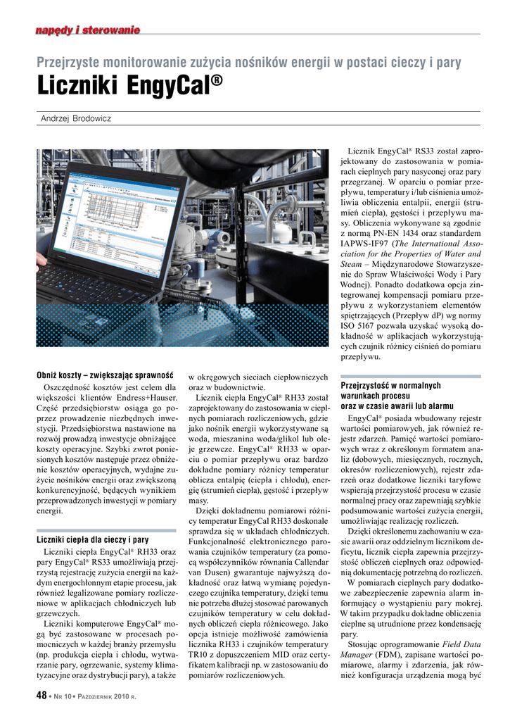 Przejrzyste monitorowanie zużycia nośników energii w postaci cieczy i pary Liczniki EngyCal® Andrzej Brodowicz Licznik EngyCal® RS33 został zaprojektowany do zastosowania w pomiarach cieplnych pary nasyconej oraz pary przegrzanej. W oparciu o pomiar przepływu, temperatury i/lub ciśnienia umożliwia obliczenia entalpii, energii (strumień ciepła), gęstości i przepływu masy. Obliczenia wykonywane są zgodnie z normą PN-EN 1434 oraz standardem IAPWS-IF97 (The International Association for the Properties of Water and Steam – Międzynarodowe Stowarzyszenie do Spraw Właściwości Wody i Pary Wodnej). Ponadto dodatkowa opcja zintegrowanej kompensacji pomiaru przepływu z wykorzystaniem elementów spiętrzających (Przepływ dP) wg normy ISO 5167 pozwala uzyskać wysoką dokładność w aplikacjach wykorzystujących czujnik różnicy ciśnień do pomiaru przepływu. Obniż koszty – zwiększając sprawność Oszczędność kosztów jest celem dla większości klientów Endress+Hauser. Część przedsiębiorstw osiąga go poprzez prowadzenie niezbędnych inwestycji. Przedsiębiorstwa nastawione na rozwój prowadzą inwestycje obniżające koszty operacyjne. Szybki zwrot poniesionych kosztów następuje przez obniżenie kosztów operacyjnych, wydajne zużycie nośników energii oraz zwiększoną konkurencyjność, będących wynikiem przeprowadzonych inwestycji w pomiary energii. Liczniki ciepła dla cieczy i pary Liczniki ciepła EngyCal® RH33 oraz pary EngyCal® RS33 umożliwiają przejrzystą rejestrację zużycia energii na każdym energochłonnym etapie procesu, jak również legalizowane pomiary rozliczeniowe w aplikacjach chłodniczych lub grzewczych. Liczniki komputerowe EngyCal® mogą być zastosowane w procesach pomocniczych w każdej branży przemysłu (np. produkcja ciepła i chłodu, wytwarzanie pary, ogrzewanie, systemy klimatyzacyjne oraz dystrybucji pary), a także 48 l Nr 10 l Październik 2010 r. w okręgowych sieciach ciepłowniczych oraz w budownictwie. Licznik ciepła EngyCal® RH33 został zaprojektowany do zastosowania w cieplnych pomiarach rozliczeniowych, gdzie jako nośnik energii wykorzystywane są woda, mieszanina woda/glikol lub oleje grzewcze. EngyCal® RH33 w oparciu o pomiar przepływu oraz bardzo dokładne pomiary różnicy temperatur oblicza entalpię (ciepła i chłodu), energię (strumień ciepła), gęstość i przepływ masy. Dzięki dokładnemu pomiarowi różnicy temperatur EngyCal RH33 doskonale sprawdza się w układach chłodniczych. Funkcjonalność elektronicznego parowania czujników temperatury (za pomocą współczynników równania Callendar van Dusen) gwarantuje najwyższą dokładność oraz łatwą wymianę pojedynczego czujnika temperatury, dzięki temu nie potrzeba dłużej stosować parowanych czujników temperatury w celu dokładnych obliczeń ciepła różnicowego. Jako opcja istnieje możliwość zamówienia licznika RH33 i czujników temperatury TR10 z dopuszczeniem MID oraz certyfikatem kalibracji np. w zastosowaniu do pomiarów rozliczeniowych. Przejrzystość w normalnych warunkach procesu oraz w czasie awarii lub alarmu EngyCal® posiada wbudowany rejestr wartości pomiarowych, jak również rejestr zdarzeń. Pamięć wartości pomiarowych wraz z określonym formatem analiz (dobowych, miesięcznych, rocznych, okresów rozliczeniowych), rejestr zdarzeń oraz dodatkowe liczniki taryfowe wspierają przejrzystość procesu w czasie normalnej pracy oraz zapewniają szybkie podsumowanie wartości zużycia energii, umożliwiając realizację rozliczeń. Dzięki określonemu zachowaniu w czasie awarii oraz oddzielnym licznikom deficytu, licznik ciepła zapewnia przejrzystość obliczeń cieplnych oraz odpowiednią dokumentację potrzebną do rozliczeń. W pomiarach cieplnych pary dodatkowe zabezpieczenie zapewnia alarm informujący o wystąpieniu pary mokrej. W takim przypadku dokładne obliczenia cieplne są utrudnione przez kondensację pary. Stosując oprogramowanie Field Data Manager (FDM), zapisane wartości pomiarowe, alarmy i zdarzenia, jak również konfiguracja urządzenia mogą być umożliwiający swobodny wybór języka obsługi (w tym j. polski). Szybką i łatwą konfigurację można wykonać lokalnie, używając przycisków na panelu przednim lub za pomocą interfejsu USB i oprogramowania konfiguracyjnego FieldCare. Rys. 1. Licznik ciepła EngyCal® RH33 mierzy strumień ciepła w układach grzewczych lub chłodniczych, wykorzystując objętościowy pomiar przepływu oraz temperaturę na wlocie i wylocie (ciepło różnicowe) wymiennika ciepła ny, TAG) w dowolnej chwili, używając w tym celu wbudowanego serwera sieci web. Wystarczy w przeglądarce internetowej wpisać adres IP licznika EngyCal®, aby pojawiła się strona z danymi. Dzięki temu dodatkowe oprogramowanie do monitorowania chwilowych wartości pomiarowych nie jest potrzebne. EngyCal® może być opcjonalnie wyposażony w interfejsy cyfrowe Modbus RTU i TCP lub M-bus, które pozwalają na łatwą integrację z systemem nadrzędnym. Rys. 2. Licznik ciepła EngyCal® RH33 wybrane (automatycznie) oraz zapisane bez możliwości ingerencji w bazie danych SQL. Łatwa integracja z systemem nadrzędnym oraz przejrzysty dostęp do informacji Jeżeli urządzenie jest podłączone do sieci Ethernet, to można odczytać wartości pomiarowe, wartości obliczeniowe oraz dane urządzenia (tj. numer seryj- Urządzenie przyjazne użytkownikowi dzięki intuicyjnemu menu oraz obsłudze w języku polskim Liczniki ciepła używane do rozliczeń zwykle zamawiane są z konfiguracją fabryczną. Wbudowany dziennik kalibracji umożliwia magazynowanie EngyCal® oraz zmianę konfiguracji urządzenia przeznaczonego do pomiarów rozliczeniowych. EngyCal® posiada wielowierszowy, podświetlany wyświetlacz ciekłokrystaliczny (LCD) oraz pakiet języków Stworzony dla przemysłu Uniwersalne wejścia przeznaczone dla konkretnych pomiarów wspierają łatwe i szybkie uruchomieni
