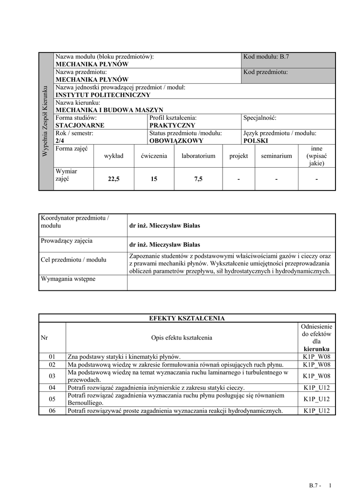 MECHANIKA PŁYNÓW Kod modułu