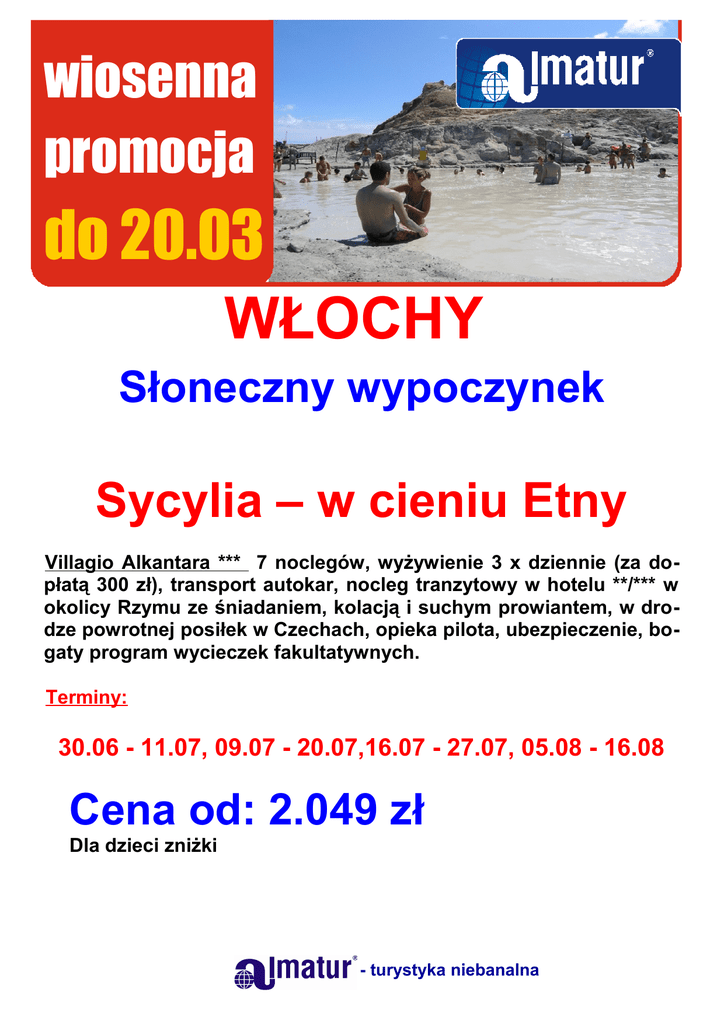 wiosenna promocja do 20.03 WŁOCHY Słoneczny wypoczynek Sycylia – w cieniu Etny Villagio Alkantara *** 7 noclegów, wyżywienie 3 x dziennie (za dopłatą 300 zł), transport autokar, nocleg tranzytowy w hotelu **/*** w okolicy Rzymu ze śniadaniem, kolacją i suchym prowiantem, w drodze powrotnej posiłek w Czechach, opieka pilota, ubezpieczenie, bogaty program wycieczek fakultatywnych. Terminy: 30.06 - 11.07, 09.07 - 20.07,16.07 - 27.07, 05.08 - 16.08 Cena od: 2.049 zł Dla dzieci zniżki - turystyka niebanalna