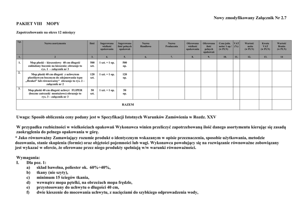 Nowy zmodyfikowany Załącznik Nr 2.7 PAKIET VIII MOPY Zapotrzebowanie na okres 12 miesięcy Lp. Nazwa asortymentu Ilość Sugerowana wielkość opakowania Sugerowana ilość pełnych opakowań Nazwa Handlowa Nazwa Producenta Oferowana wielkość opakowania Oferowana ilość pełnych opakowań 1. 2 3. 4. 5. 6. 7. 8. 9. 1. Mop płaski – kieszeniowy 40 cm długość zakładany bocznie na kieszenie; obrazuje to rys. 1 – załącznik nr 3 500 szt. 1 szt. = 1 op. 500 op. Mop płaski 40 cm długość z uchwytem plastikowym bocznym do zdejmowania typu „Henkel” lub równowaŜny* obrazuje to rys. 2 – załącznik nr 2 120 szt. 1 szt. = 1 op. 120 op. Mop płaski 40 cm długość uchwyt FLIPER (boczne zatrzaski montaŜowe) obrazuje to rys. 3 – załącznik nr 3 50 szt. 1 szt. = 1 op. 50 op. 2. 3. Cena jedn. VAT netto/ 1 op./ (%) (w PLN) 10. 11. Wartość netto (w PLN) Kwota VAT (w PLN) Wartość Brutto (w PLN) 12. 13. 14 RAZEM Uwaga: Sposób obliczenia ceny podany jest w Specyfikacji Istotnych Warunków Zamówienia w Rozdz. XXV W przypadku rozbieŜności w wielkościach opakowań Wykonawca winien przeliczyć zapotrzebowaną ilość danego asortymentu kierując się zasadą zaokrąglenia do pełnego opakowania w górę. * Jako równowaŜny Zamawiający rozumie produkt o identycznym wskazanym w opisie przeznaczenia, sposobie uŜytkowania, metodzie dozowania, stanie skupienia (formie) oraz objętości pojemności lub wagi. Wykonawca powołujący się na rozwiązanie równowaŜne zobowiązany jest wykazać w ofercie, Ŝe oferowane przez niego produkty spełniają w/w warunki równowaŜności. Wymagania: I. Dla poz. 1: a) skład bawełna, poliester ok. 60%÷40%, b) tkany (nie szyty), c) minimum 15 ściegów tkania, d) wewnątrz mopa pętelki, na obrzeŜach mopa frędzle, e) przystosowany do uchwytu o długości 40 cm, f) dwie kieszenie do mocowania uchwytu, z nacięciami do szybkiego odprowadzenia wody, g) temperatura prania 95ºC, h) do czyszczenia wszelkich powierzchni na wilgotno i na mokro. II. Dla poz. 2: a) mop płaski 40 cm, b) przystosowany do uchwytu „Henkel” długości 40 cm, c) uchwyt plastikowy boczny przystosowany do zdejmowania mopa bezdotykowo, d) temperatura prania 95ºC, e) do czyszczenia wszelkich powierzchni na wilgotno i na mokro. III. Dla poz. 3: a) skład bawełna, poliester ok. 60%÷40% b) tkany (nie szyty), c) minimum 11 ściegów tkania, d) wewnątrz mopa pętelki, na obrzeŜach mopa frędzle, e) przystosowany do uchwytu o długości 40 cm, f) 2 taśmy montaŜowe, do zamontowania mopa na uchwycie Fliper, g) temperatura prania 95ºC, h) do czyszczenia wszelkich powierzchni na wilgotno i na mokro. ....................................... .................................................................. (miejscowość, data) (Podpis i pieczątka upowaŜnionego przedstawiciela WYKONAWCY)