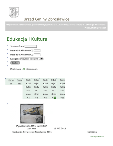 Urząd Gminy Zbrosławice http://www.zbroslawice.pl/Informacje/edukacja_i_kultura/Galeria-zdjec-z-Letniego-FestiwaluPiose/st:10/printpdf Edukacja i Kultura Szukana fraza Data od (RRRR-MM-DD) Data do (RRRR-MM-DD) Kategorie wszystkie kategorie ... ▼ Szukaj Znaleziono 104 wiadomości. Pierws Poprze Eduk Eduk Eduk Eduk Eduk za dnia acja i acja i acja i acja i acja i Kultu Kultu Kultu Kultu Kultu ra - ra - ra - ra - ra - stron stron stron stron stron a7 a8 a9 a a 11 10 11 PAŹ 2011 Spotkania Artystyczne Zbrosławice 2011 kategoria: Edukacja i Kultura Katalog poplenerowy dostępny jest w Urzędzie Gminy, w sekretariacie (pokój nr 6, I piętro). 28 WRZ 2011 PIKNIK RODZINNY "WŚRÓD SĄSIADÓW" kategoria: Edukacja i Kultura W dniu 24.09.2011 r. w Kamieńcu odbył się Piknik Rodzinny „Wśród Sąsiadów", zorganizowany przez GOPS w Zbrosławicach z/s w Kamieńcu. Piknik był współfinansowany ze środków Unii Europejskiej i wkładu własnego, ogromne zaangażowanie w przygotowanie imprezy włożyli mieszkańcy ulicy Karola Miarki ze Zbrosławic- uczestnicy projektu „Otwarte Drzwi- aktywizacja mieszkańców gminy Zbrosławice", Program Aktywności 15 WRZ 2011 Gitara i śpiew kategoria: Edukacja i Kultura Mała akademia gitary i śpiewu ogłasza nabór na zajęcia indywidualne w zakresie: gitara klasyczna, elektryczna, basowa(wszystkie style) śpiew rozrywkowy, klasyczny itp. brak limitu wiekowego zajęcia prowadzi Michał Malicki (muzyk znany m.in. z zespołu „Wawele", Orkiestry Miliana) Zapisy : Zbrosławice – 20 września godz. 16:00 – Centrum Usług Publicznych, ul. Oświęcimska (obok urzędu gminy) Kamieniec- 21 września 24 LIP 2011 Konkurs wakacyjny na plakat promujący Górny Śląsk 18 LIP 2011 Bezpłatne szkolenia dla rolników kategoria: Edukacja i Kultura W związku z realizacją projektu pn. "Poza rolnictwem" współfinansowanego ze środków Unii Europejskiej , zapraszamy wszystkie chętne osoby do wzięcia udziału w bezpłatnych szkoleniach tj: Kurs prawa jazdy kat. E do C -Kurs przewozu rzeczy -Kurs CRM i nawigacji -Coaching indywidualny Pośrednictwo pracy 29 CZE 2011 INDUSTRIADA - Zabytkowa Stacja Wodociągowa "Zawada" w Karchowicach kategoria: Edukacja i Kultura 11 czerwca br. w ramach drugiej już INDUSTRIADY – Święta Szlaku Zabytków Techniki województwa śląskiego - również Zabytkowa Stacja Wodociągowa ZAWADA w Karchowicach zaprosiła wszystkich chętnych (a było ich w tym roku prawie 870) do uczestnictwa w wielu pokazach, eksperymentach i zabawach z techniką. Młodsi mieli okazję postrzelać z hydraulicznych armat, sprawdzić swoje wędkarskie umiejętności łowiąc „ryby" w 23 MAR 2011 KONKURS FOT. „Szlak Zabytków Techniki Województwa Śląskiego w obiektywie” kategoria: Edukacja i Kultura Muzeum Miejskie „SZTYGARKA" w Dąbrowie Górniczej, z okazji wpisania podziemnej trasy turystycznej Kopalnia Ćwiczebna Muzeum Miejskiego „Sztygarka" na Szlak Zabytków Techniki Województwa Śląskiego organizuje konkurs fotograficzny. Tematem konkursu jest „Szlak Zabytków Techniki Województwa Śląskiego w obiektywie". Temat rozumiany jest jako subiektywne, indywidualne, osobiste spojrzenie na jeden lub kilka z dowolnych 36 obiektów, 23 MAR 2011 Polska Prezydencja w Unii Europejskiej – WYKREUJ POWIAT kategoria: Edukacja i Kultura Poseł na Sejm RP Tomasz Głogowski zaprasza do wzięcia udziału w konkursie na fotoreportaż, organizowanym pod patronatem Przewodniczącego Parlamentu Europejskiego prof. Jerzego Buzka. Hasłem przyświecającym rywalizacji jest zdanie: Polska prezydencja w Unii Europejskiej - Wykreuj powiat. 16 MAR 2011 Język francuski w kamienieckiej podstawówce kategoria: Edukacja i Kultura Język francuski w kamienieckiej podstawówce Pod koniec roku szkolnego 2009/2010 Szkoła Podstawowa w Kamieńcu poprzez Kuratorium Oświaty w Katowicach została wytypowana do ogólnopolskiego projektu edukacyjnego www.mowimypofrancusku.pl realizowanego w ramach programu Akademia Orange. Zadaniem projektu jest zachęcenie dzieci do nauki języka francuskiego oraz pokazanie, w jaki sposób można wykorzystać nowe technologie w celach 08 MAR 2011 kategoria: Stypendia w dziedzinie kultury 2011 rok Edukacja i Kultura ZARZĄD WOJEWÓDZTWA ŚLĄSKIEGO zaprasza osoby zajmujące się twórczością artystyczną, upowszechnianiem i ochroną dóbr kultury do składania wniosków o stypendia w dziedzinie kultury w I edycji 2011 roku Pierws Poprze Eduk Eduk Eduk Eduk Eduk za dnia acja i acja i acja i acja i acja i Kultu Kultu Kultu Kultu Kultu ra - ra - ra - ra - ra - stron stron stron stron stron a7 a8 a9 a a 11 10