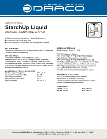 ULOTKA INFORMACYJNA StarchUp Liquid KROCHMAL SYNTETYCZNY W PŁYNIE Nadaje pożądaną sztywność i gładkość tkaninom Zawiera rozjaśniacze optyczne Przeznaczony do wszystkich rodzajów pralnic i pralek ZASTOSOWANIE Produkt płynny przeznaczony do krochmalenia bielizny pościelowej i stołowej, koszul oraz fartuchów. SPOSÓB UŻYCIA Dozowanie w zależności od pożądanego efektu. Zalecenia ogólne: do 50 g/1 kg suchego prania w zależności od pożądanego efektu. Dozować do ostatniej kąpieli płuczącej. Szczegółowe parametry dozowania ustala każdorazowo pracownik firmy DRACO na podstawie warunków technicznych pralni, stopnia zabrudzenia i właściwości tkanin. WŁAŚCIWOŚCI FIZYKO - CHEMICZNE Gęstość przy 20˚C, g/cm³ pH produktu (w stężeniu 1%) Zdolność pianotwórcza Temperatura zamarzania Magazynowanie 1.00 ± 0.05 8 ± 0.5 Niska < 0˚C 5˚C do 35˚C ŚRODKI OSTROŻNOŚCI Skład: polioctan winylu 15 - 30%. P102: Chronić przed dziećmi. P301+P330+P331: W PRZYPADKU POŁKNIĘCIA: Wypłukać usta. NIE wywoływać wymiotów. P305+P351+P338: W PRZYPADKU DOSTANIA SIĘ DO OCZU: Ostrożnie płukać wodą przez kilka minut. Wyjąć soczewki kontaktowe, jeżeli są i można je łatwo usunąć. P312: W przypadku złego samopoczucia skontaktować się z OŚRODKIEM ZATRUĆ lub lekarzem. EUH210: Karta charakterystyki dostępna na żądanie. INFORMACJE DODATKOWE Produkt do zastosowania profesjonalnego. Nie stosować bezpośrednio na tkaniny. Zawarte w produkcie związki powierzchniowo czynne spełniają kryteria biodegradowalności OPAKOWANIE Kanister: 20 kg Beczka: 200 kg kod: 6360020 kod: 6360200 Producent: DRACO-BIS, ul. Młodzieżowa 29, 62-510 Konin, Polska, tel. +48 62 767 23 55, fax +48 62 767 23 85, e-mail: [email protected], www.draco-bis.pl